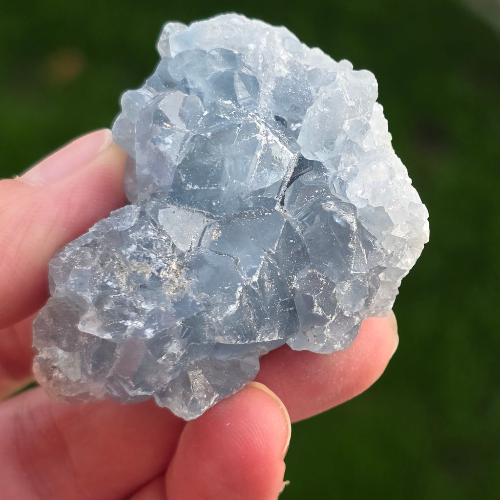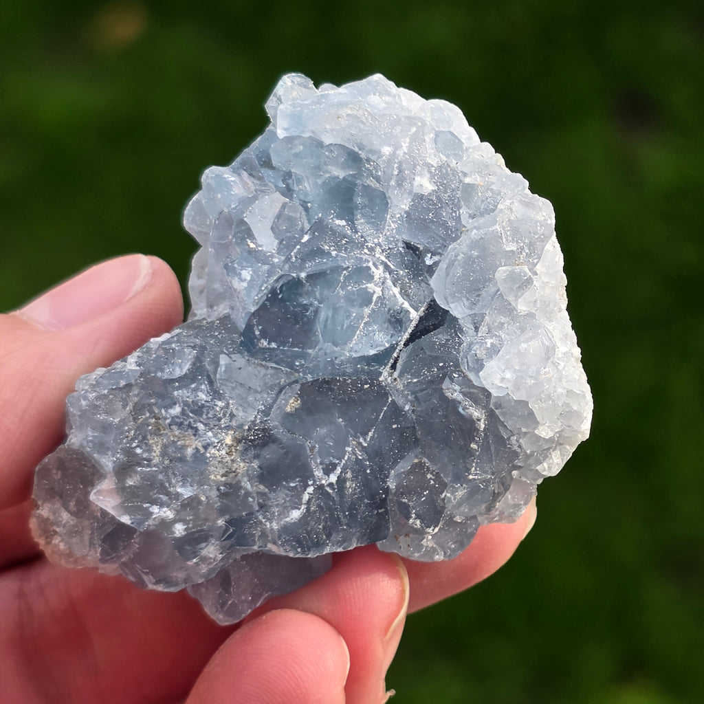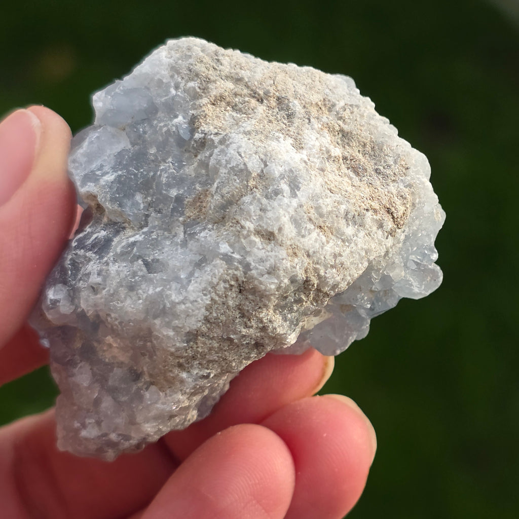 Celestit ist ein Halbedelstein von blauer oder farbloser Farbe, der aus Strontiumsulfat besteht. Er hat beruhigende und entspannende Eigenschaften und wird oft in der Meditation und in spirituellen Praktiken verwendet, um inneren Frieden und geistige Klarheit zu fördern. Celestit wird mit dem Halschakra assoziiert und kann bei klarer Kommunikation und dem Ausdruck von Emotionen helfen. Außerdem soll er Kreativität, Intuition und psychische Fähigkeiten verbessern.