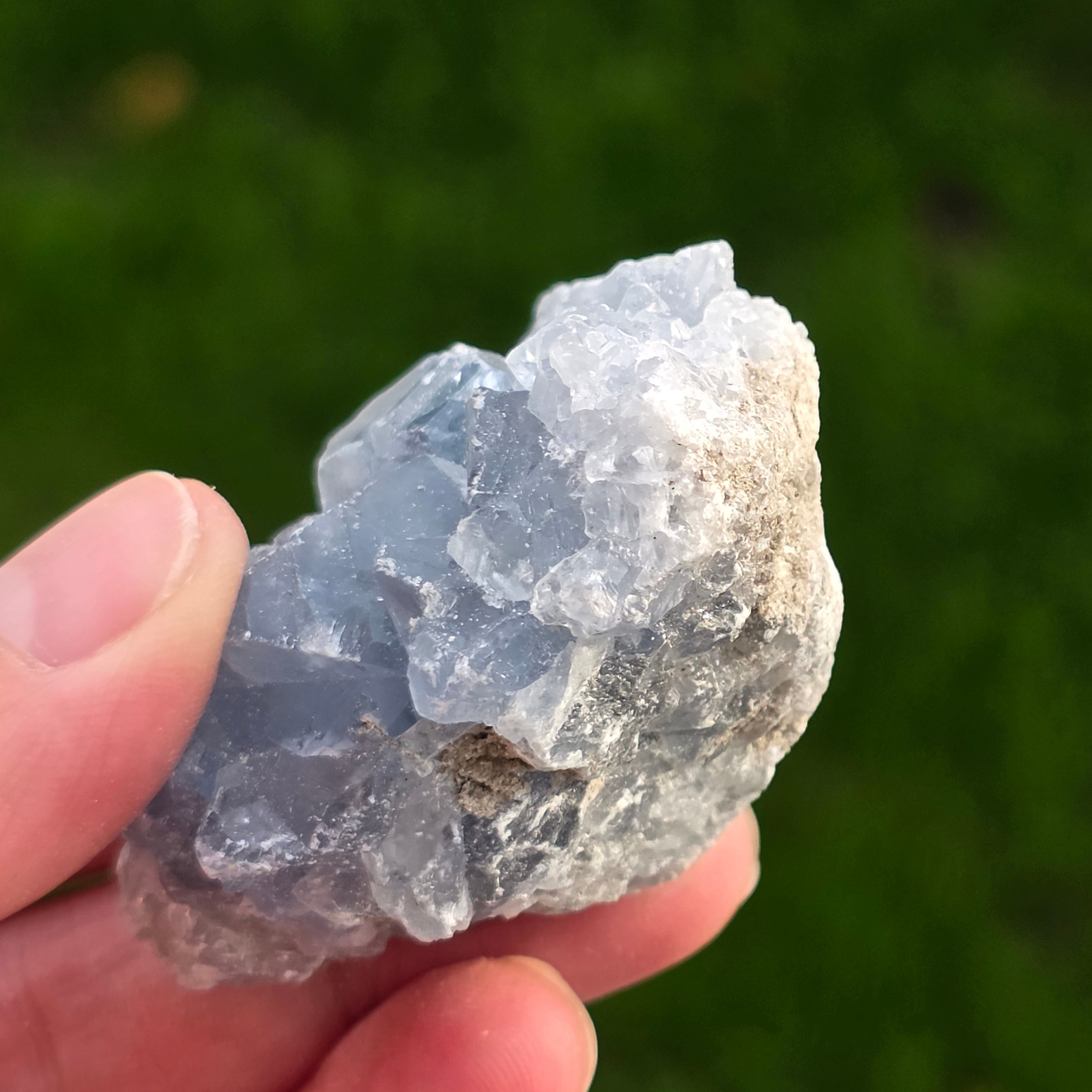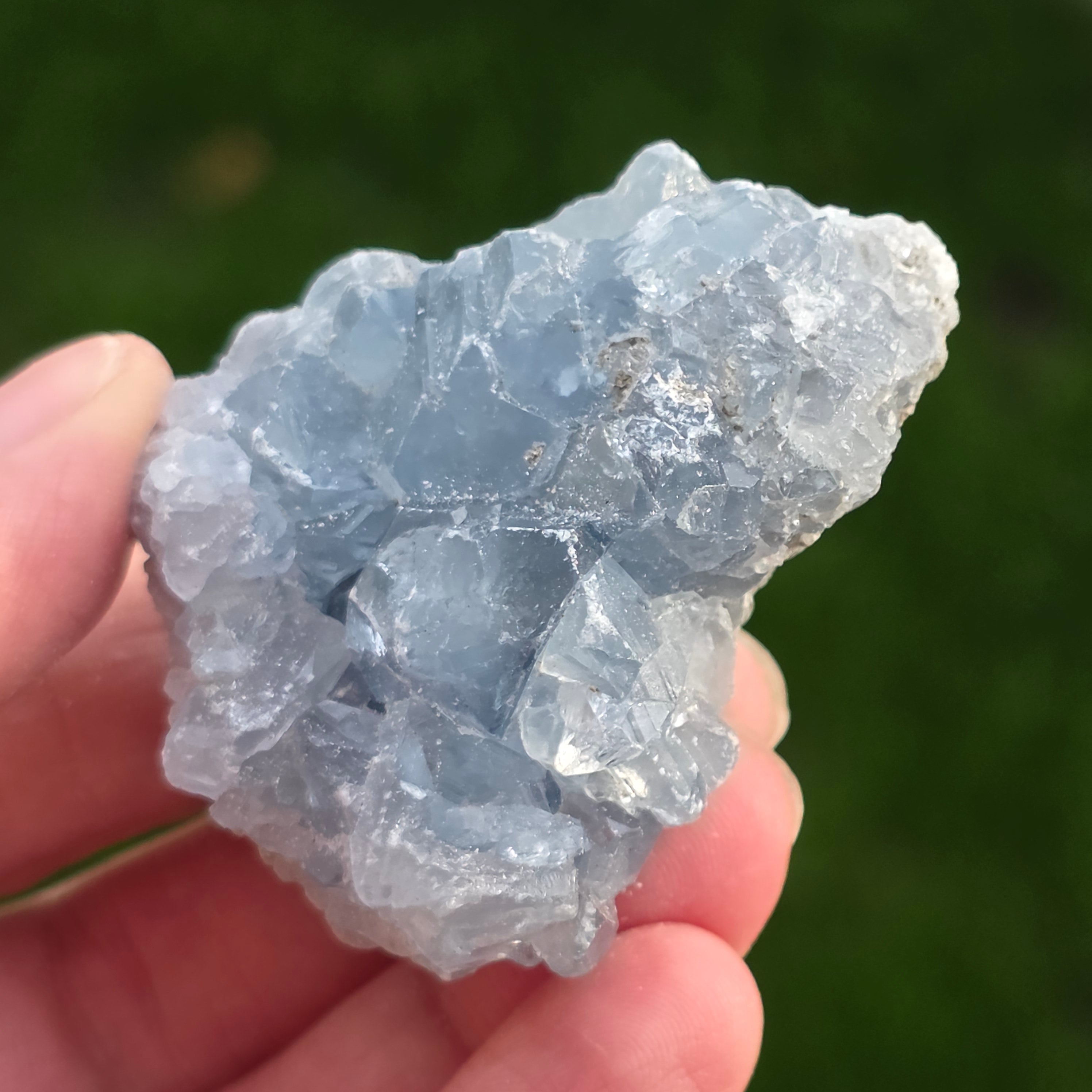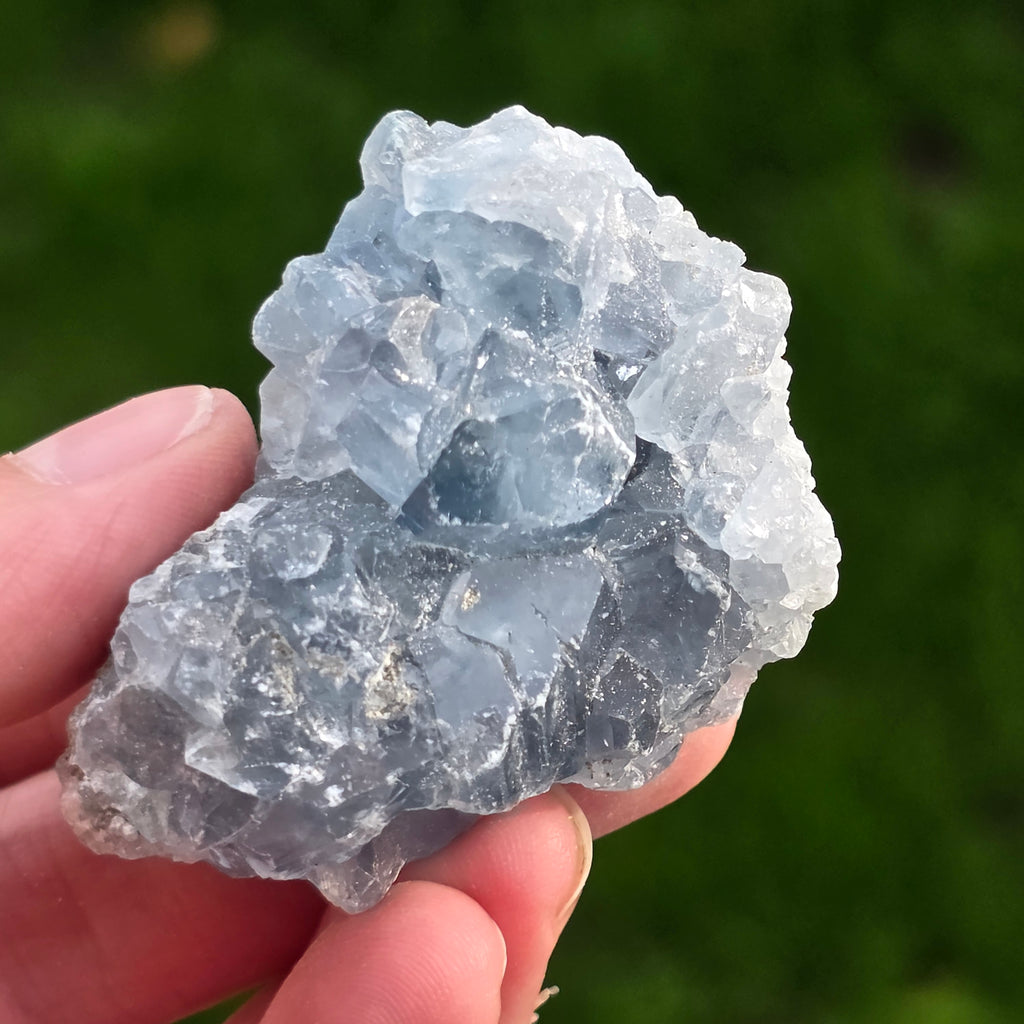 Celestit ist ein Halbedelstein von blauer oder farbloser Farbe, der aus Strontiumsulfat besteht. Er hat beruhigende und entspannende Eigenschaften und wird oft in der Meditation und in spirituellen Praktiken verwendet, um inneren Frieden und geistige Klarheit zu fördern. Celestit wird mit dem Halschakra assoziiert und kann bei klarer Kommunikation und dem Ausdruck von Emotionen helfen. Außerdem soll er Kreativität, Intuition und psychische Fähigkeiten verbessern.