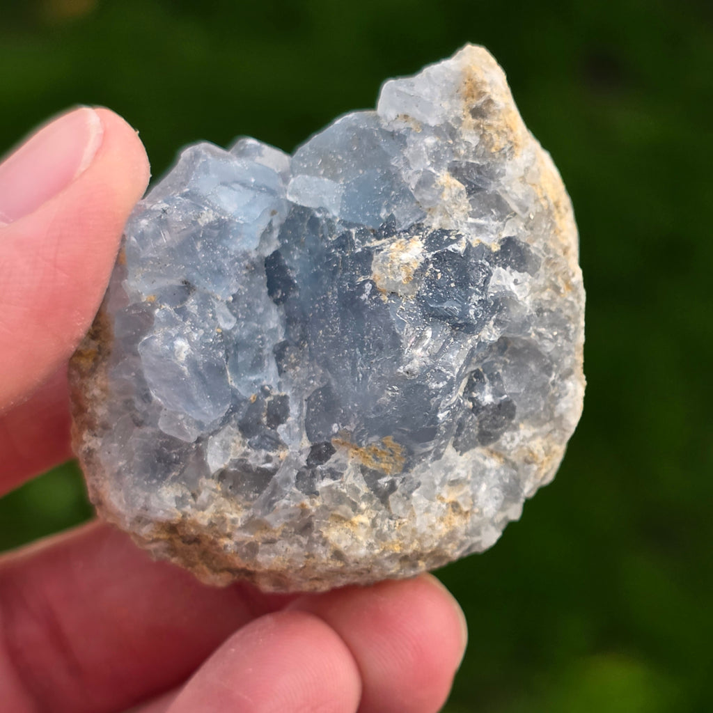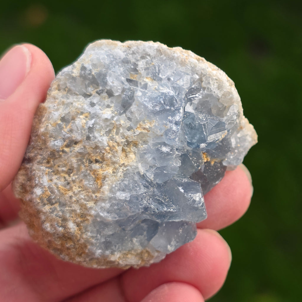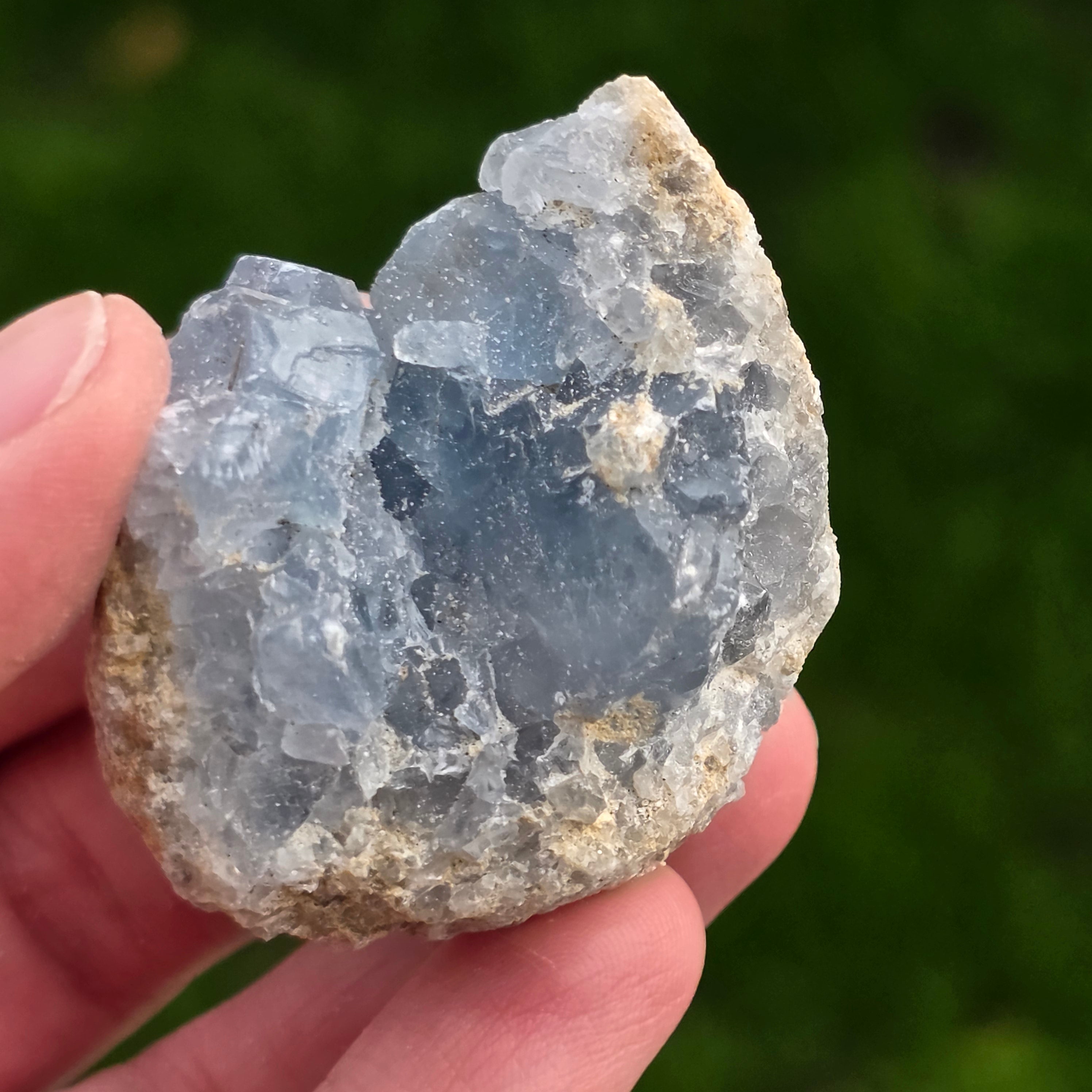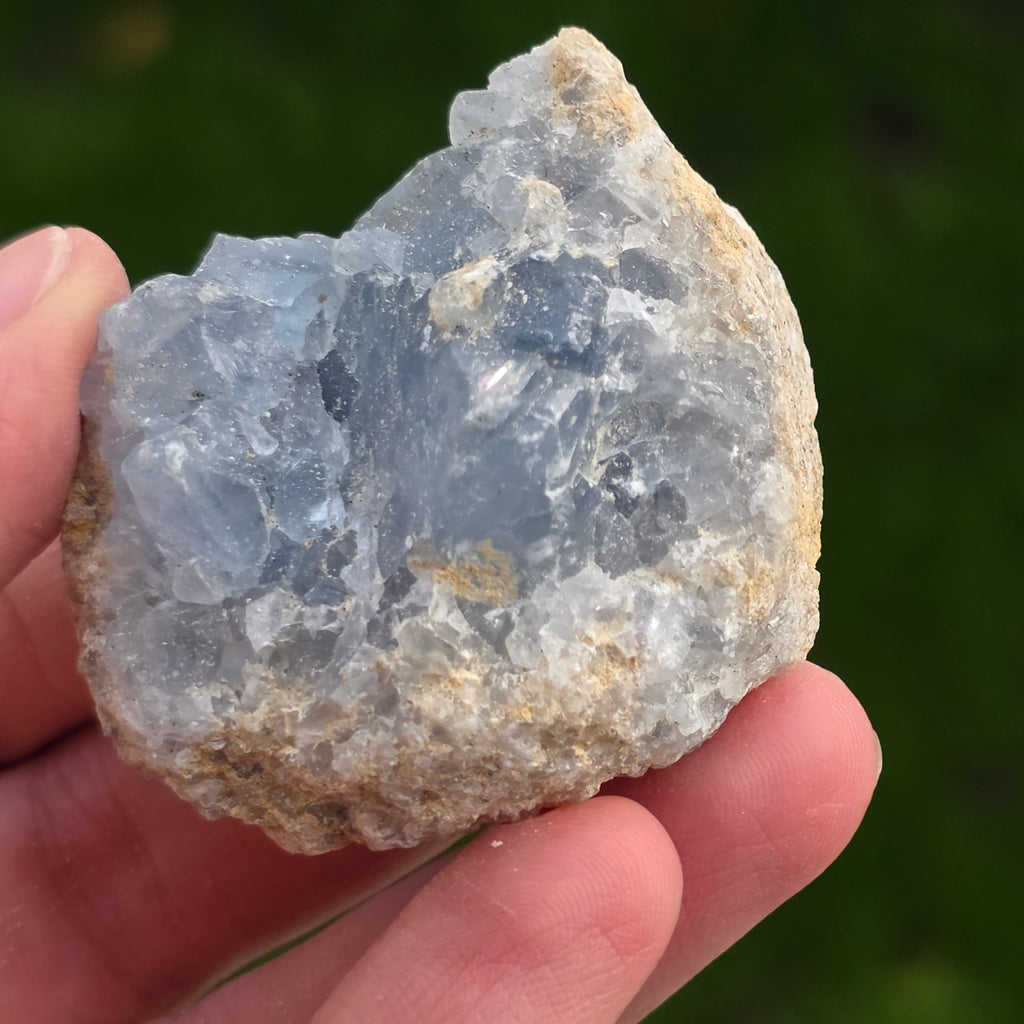 Celestit ist ein Halbedelstein von blauer oder farbloser Farbe, der aus Strontiumsulfat besteht. Er hat beruhigende und entspannende Eigenschaften und wird oft in der Meditation und in spirituellen Praktiken verwendet, um inneren Frieden und geistige Klarheit zu fördern. Celestit wird mit dem Halschakra assoziiert und kann bei klarer Kommunikation und dem Ausdruck von Emotionen helfen. Außerdem soll er Kreativität, Intuition und psychische Fähigkeiten verbessern.