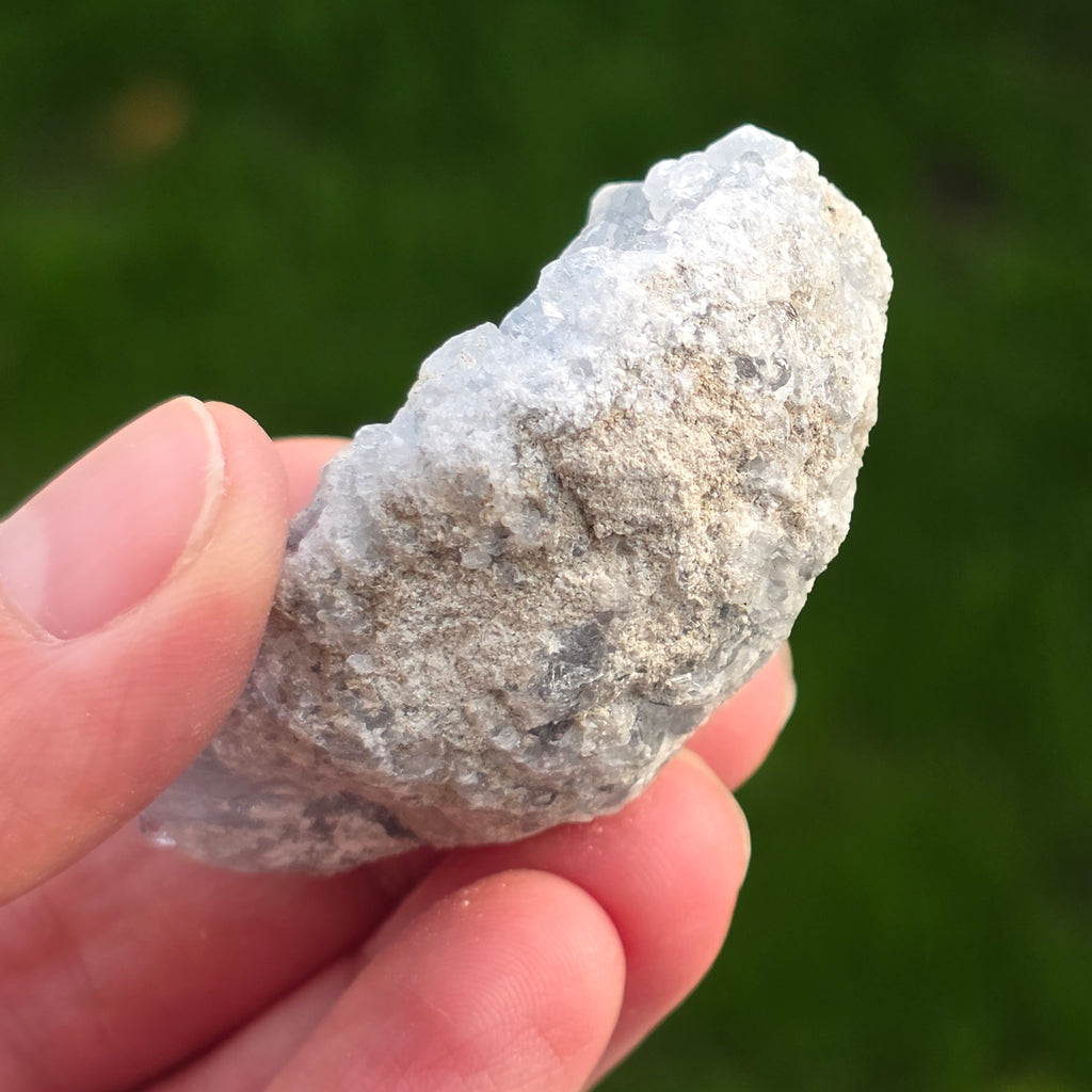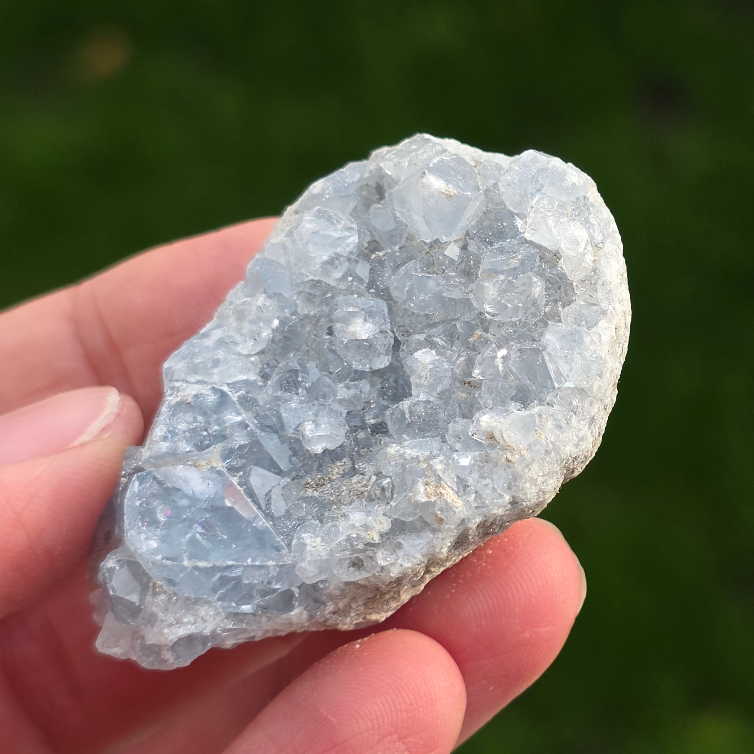 Celestit ist ein Halbedelstein von blauer oder farbloser Farbe, der aus Strontiumsulfat besteht. Er hat beruhigende und entspannende Eigenschaften und wird oft in der Meditation und in spirituellen Praktiken verwendet, um inneren Frieden und geistige Klarheit zu fördern. Celestit wird mit dem Halschakra assoziiert und kann bei klarer Kommunikation und dem Ausdruck von Emotionen helfen. Außerdem soll er Kreativität, Intuition und psychische Fähigkeiten verbessern.