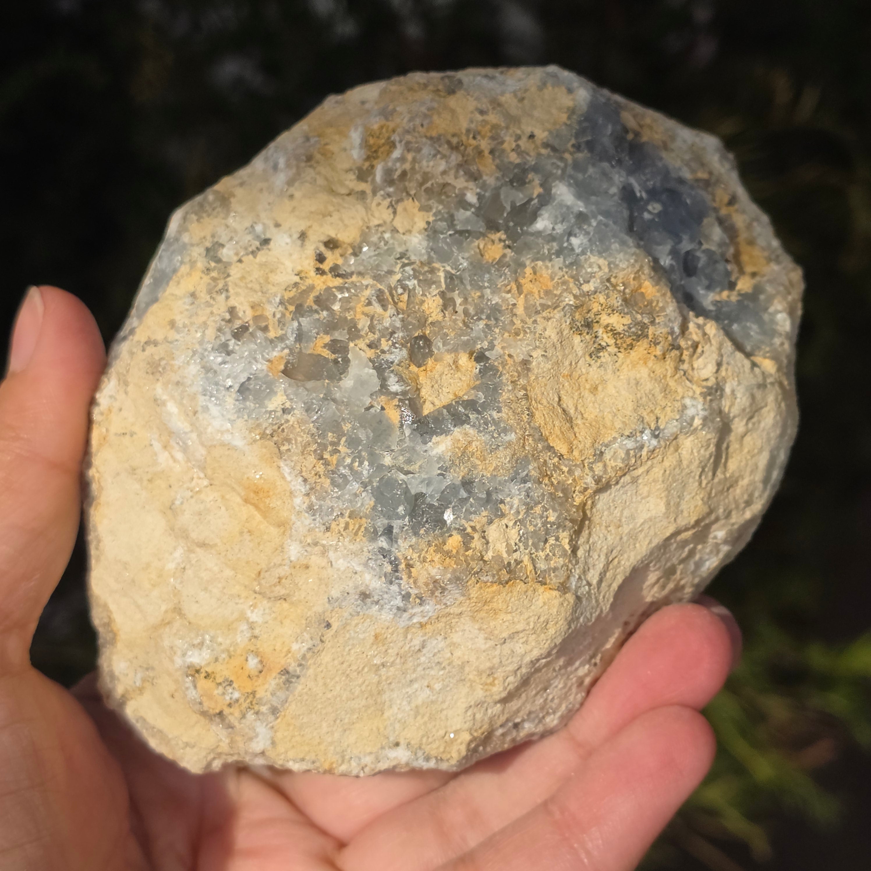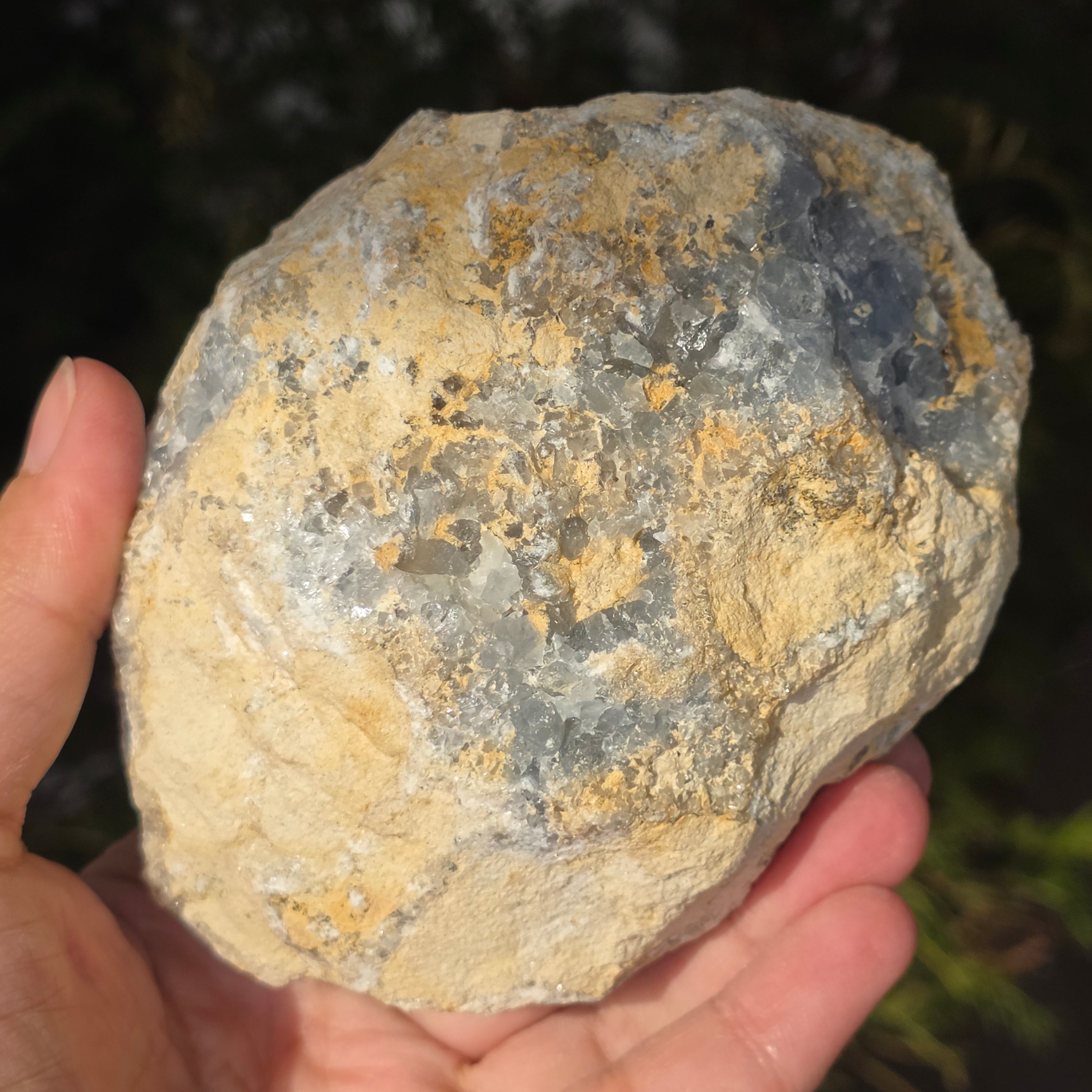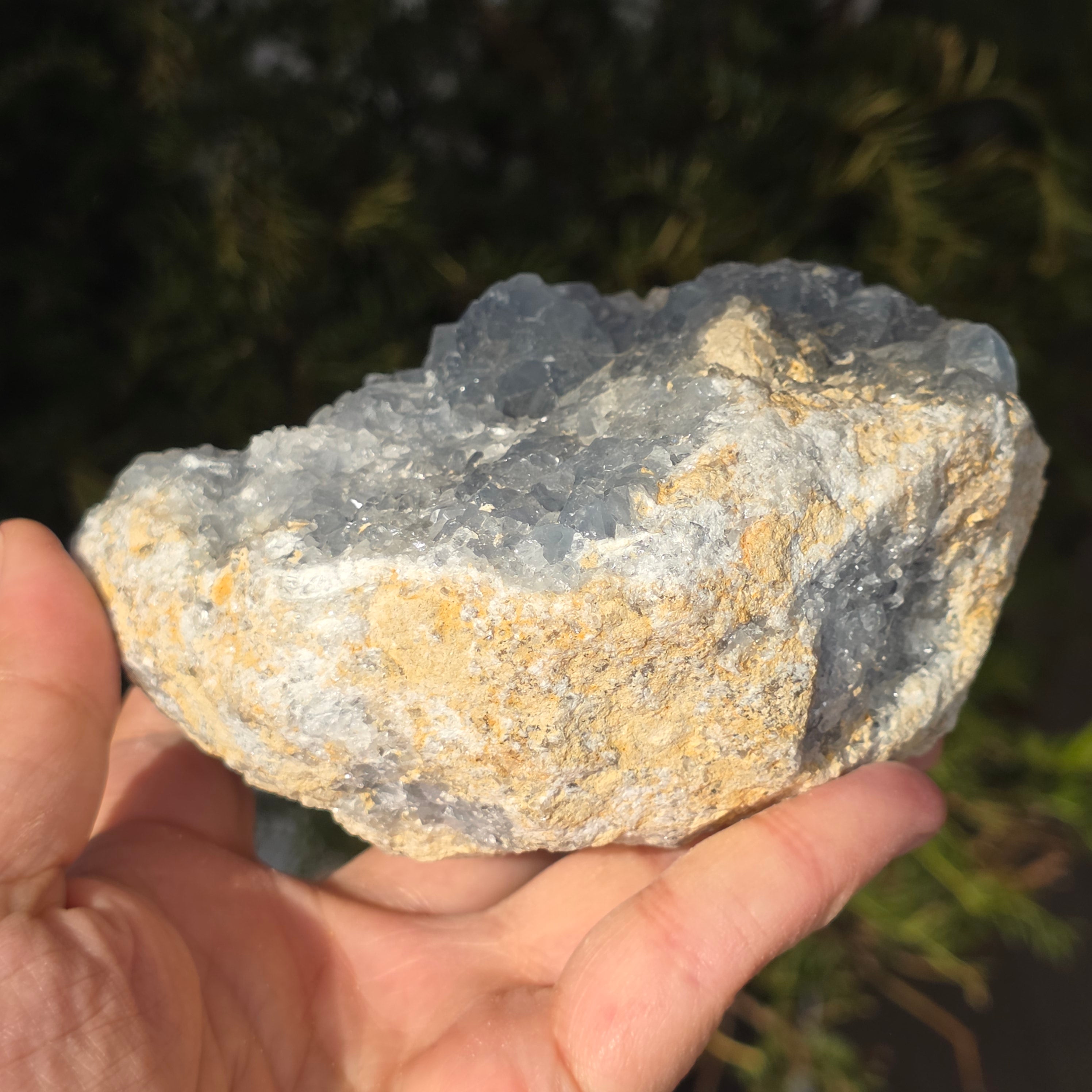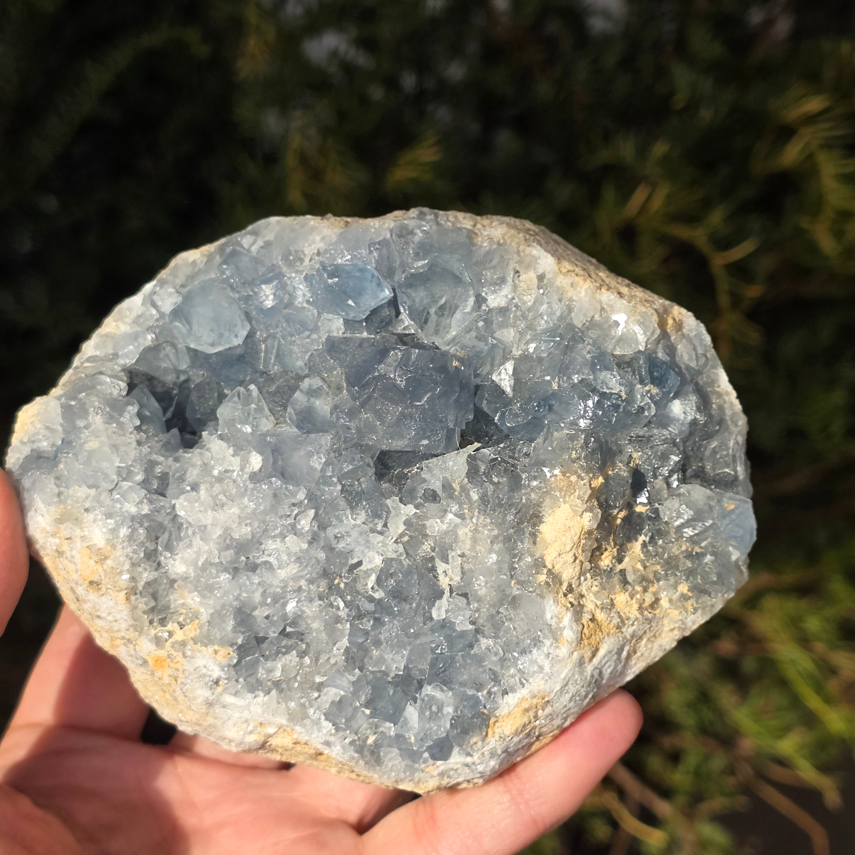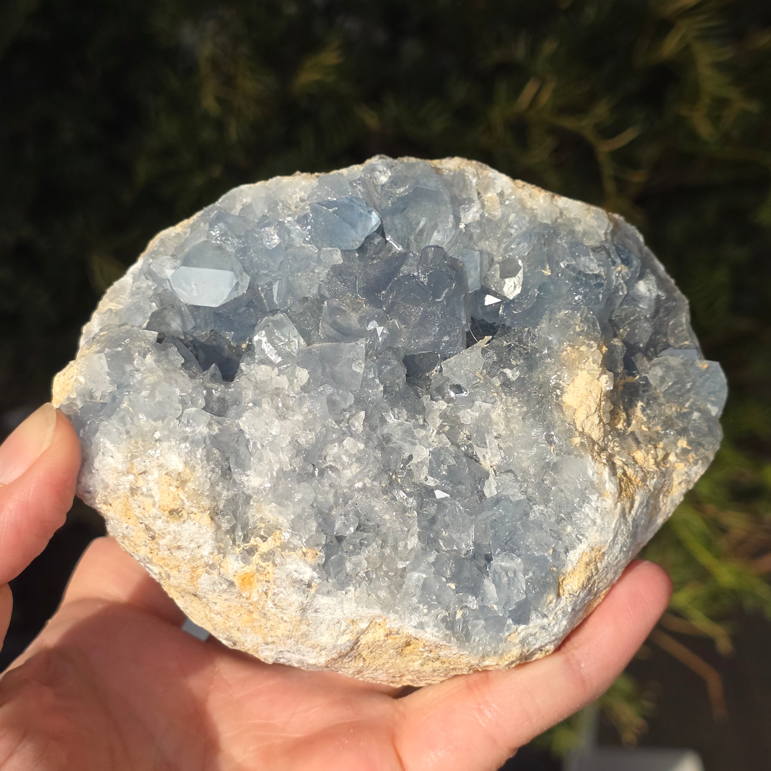 Celestite ist ein halbedel Stein von blauer oder farbloser Farbe, bestehend aus Strontiumsulfat. Sie besitzt beruhigende und entspannende Eigenschaften und wird oft in Meditation und spirituellen Praktiken eingesetzt, um inneren Frieden und geistige Klarheit zu fördern. Celestite ist mit dem Kehlchakra verbunden und kann bei klarer Kommunikation und dem Ausdruck von Emotionen helfen. Es wird auch angenommen, dass es Kreativität, Intuition und übersinnliche Fähigkeiten verbessert.
