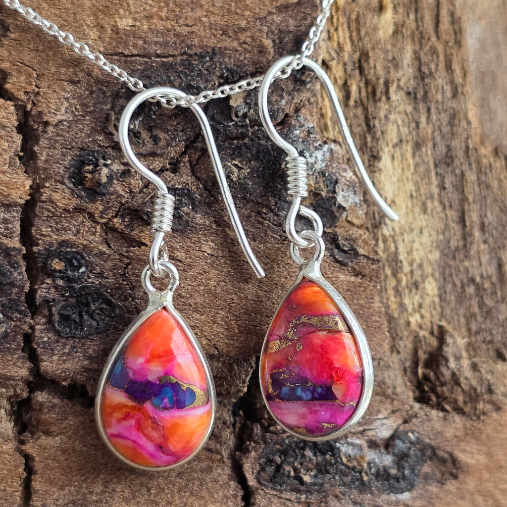 Acești cercei din argint 925 aduc o explozie de culoare și energie pozitivă, datorită pietrelor de Pink Dahlia Copper Turquoise, un amestec spectaculos de nuanțe roz-magenta, portocalii și albastre, străbătute de vene fine de cupru natural.