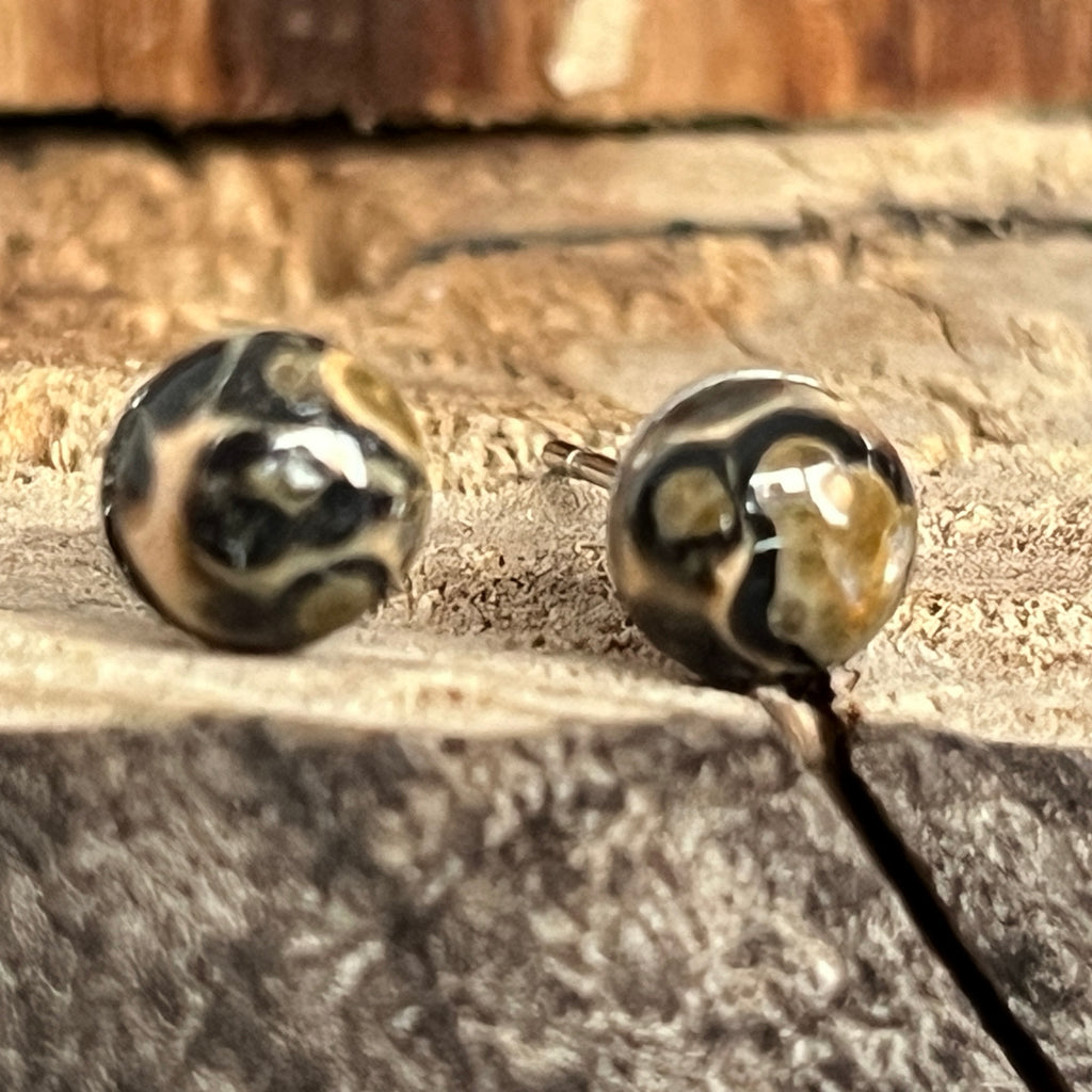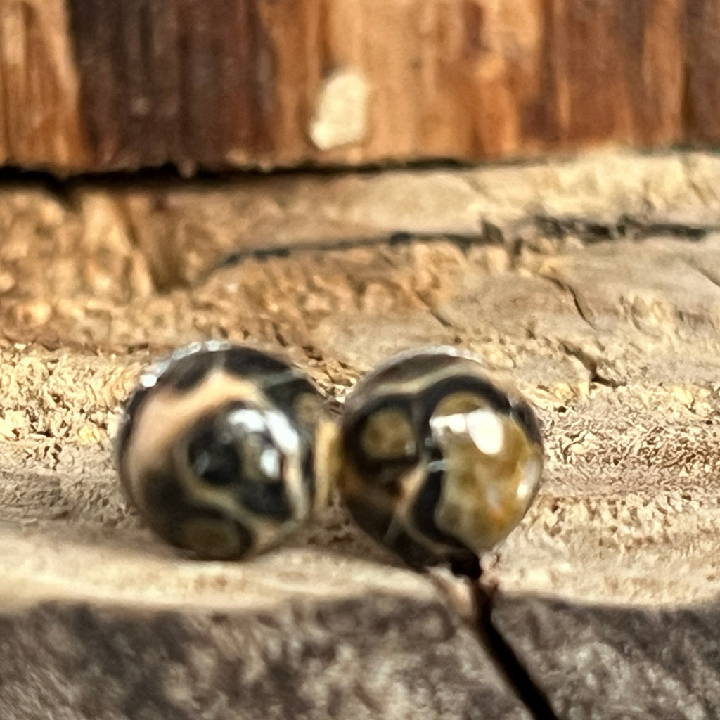 Acești cercei stud din jasp leopard natural sunt o celebrare a forței și a vitalității pământului. Fiecare piatră poartă un desen unic, asemenea amprentelor naturii — un amestec de nuanțe calde și pete întunecate care evocă grația și puterea leopardului.