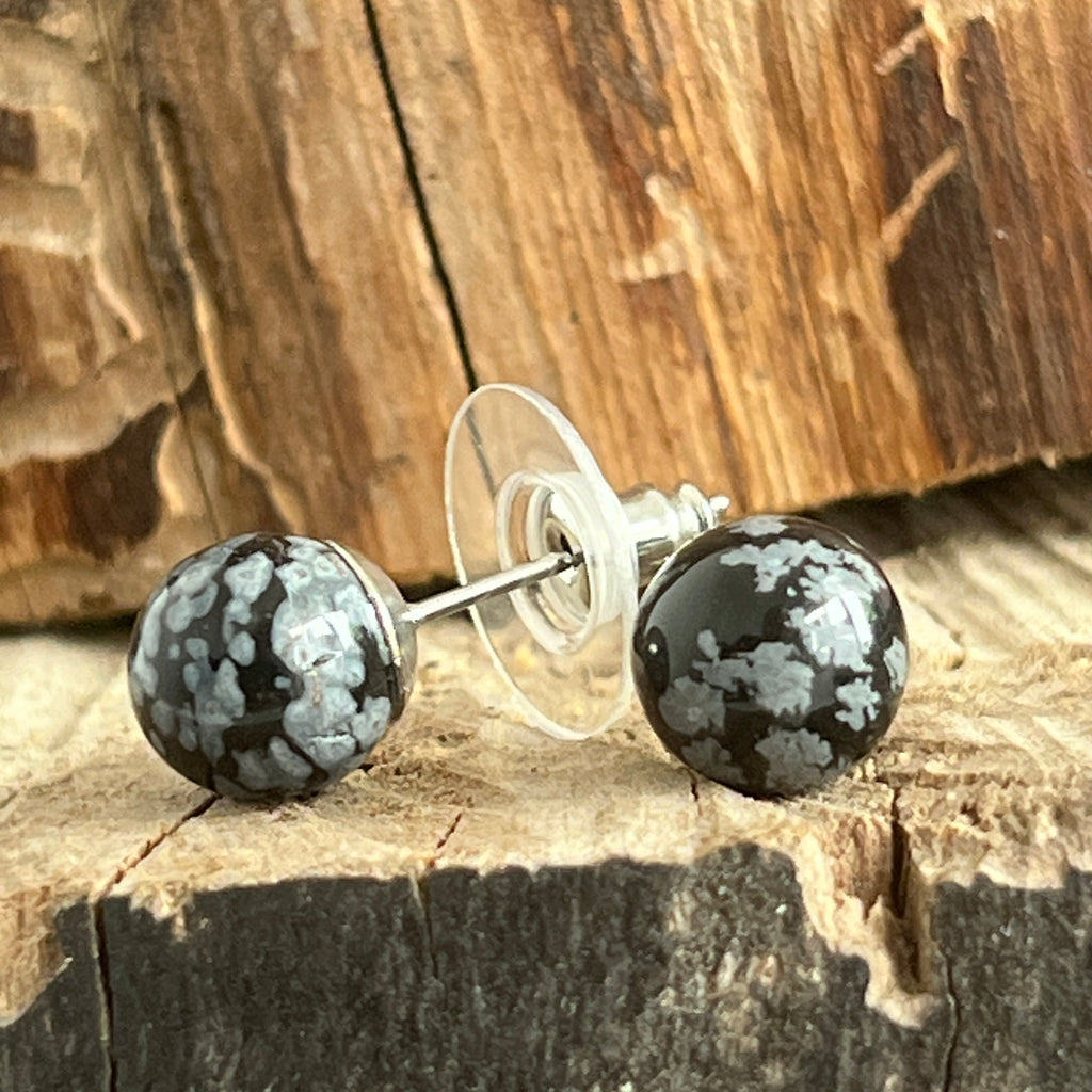 Acești cercei stud din obsidian fulgi de zăpadă sunt o invitație la liniște și centrare. Nuanțele lor contrastante, negru profund cu pete delicate albe, amintesc de cerul de iarnă presărat cu primele ninsori.