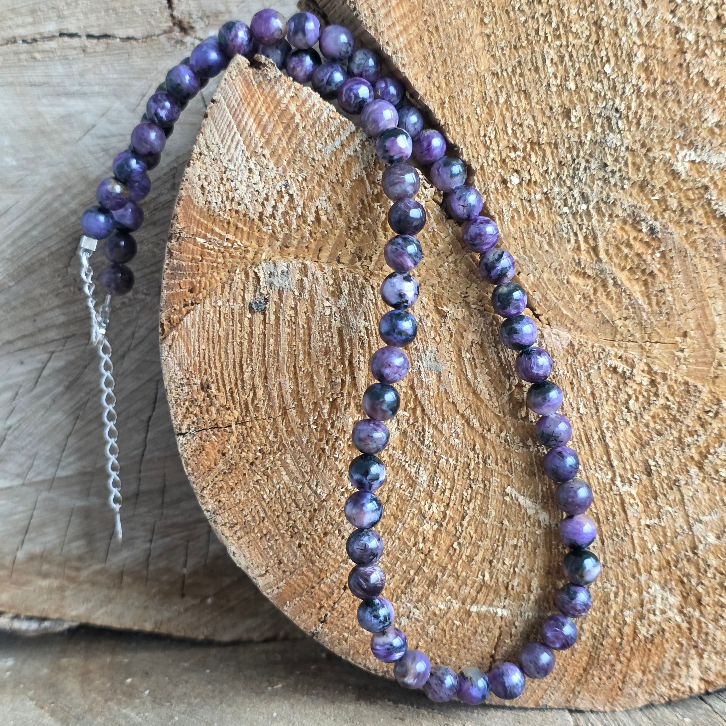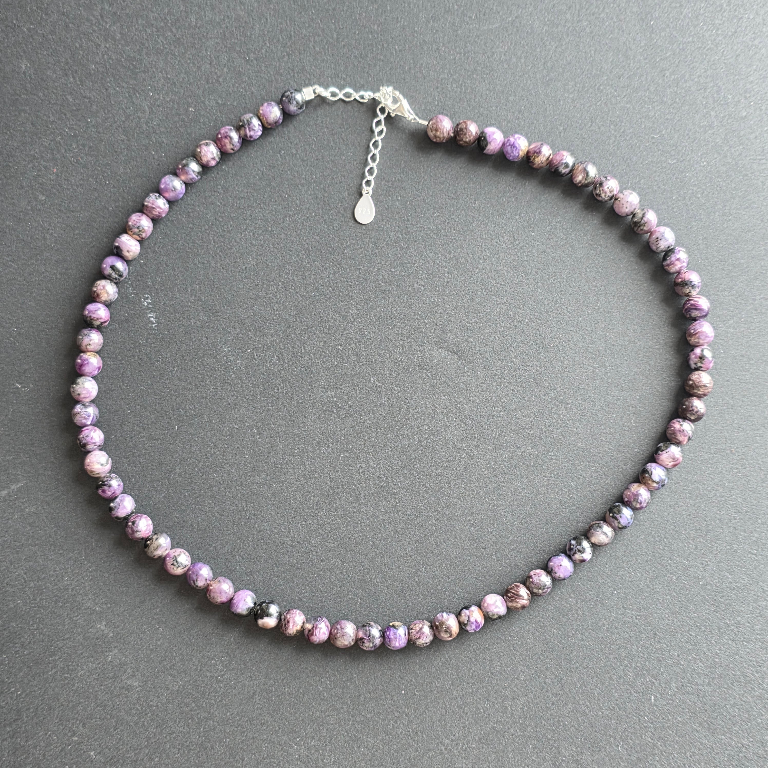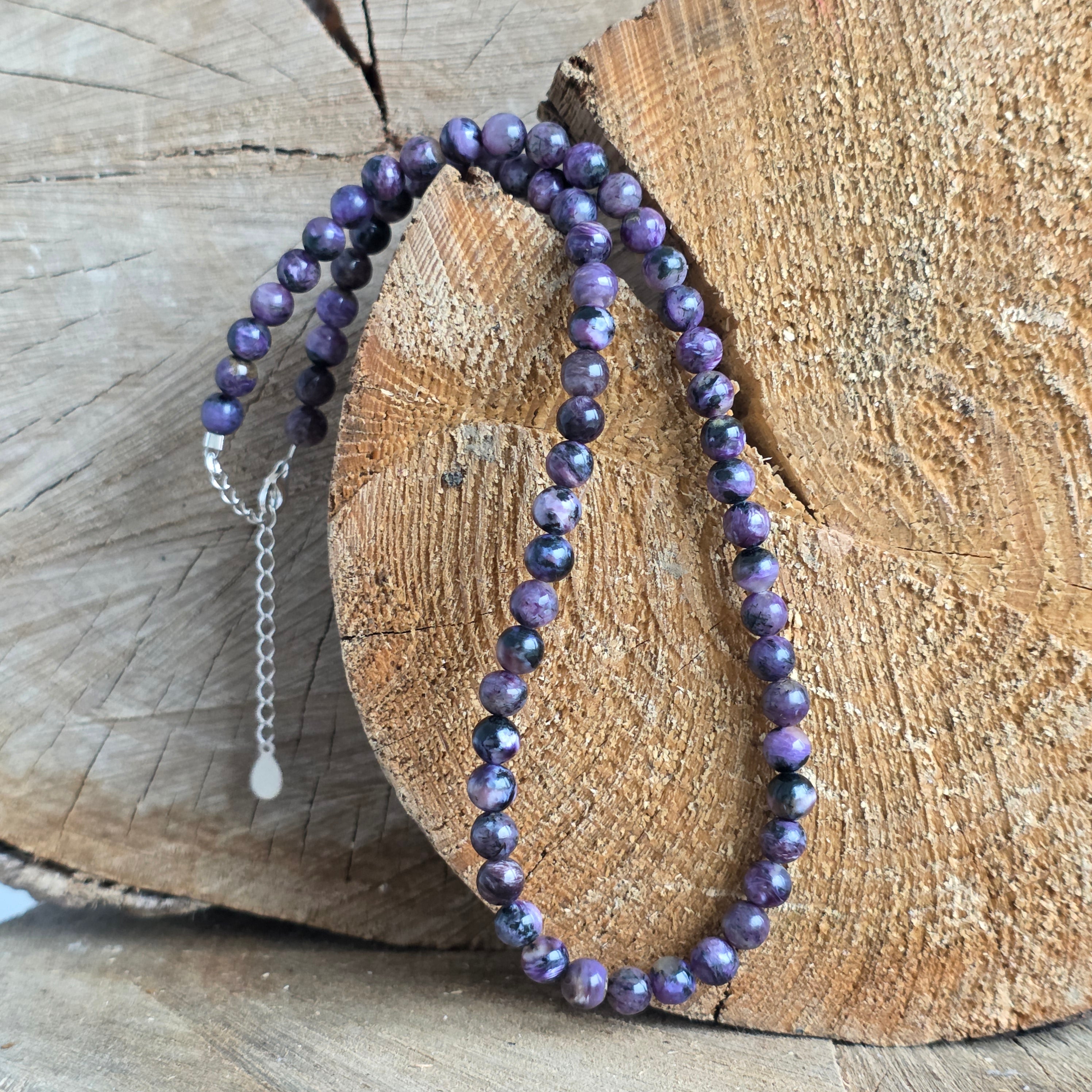 Eine Kette mit ruhiger und tiefer Präsenz, gefertigt aus6 mm Charoit-Perlen, deren Schattierungen in Lila, Violett und milchigem Weiß ineinander zu fließen scheinen, wie eine innere Landschaft. Jeder Stein trägt ein einzigartiges Muster, wie ein Abdruck von Transformation und tiefem Verständnis.