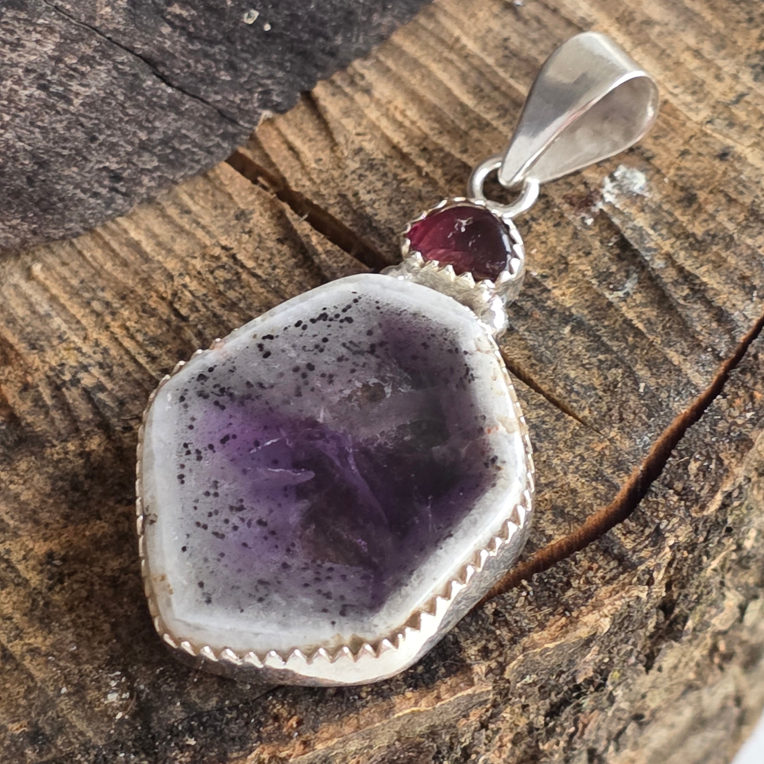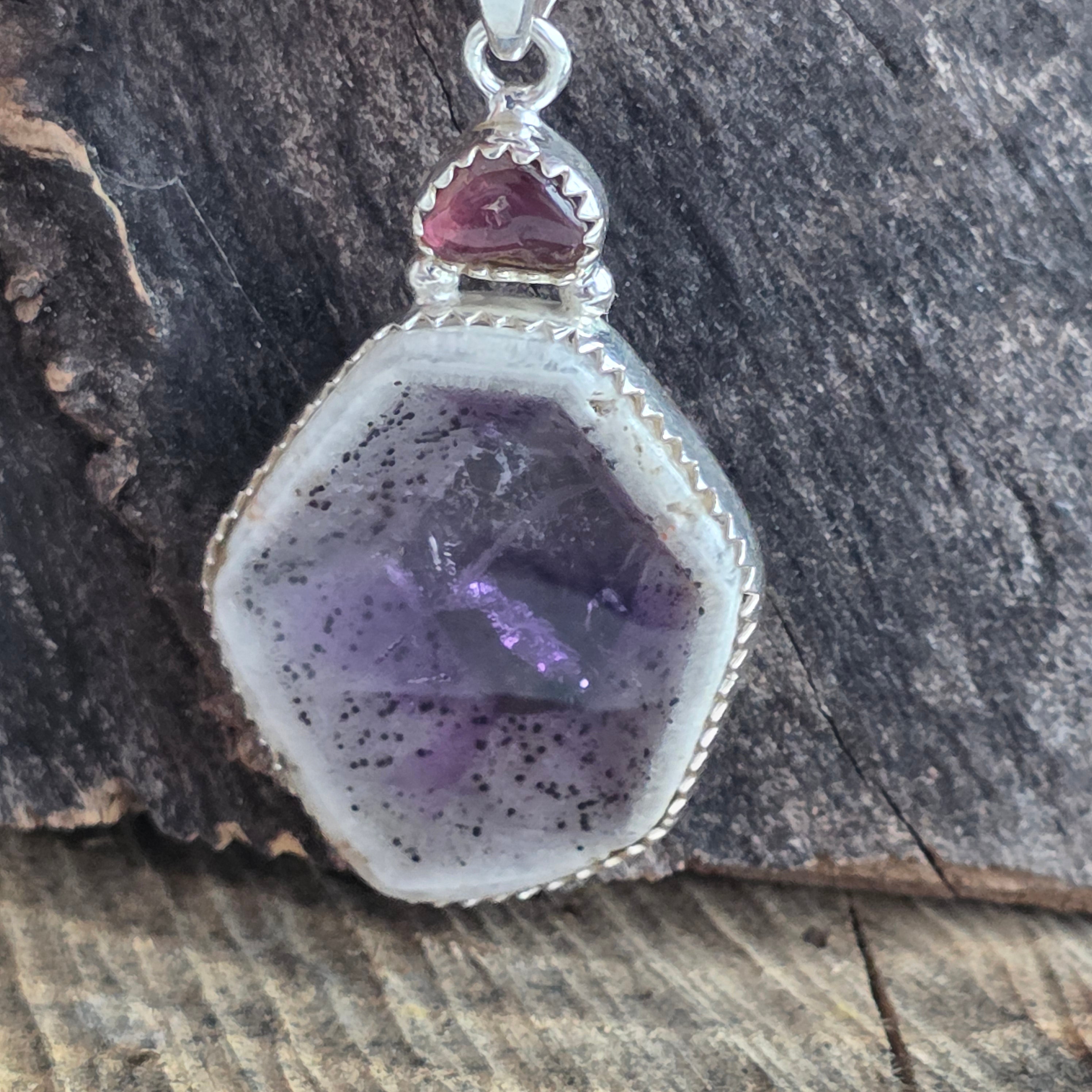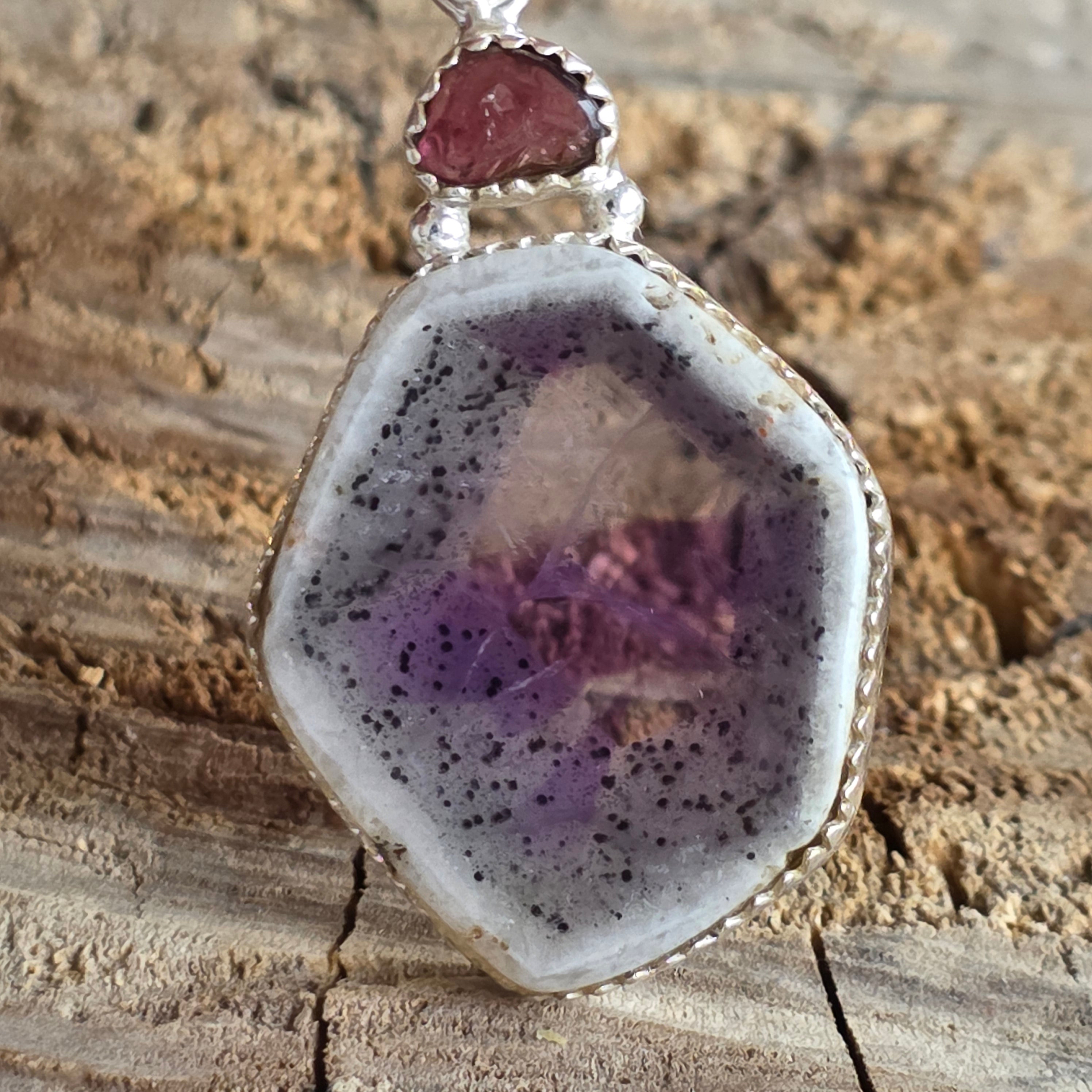 Dieser Silberanhänger kombiniert harmonisch zwei natürliche Steine – Chevron-Amethyst und rosa Turmalin – zu einem einzigartigen Stück mit einem eleganten Kontrast zwischen Violett- und Rosatönen.