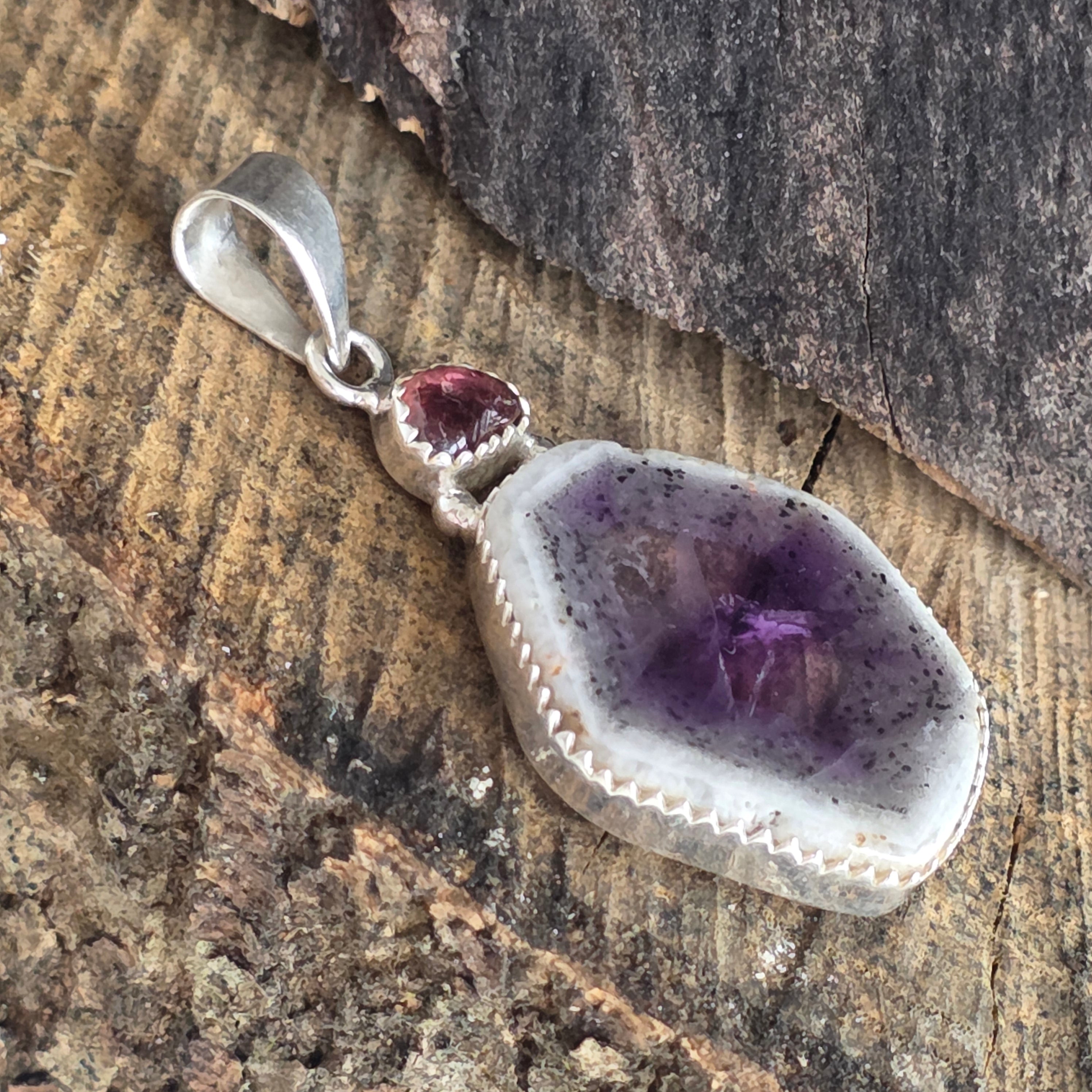 Chevron-Amethyst- und rosa Turmalin-Silberanhänger | Modell 1