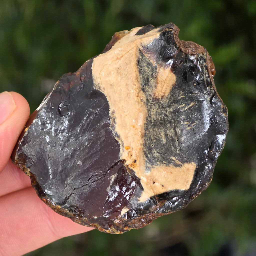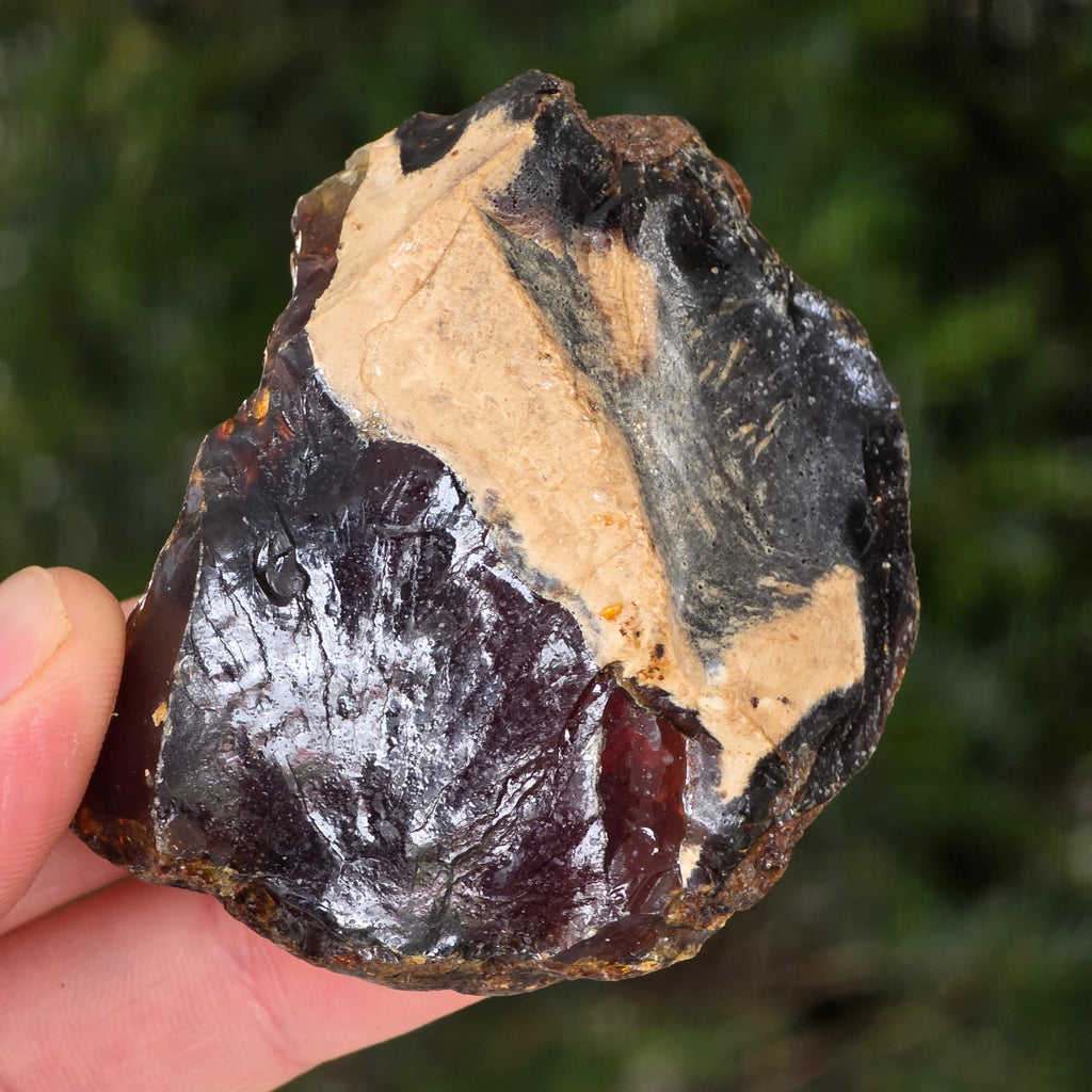 Specimen natural de chihlimbar fosil brut, provenit din regiunea Sumatra, Indonezia – una dintre puținele surse active de chihlimbar din Asia de Sud-Est. Această zonă tropicală este cunoscută pentru solurile sale bogate în sedimente organice și activitate geologică intensă, condiții ideale pentru formarea chihlimbarului.