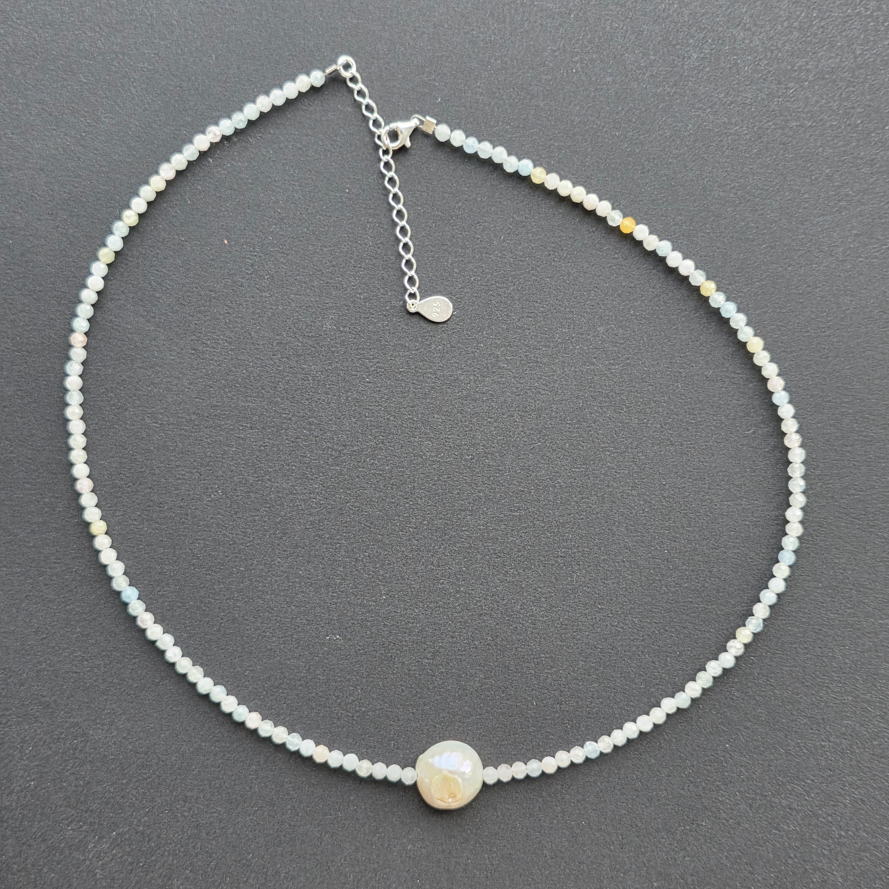 Materiale: acvamarin fatetat 3 mm, beril fatetat 3 mm, perla accent 1 cm, argint 925