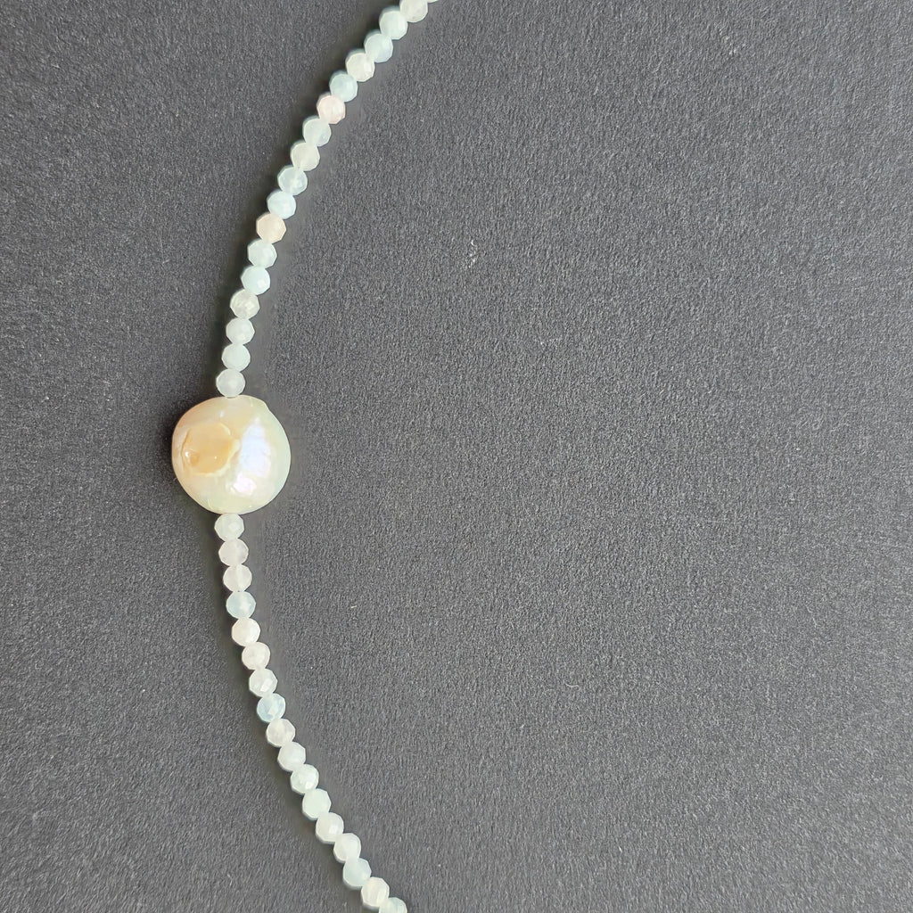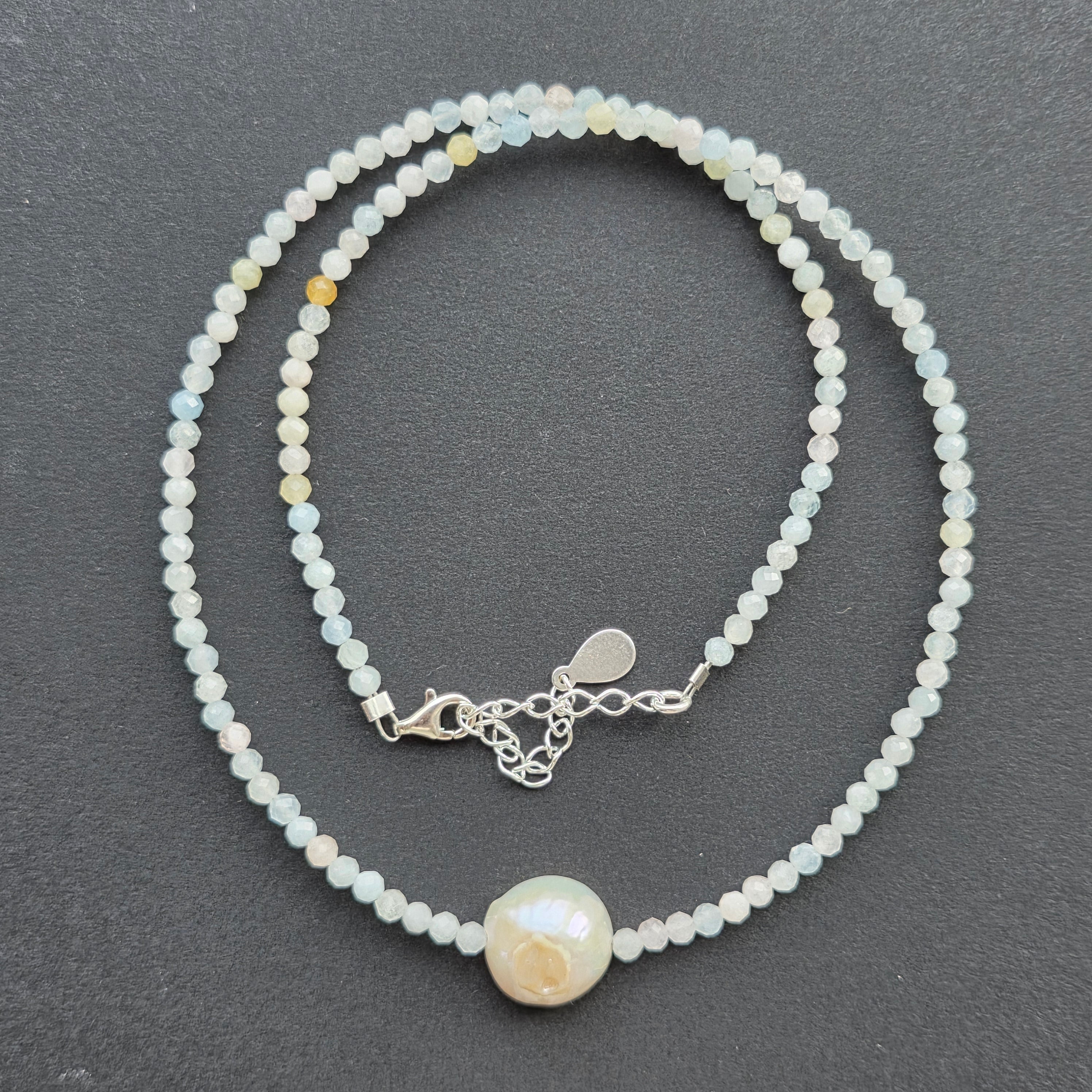 Acvamarinul este piatra clarității emoționale, a comunicării sincere și a încrederii în propriul adevăr. Se spune că liniștește inima, alungă anxietatea și aduce curaj blând. Perlele completează această vibrație prin grația lor atemporală – simboluri ale intuiției, blândeții și armoniei.