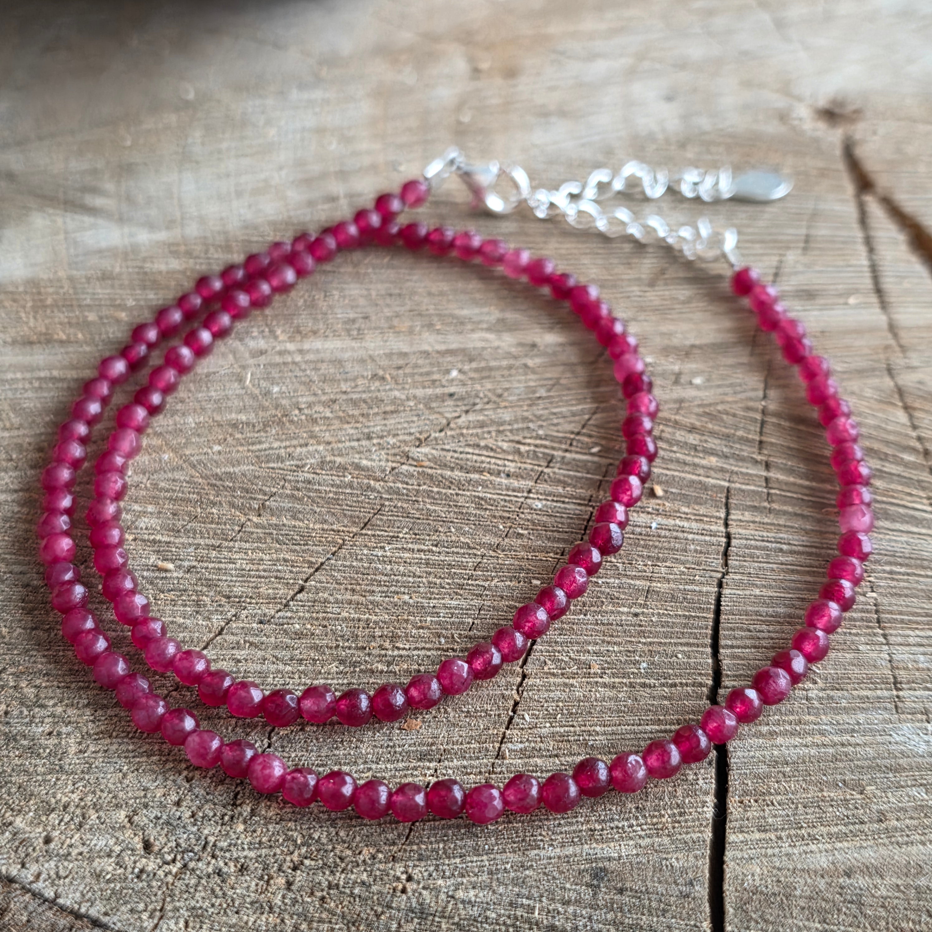 Firul este compus integral din sfere fațetate de agat burgundy de 3 mm, mărgele închise la culoare, cu reflexe subtile între rubiniu stins, vișiniu matur și umbre de vin roșu așezat. Fațetele fine prind lumina discret, ca un oftat abia ghicit, iar culoarea, adâncă și plină, are o gravitate care invită la liniște și prezență.
