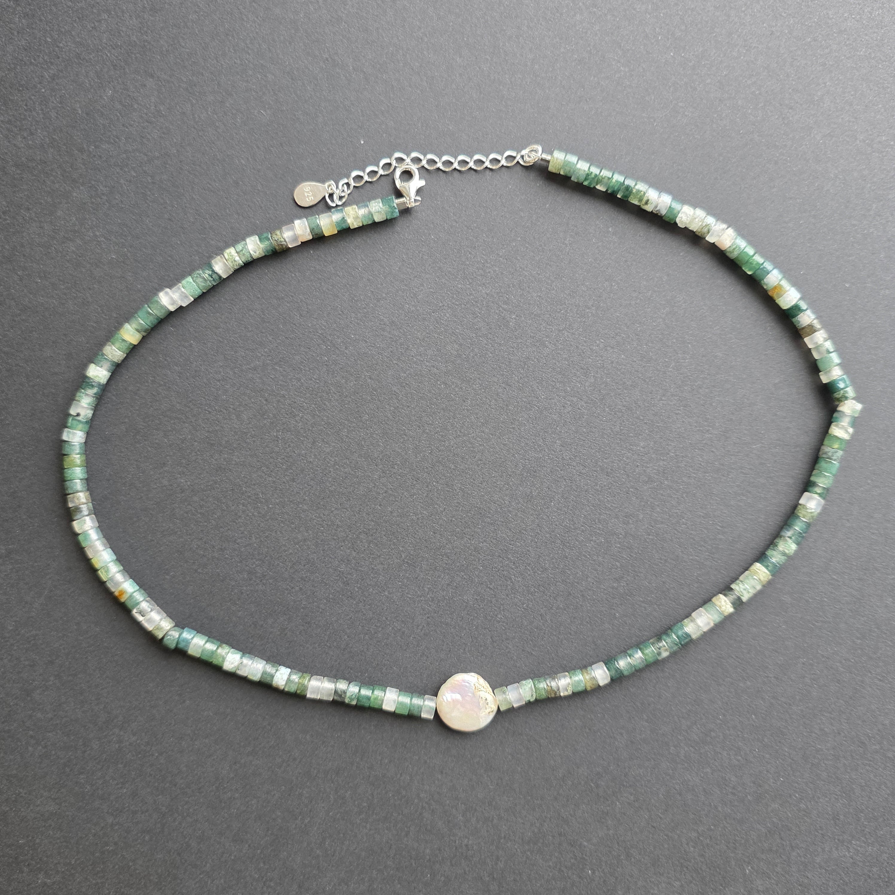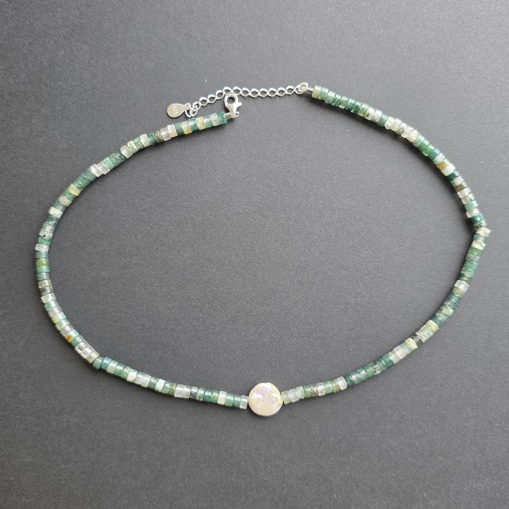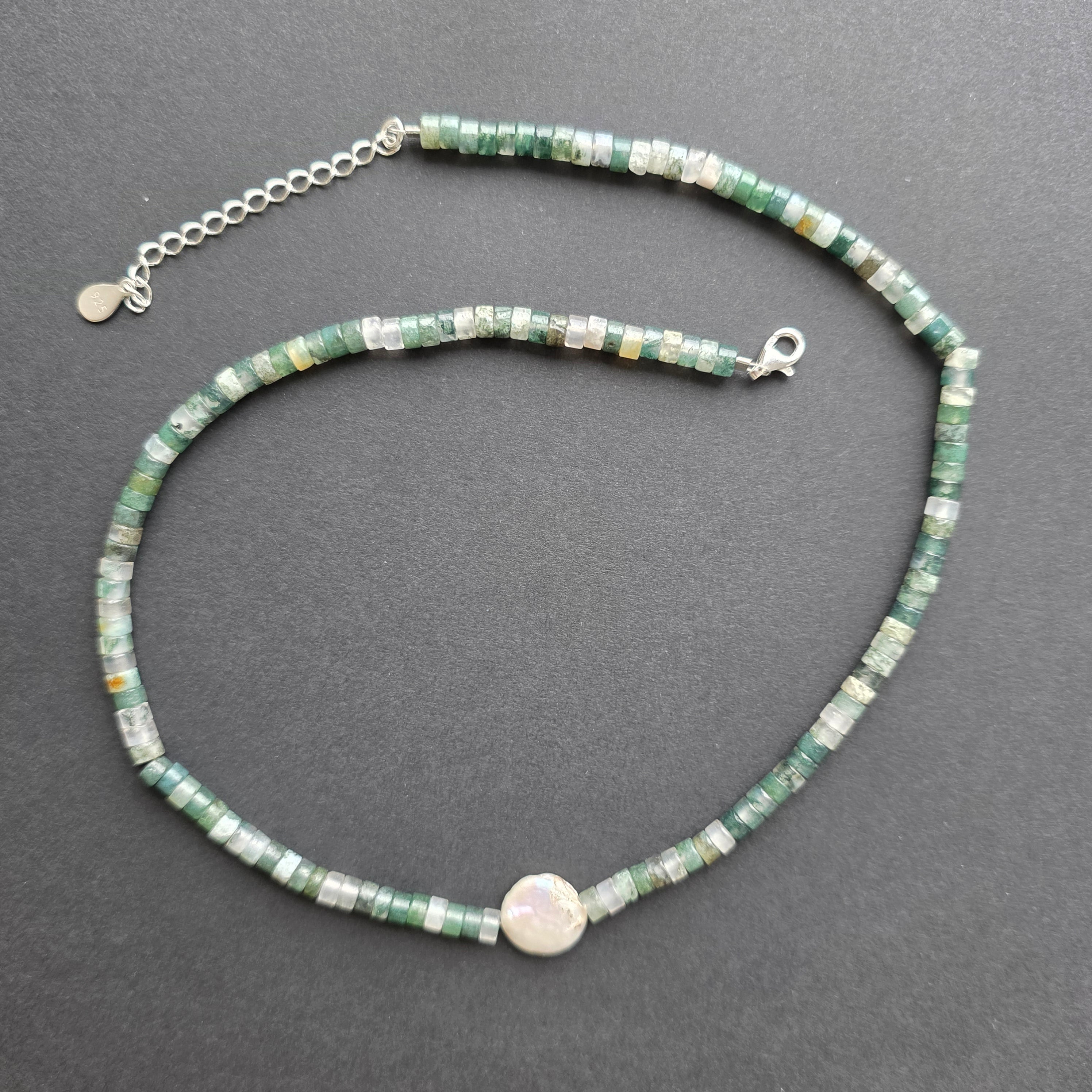 Materiale: aventurin verde natural, mărgele tumble 6 × 4 mm, sfere fațetate 2 mm, perlă naturală 2 cm, argint 925