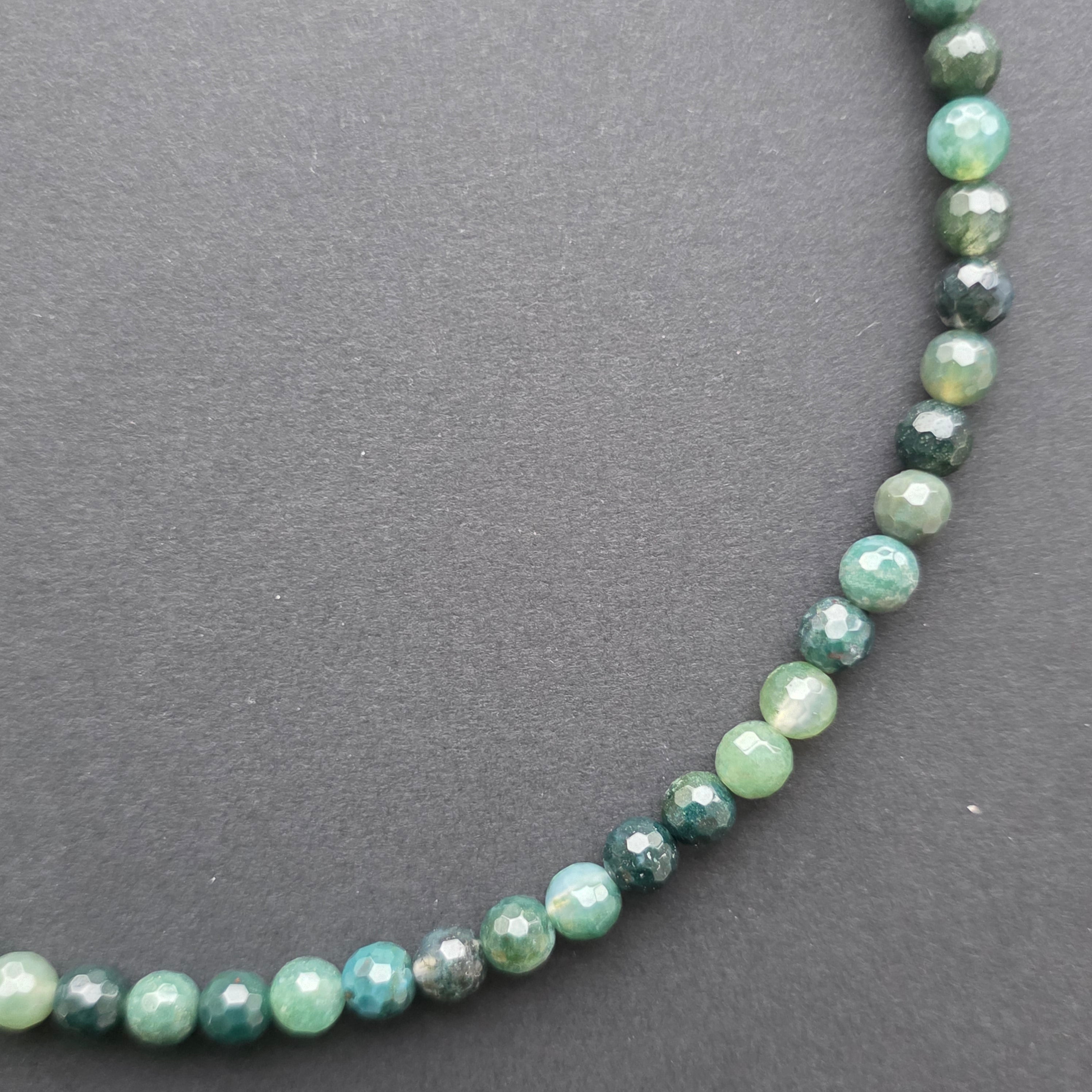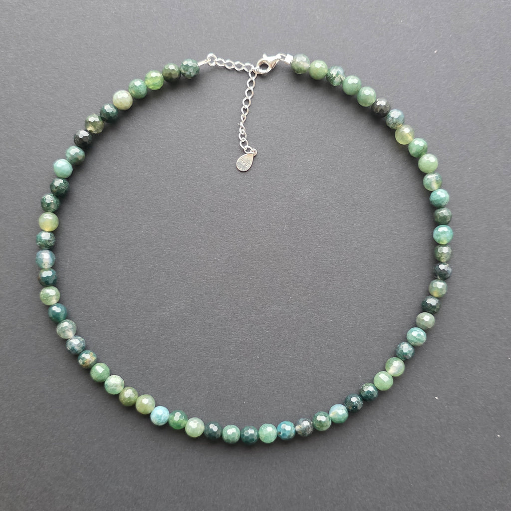 Un colier care poartă liniștea și forța naturii vii. Agatul pădure natural fațetat de 6 mm emană o frumusețe organică și pură, cu nuanțe ce amintesc de mușchiul din lumina dimineții și de răcoarea copacilor după ploaie. Reflexele sale delicate și textura translucidă adaugă profunzime, iar fațetele fine captează lumina în scânteieri subtile.