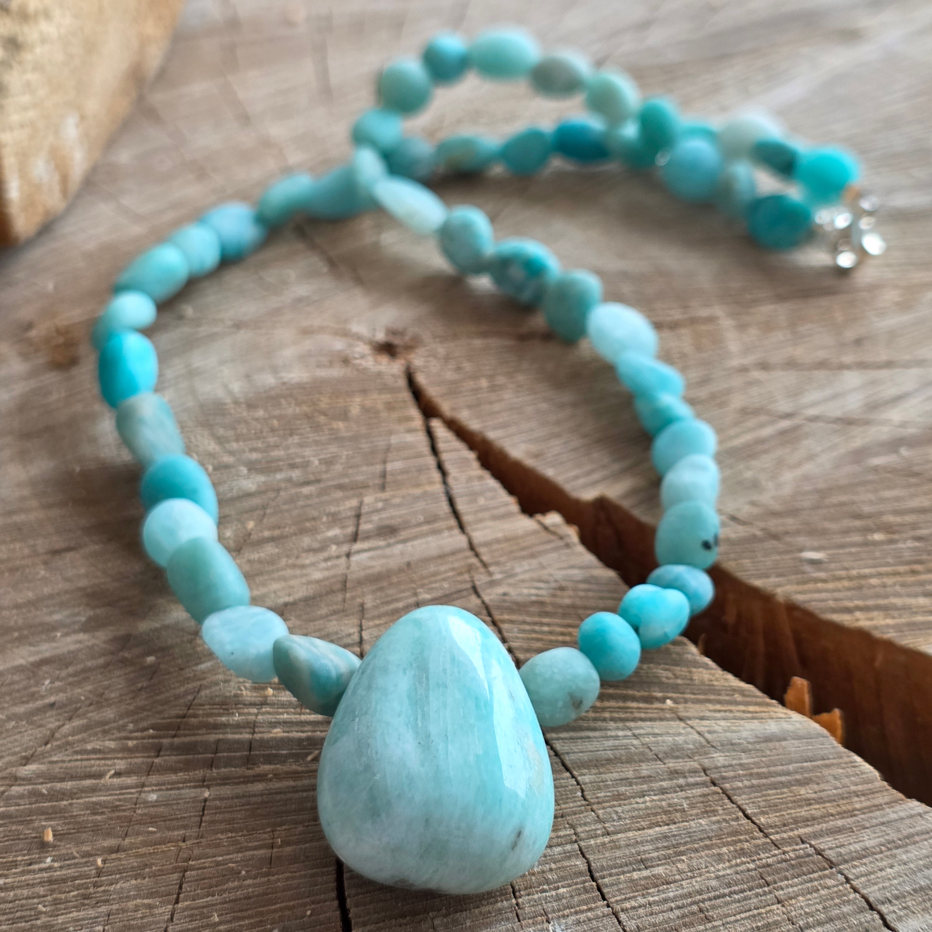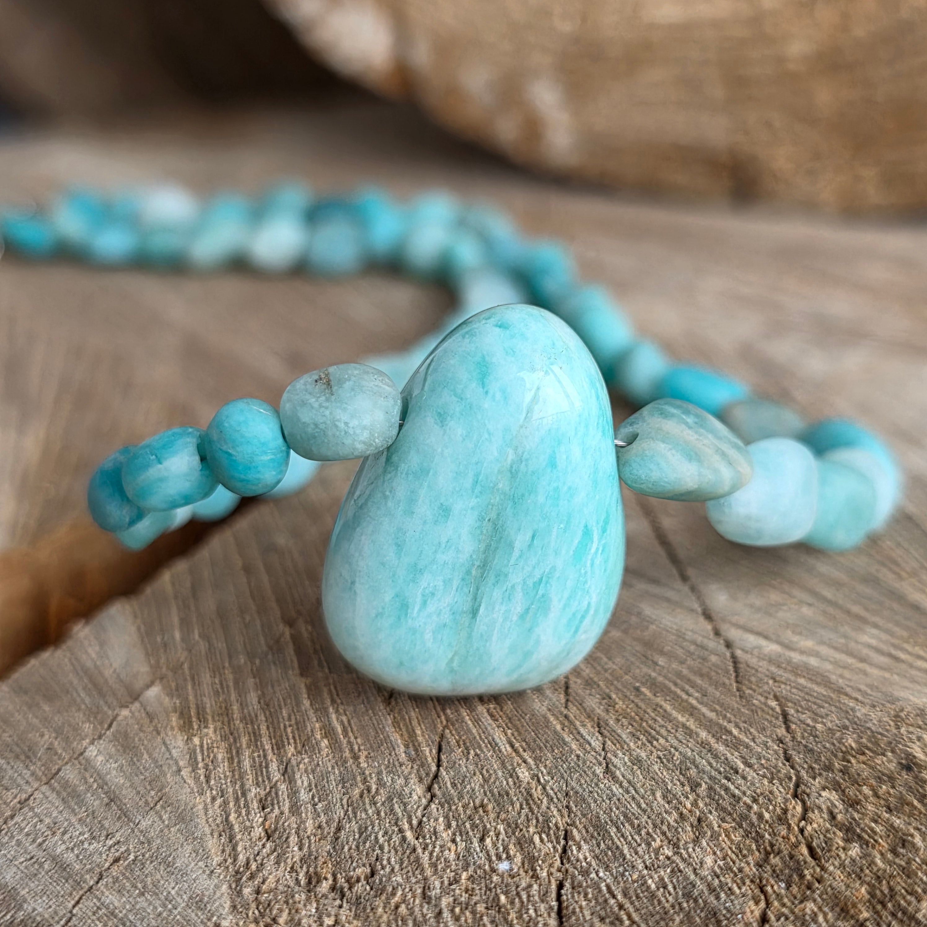 Eine Halskette mit der Schwingung der heiligen Flüsse und des himmlischen Wolkens - stark, klar und geladen. Natürliche Amazonikkügelchen mit einem Durchmesser zwischen 8 und 10 mm zeigen Schattierungen von rohen Blau-grünen Blau, die in unvollkommenen und authentischen Rhythmen gemalt sind.
