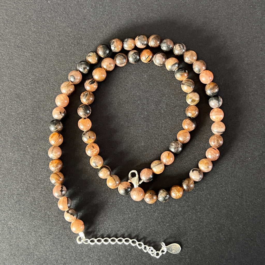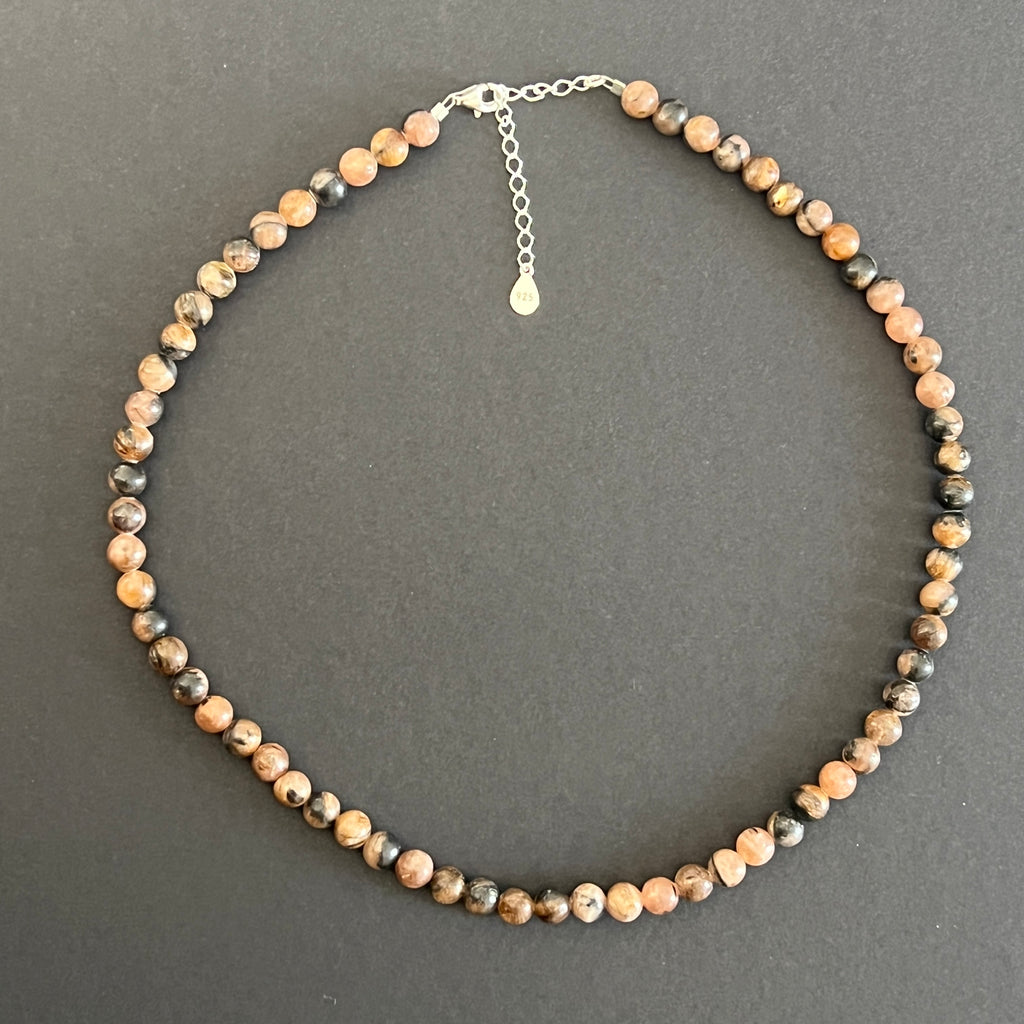 Un colier care poartă în sine amprenta sacrului și a misterului. Chiastolitul, cunoscut și ca „piatra crucii”, dezvăluie în structura sa naturală un simbol ancestral al protecției și al legăturii cu divinul. Mărgelele de 6 mm împletesc tonuri calde de maro, gri și ocru, fiecare purtând crucea ascunsă în miezul pietrei, ca o pecete a echilibrului dintre lumină și întuneric.