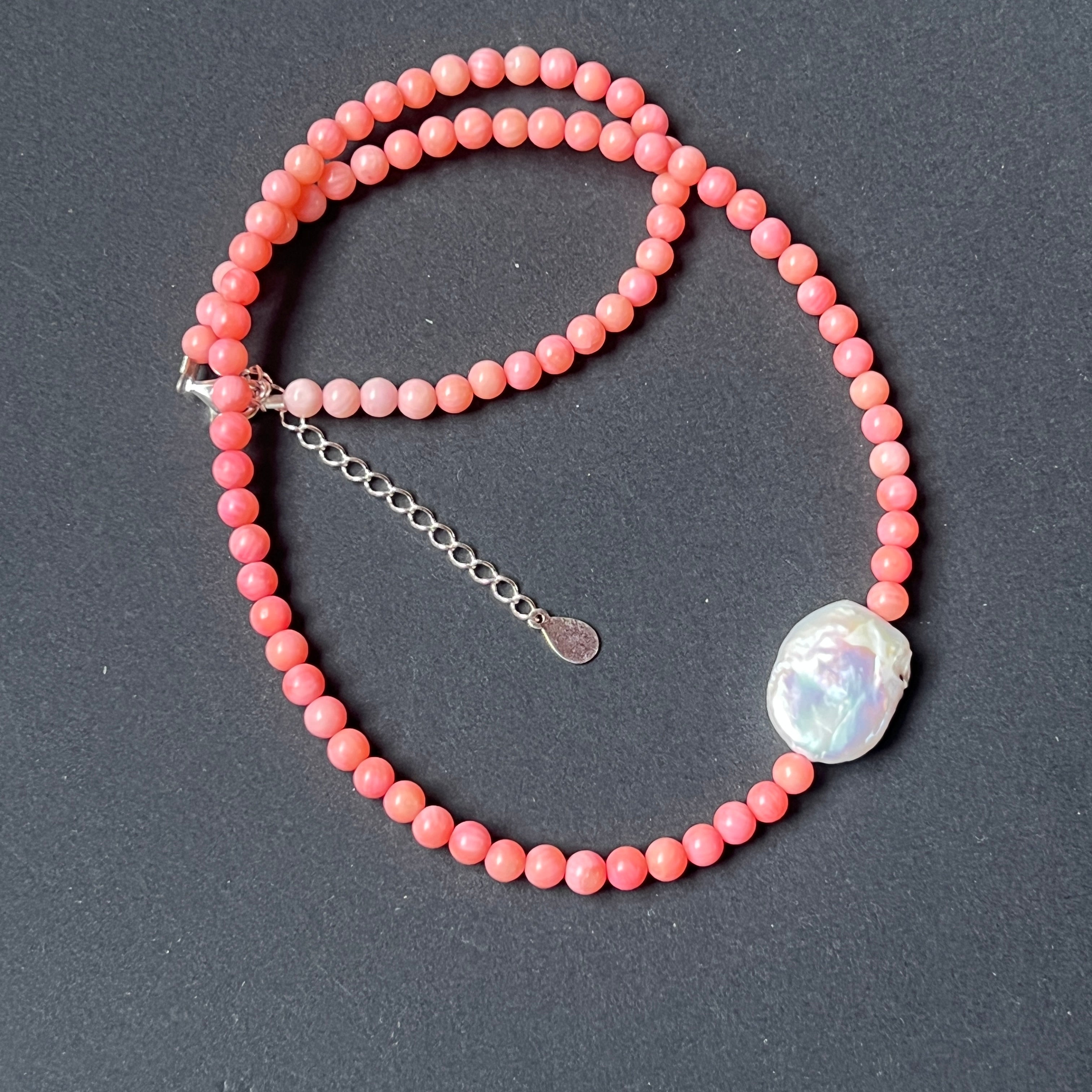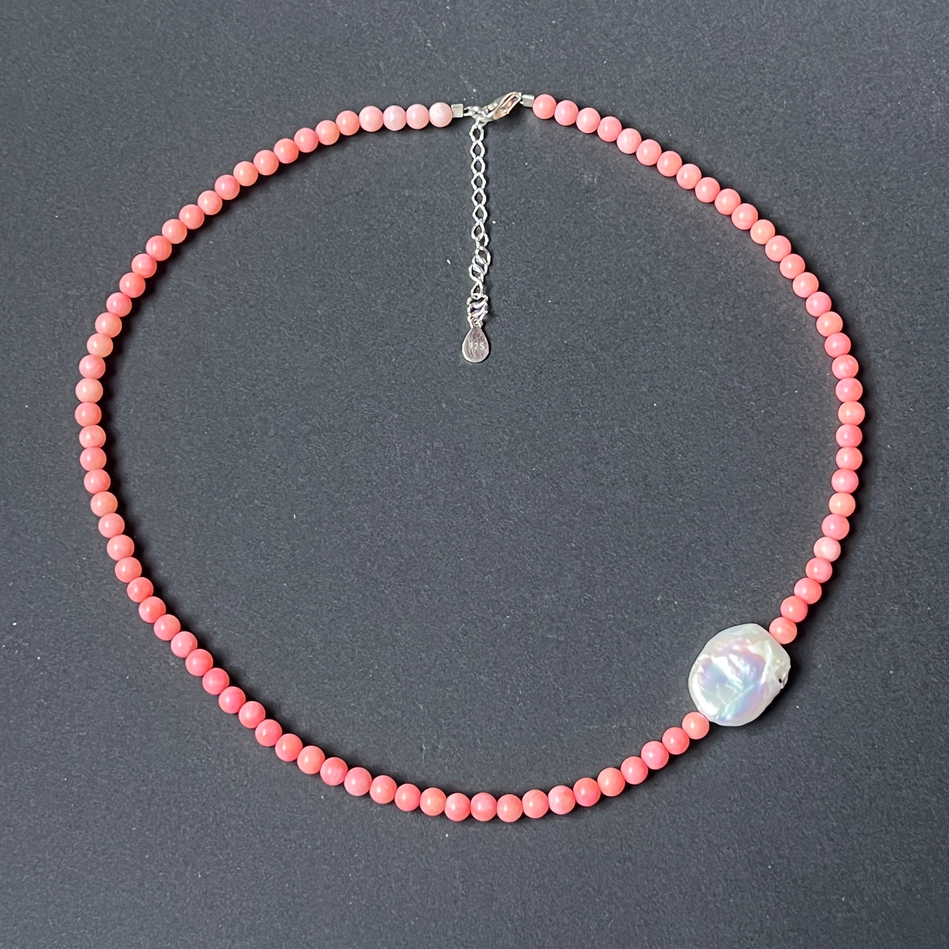 Materialien: Natürliche rosa Korallen (4 mm Kugeln), rechteckige natürliche Perle (ca. 2 cm), Silber 925