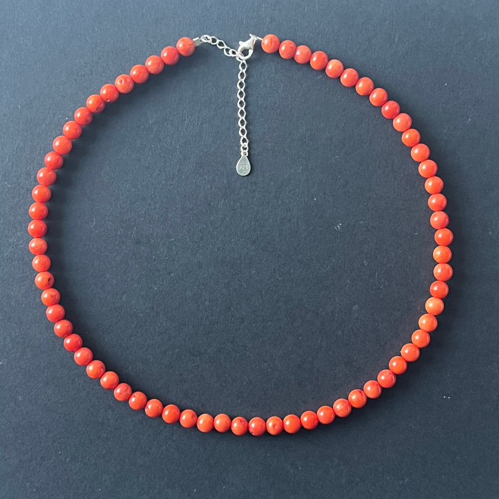 Materiale: coral portocaliu natural, mărgele sferice de 6 mm, argint 925