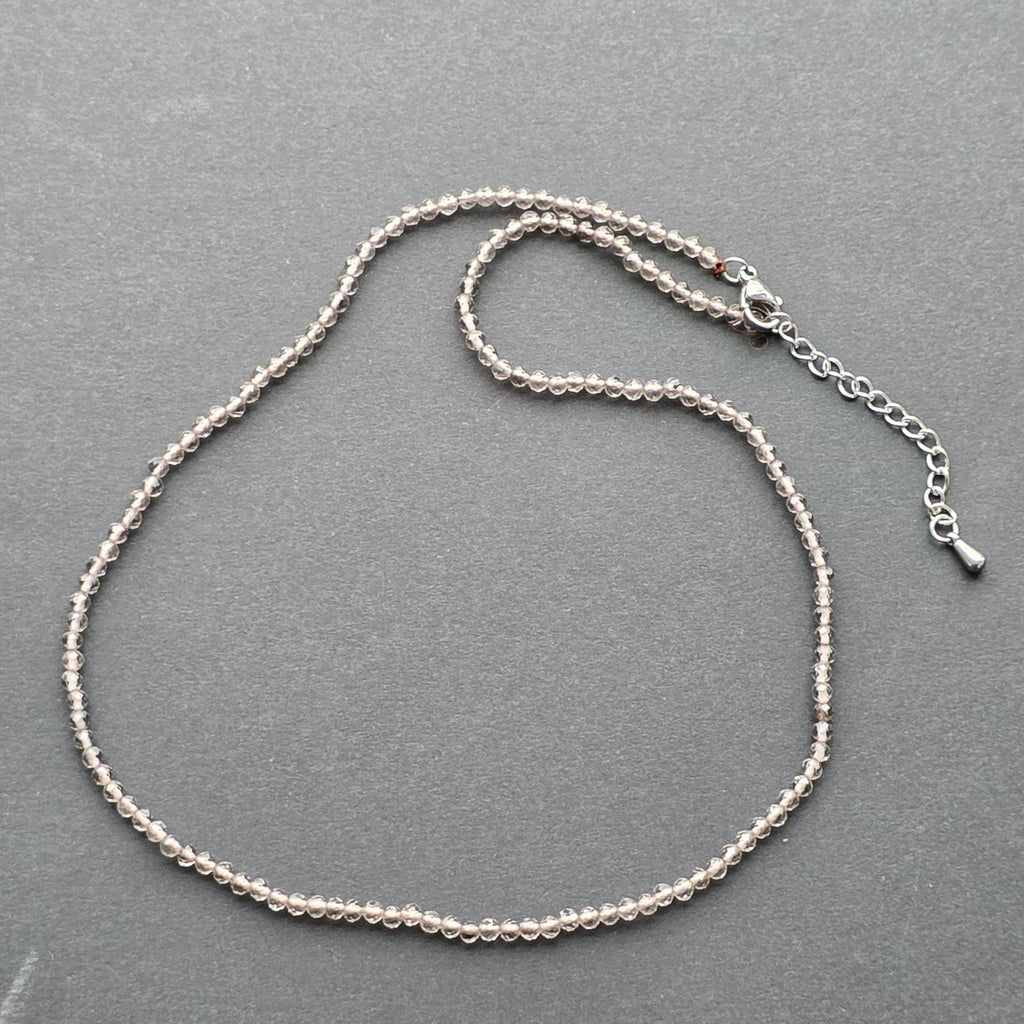 Un colier minimalist și rafinat, realizat din cuart fumuriu natural, fațetat cu precizie pentru a capta lumina în reflexii discrete. Nuanța sa translucidă, în tonuri calde de fum și ciocolatiu, oferă un aer misterios și sofisticat, potrivit atât pentru ținute de zi, cât și pentru cele elegante. Fiecare sferă de 2 mm este șlefuită pentru a evidenția claritatea și profunzimea specifică acestui cristal, rezultând o piesă delicată, dar de impact.