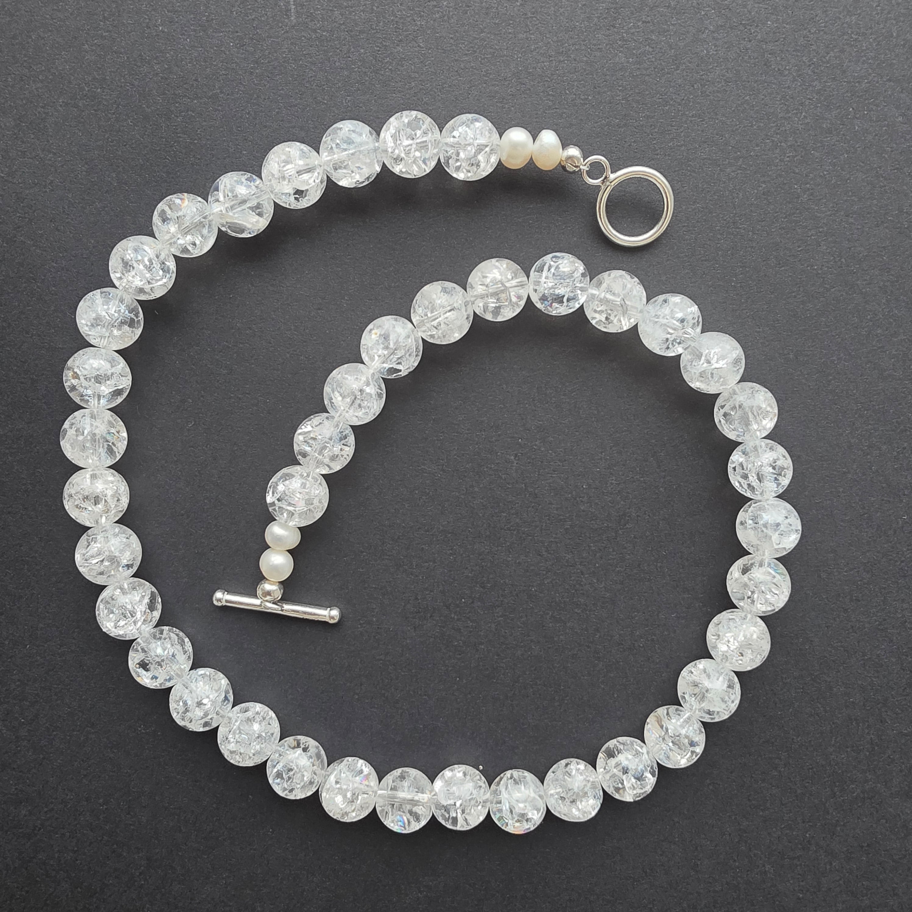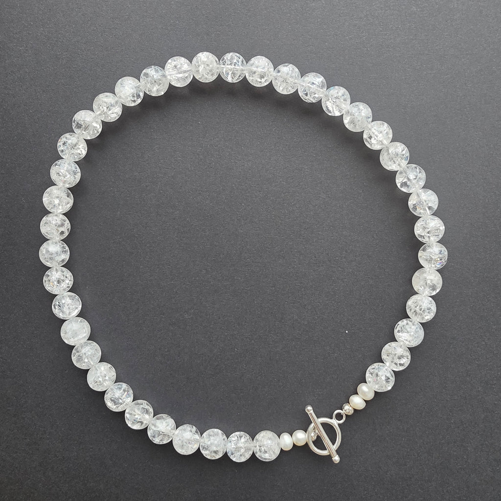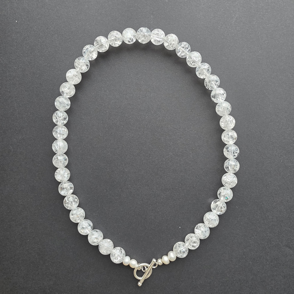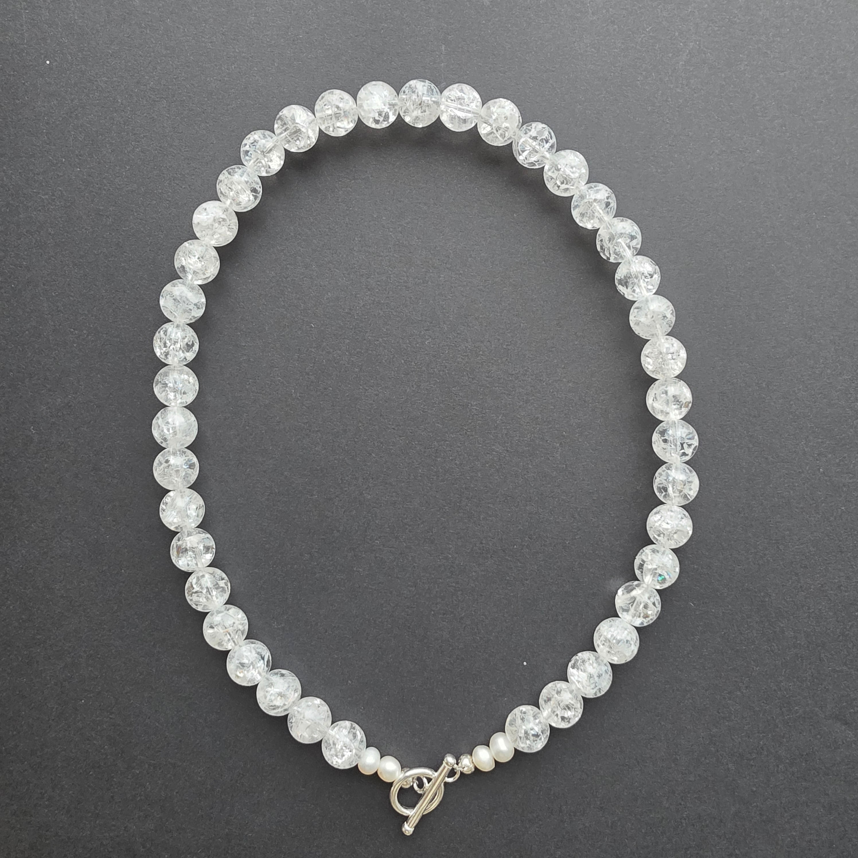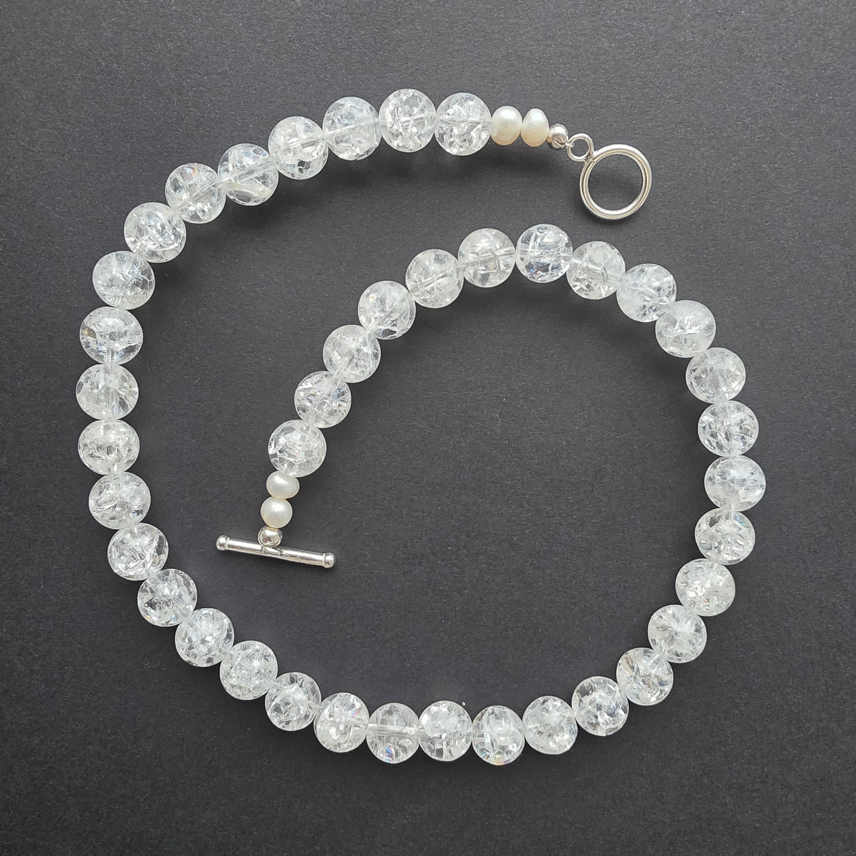 Un colier care îmbină forța cristalului cu delicatețea perlei, într-o compoziție echilibrată între lumină și tăcere. Cuartul incolor „crashed”, în sfere ample de 10 mm, poartă în interior jocuri de lumini și umbre, ca o gheață care păstrează amintirea unei stele căzătoare. Textura sa unică amintește că frumusețea adevărată se naște adesea din imperfecțiune și transparență.