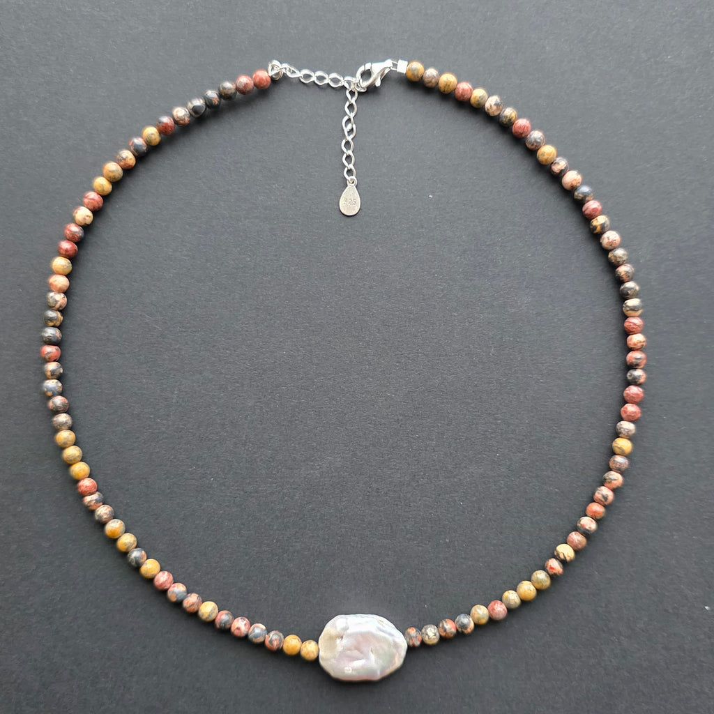 Un colier care poartă amprenta pământului și energia elementară a stabilității. Jaspul leopard natural de 4 mm dezvăluie modele organice, asemenea petelor fine de pe blana unui animal sălbatic, amintind de legătura profundă dintre om și natură. În centrul bijuteriei, o perlă naturală dreptunghiulară de 2 cm aduce o notă de lumină și echilibru, precum o rază albă într-un peisaj de piatră și pământ.