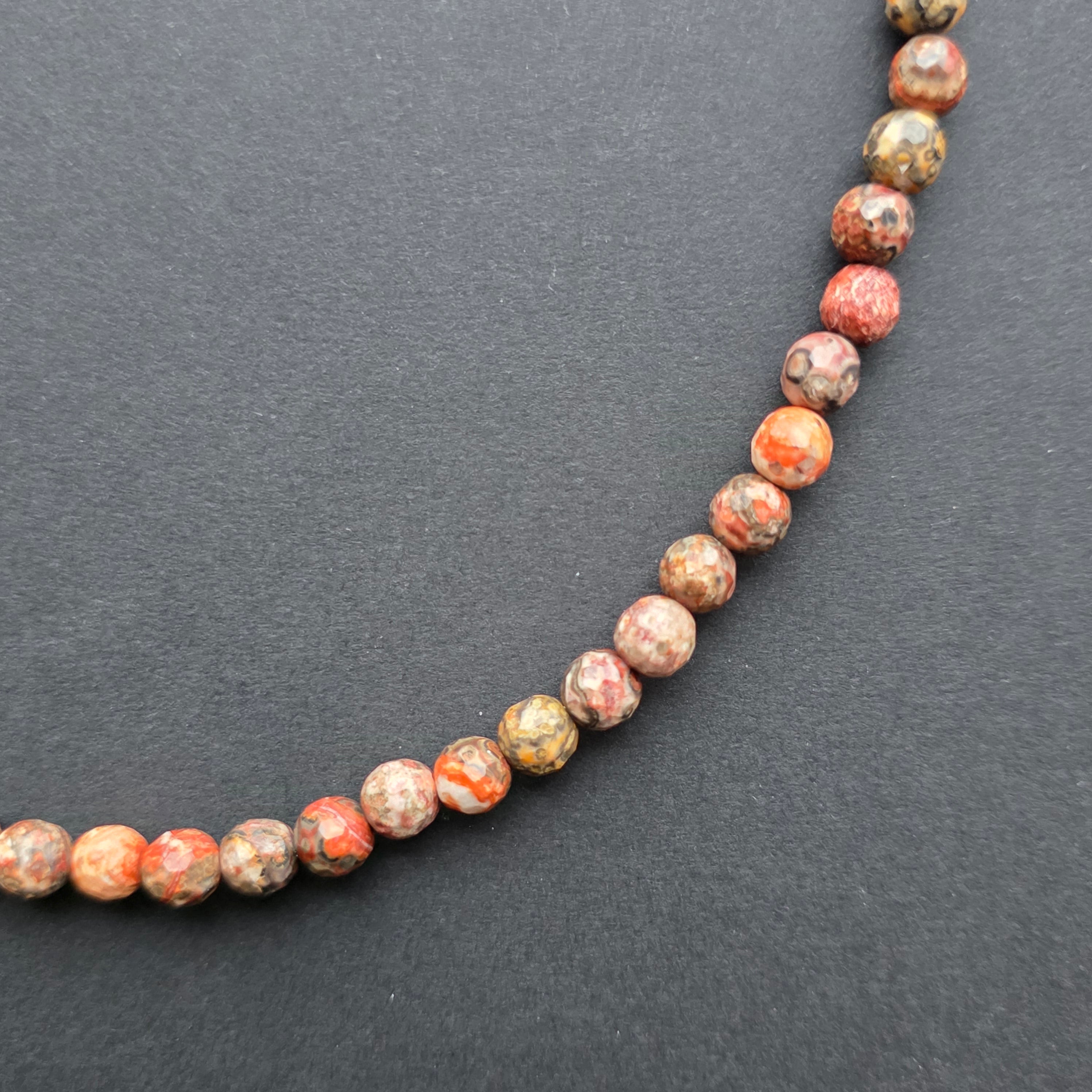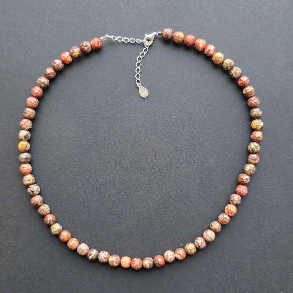 Un colier ce emană forța blândă a pământului și noblețea discretă a naturii sălbatice. Jaspul leopard natural fațetat de 6 mm captivează prin combinația de culori pământii și formele organice care par pictate de timp. Fațetele sale fine reflectă lumina cu subtilitate, oferind bijuteriei o eleganță caldă și autentică, perfectă pentru cei care iubesc frumusețea naturală.