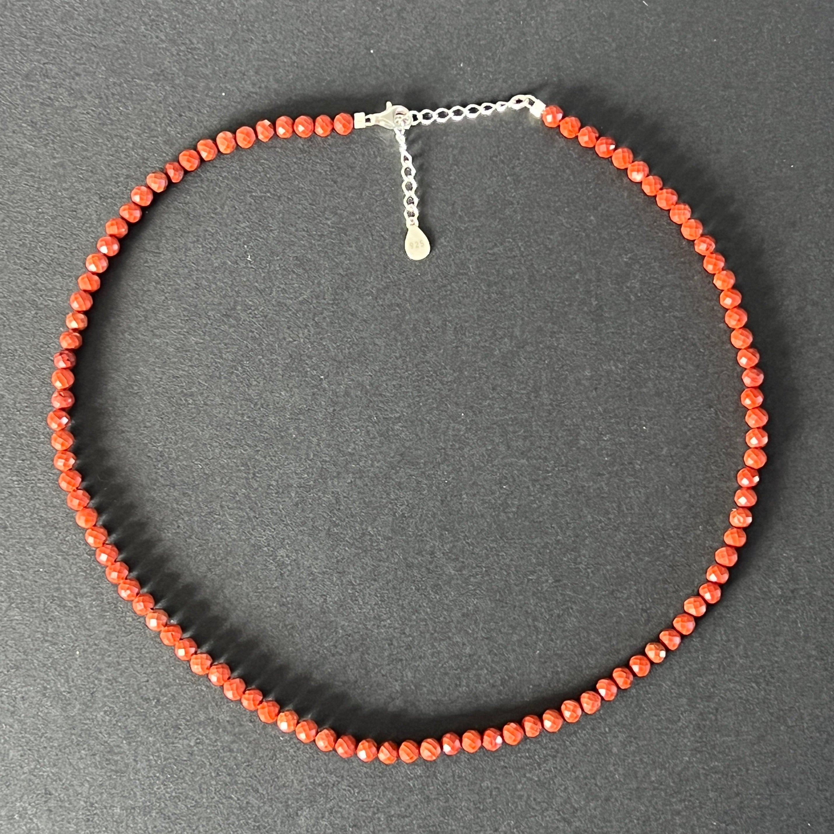 Un colier ce poartă în el focul vieții și pasiunea pământului. Jaspul roșu, cunoscut drept piatra vitalității și a curajului, strălucește în nuanțe aprinse, iar fațetele delicate ale sferelor de 4 mm lasă lumina să danseze pe suprafața lor, amplificând intensitatea culorii.