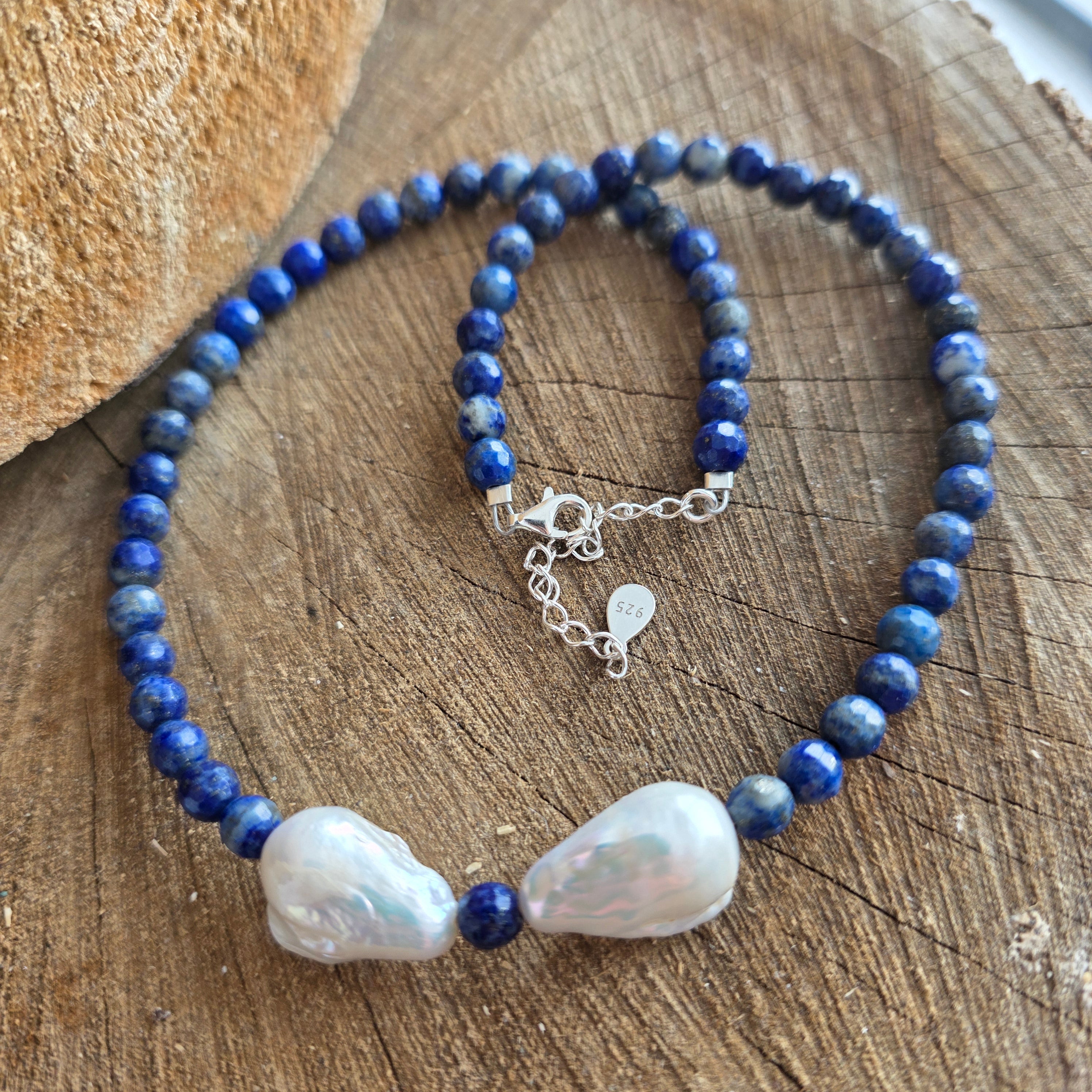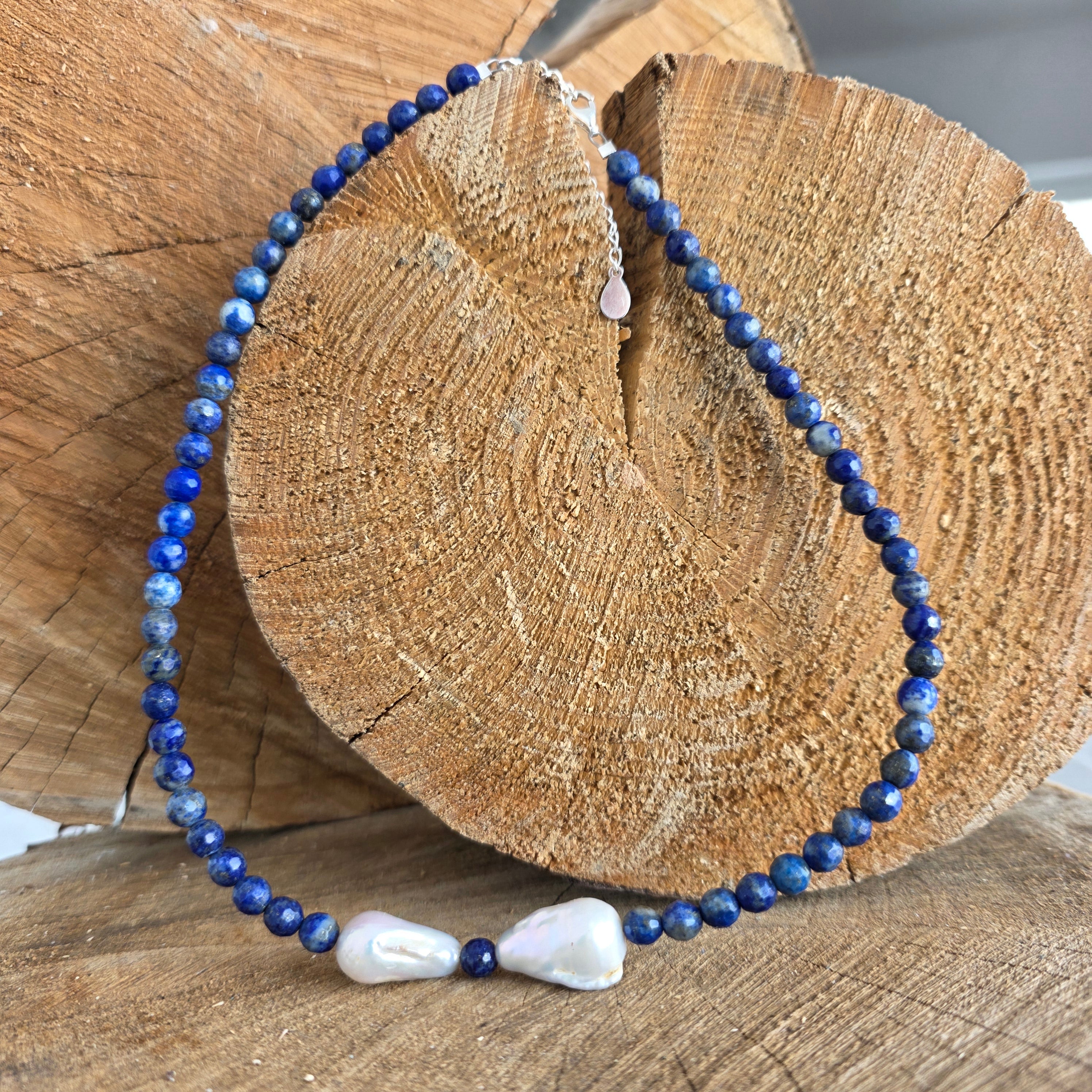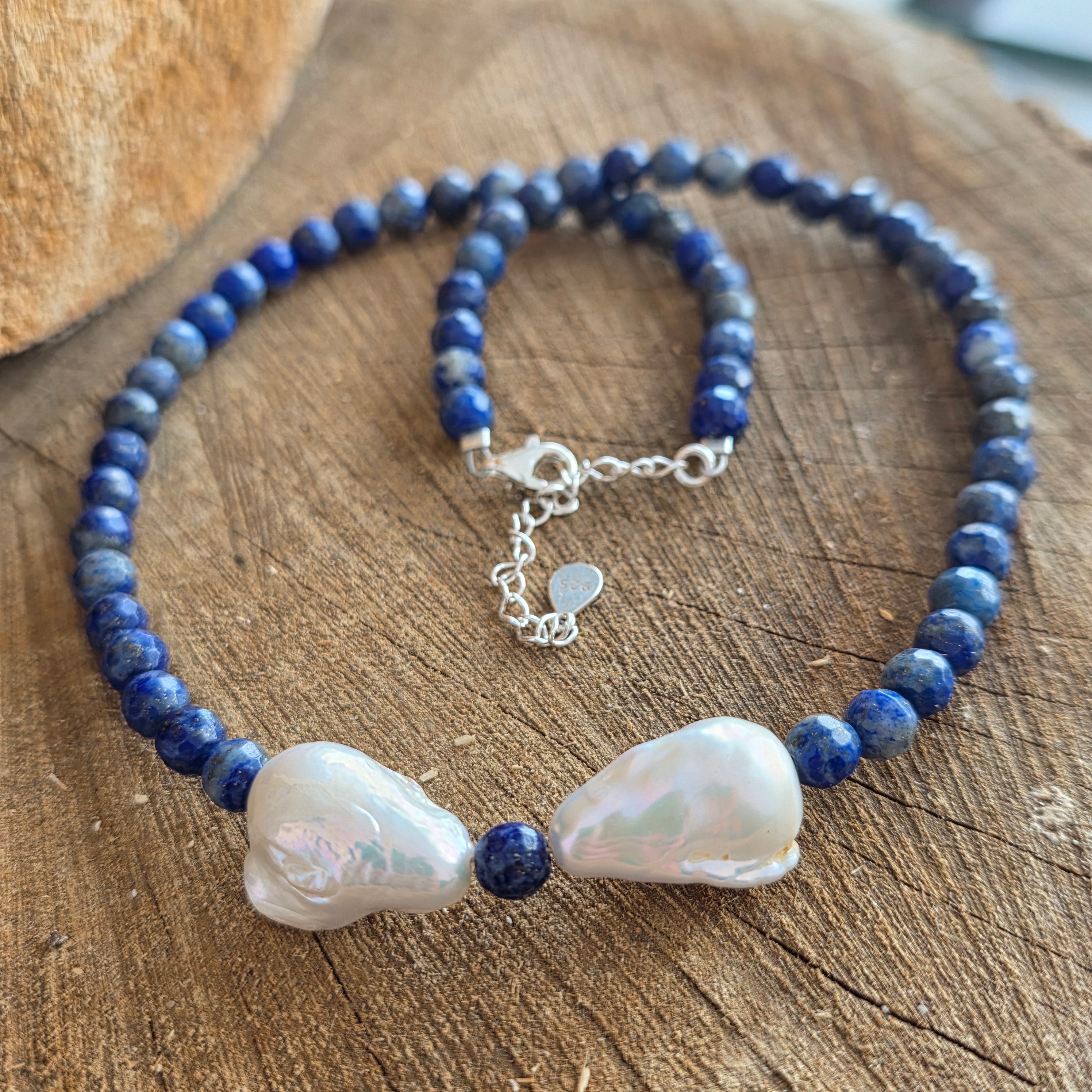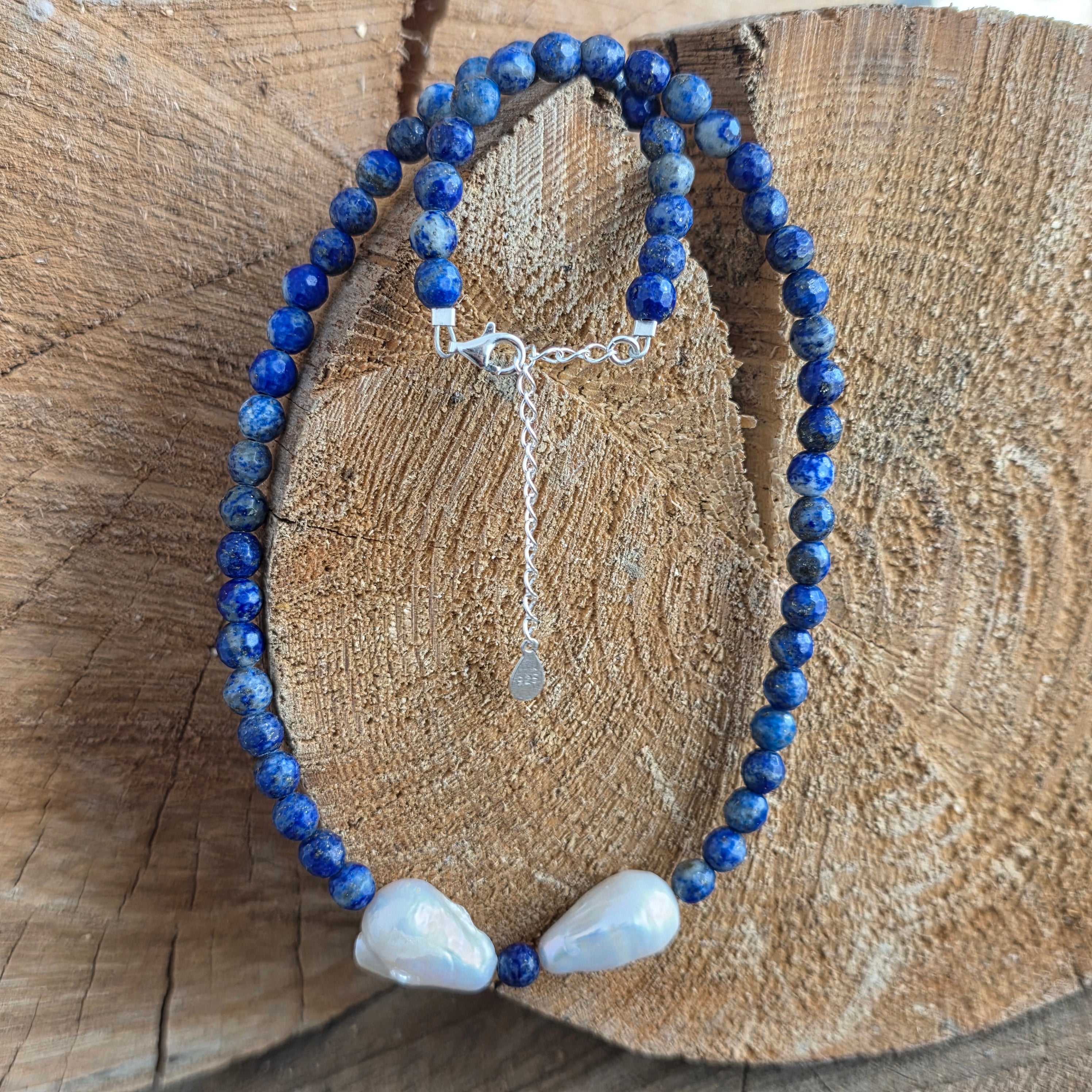 Materialien: Lapis Lazuli (facettierte 6 mm Kugeln), natürliche Barockperlen, 925er Silber