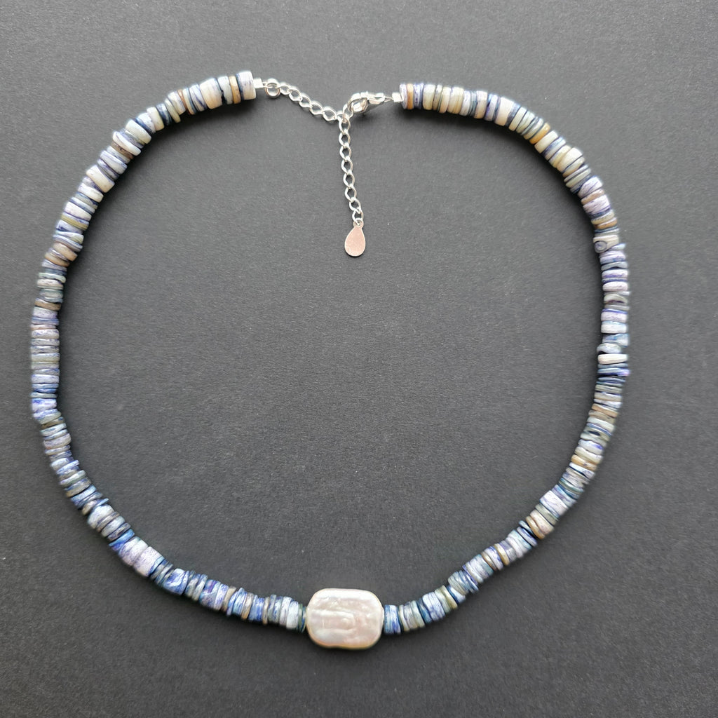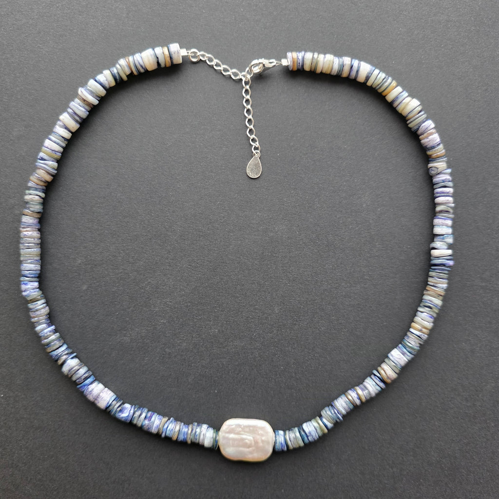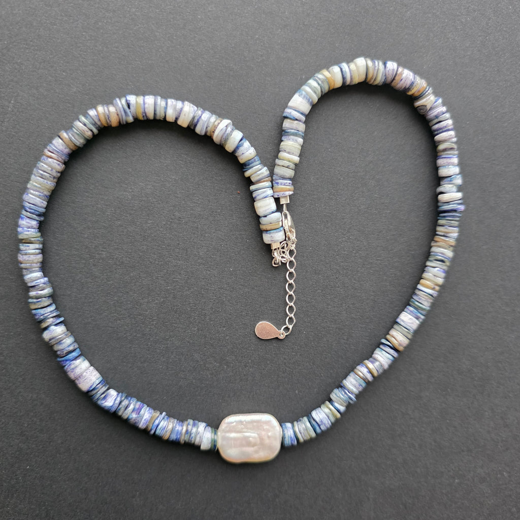 Un colier ce aduce împreună cerul și marea, într-un echilibru perfect între profunzime și puritate. Lapis lazuli-ul natural, tăiat în discuri de 6 mm, strălucește într-un albastru intens presărat cu reflexe aurii de pirită, evocând noaptea senină a Orientului antic. În centrul compoziției, o perlă naturală dreptunghiulară de 2 cm adaugă un accent de lumină calmă, ca o spumă albă peste valurile albastre.