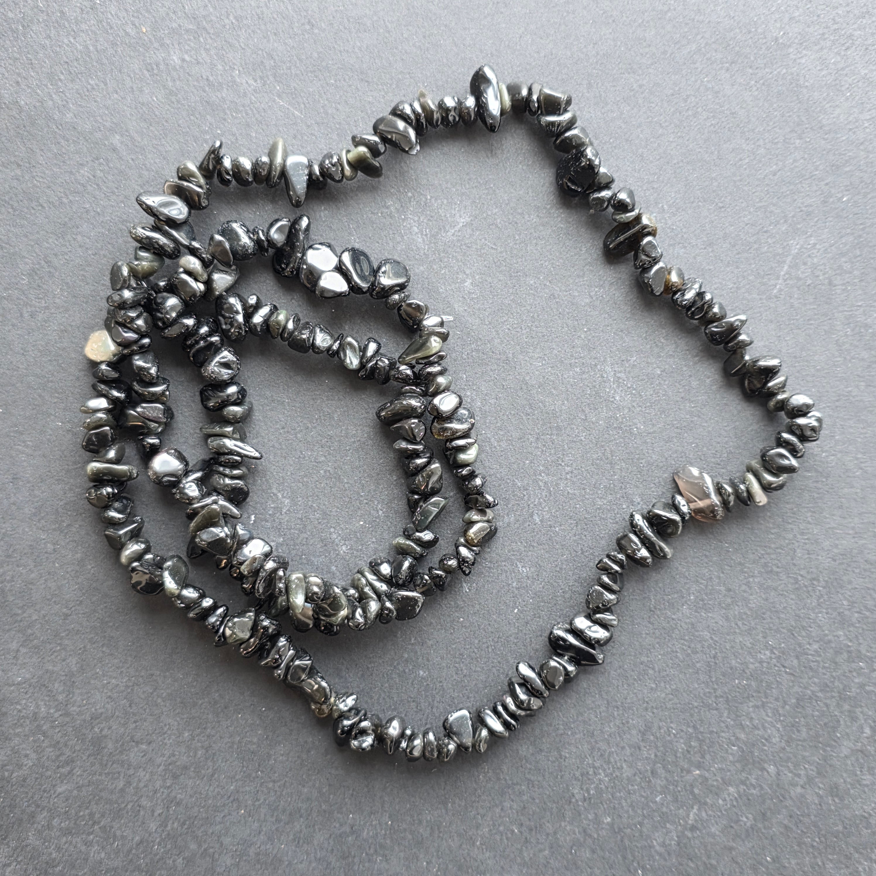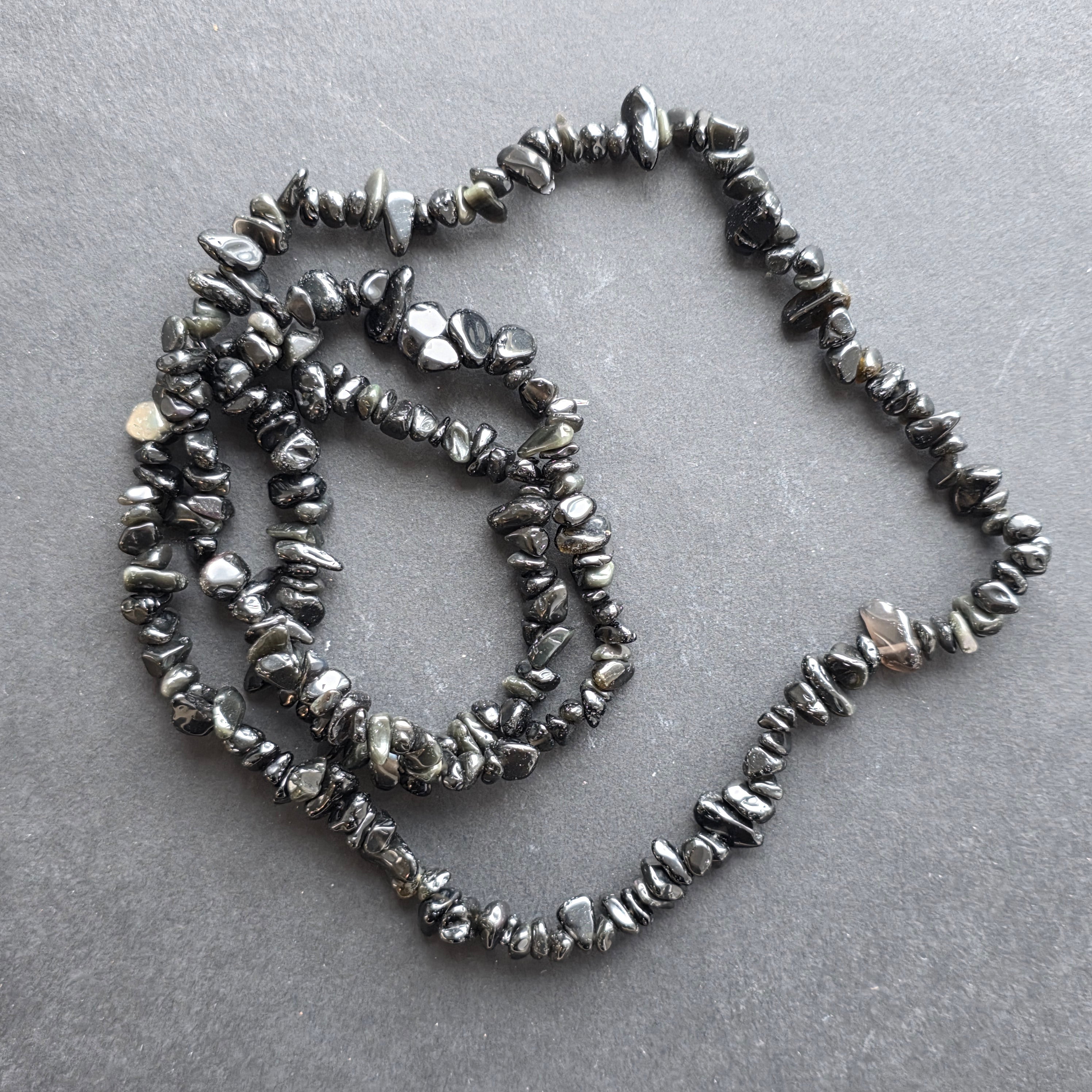 Un colier care poartă în el misterul nopților vulcanice și tăcerea adâncă a pământului. Chipsurile naturale de obsidian, șlefuite delicat și înșirate într-un șir continuu de 80 cm, emană o eleganță discretă, aproape hipnotică. Strălucirea lor neagră, cu reflexe sticloase, aduce aminte de lava răcită care a învățat să se transforme în protecție.