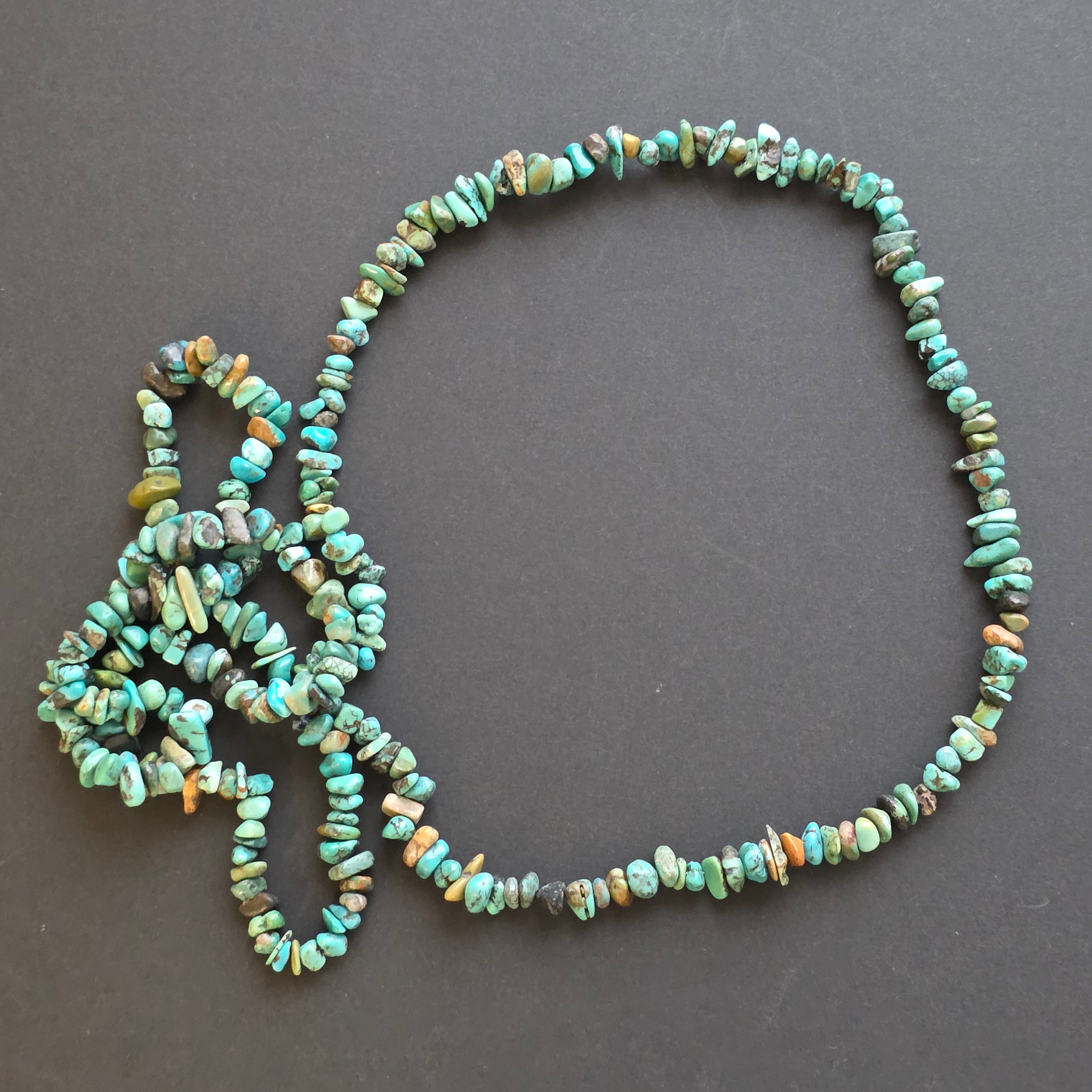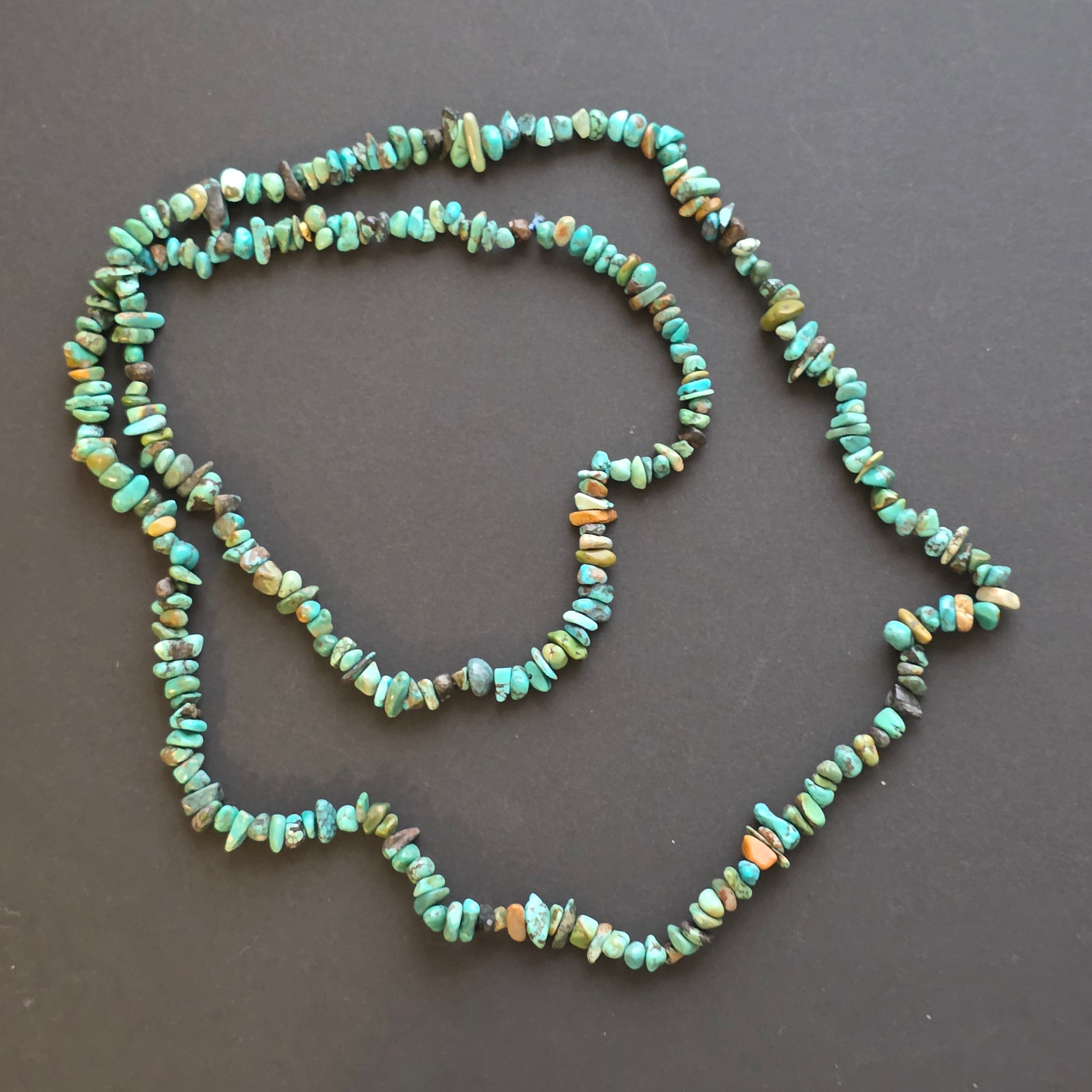 Un colier lung și expresiv, realizat din chipsuri de turcoaz natural, fiecare piesă păstrând forma liberă a pietrei, cu variații de culoare și textură care îi dau caracter și autenticitate. Nuanțele de albastru și verde, uneori străbătute de vene fine, creează un ritm vizual organic, cu aer boem și natural.