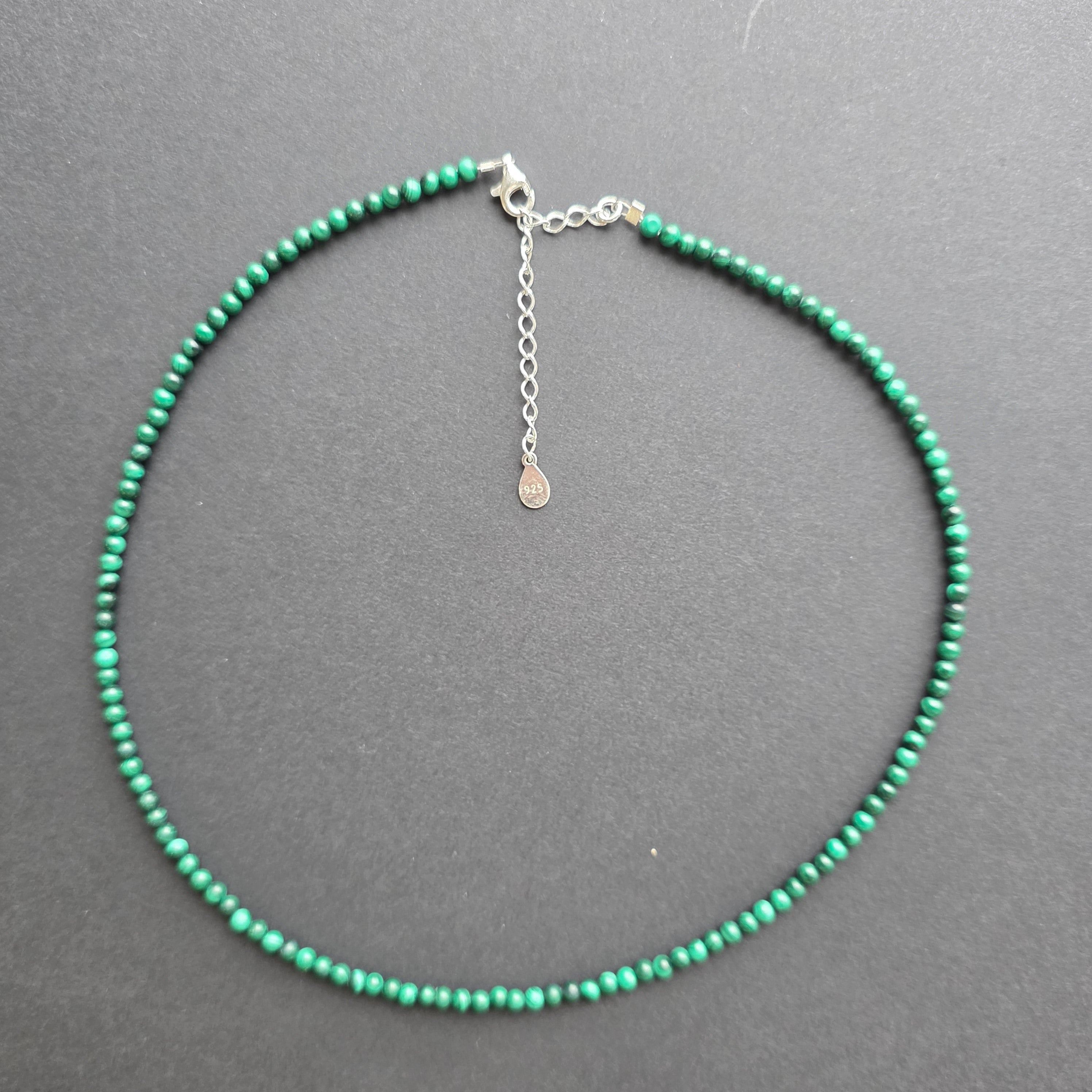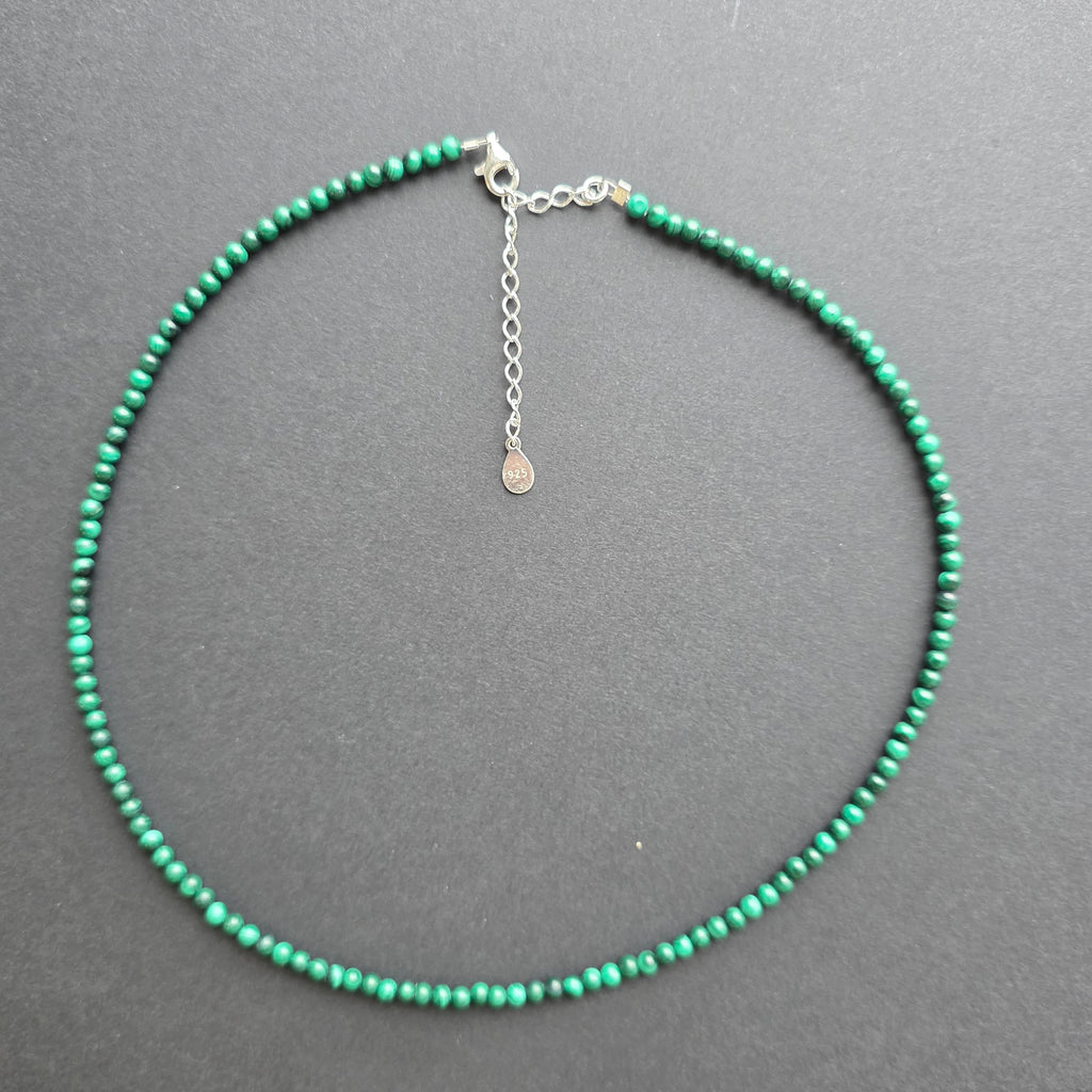Un colier care poartă cântecul adânc al pământului, un ecou al forței și al regenerării. Malachitul, cu nuanțele sale de verde intens și dungi fluide, este o piatră vie — expresie a transformării, protecției și renașterii interioare. Fiecare mărgea de 3 mm este o lume în sine, un dans între lumina smaraldului și umbra pădurii.