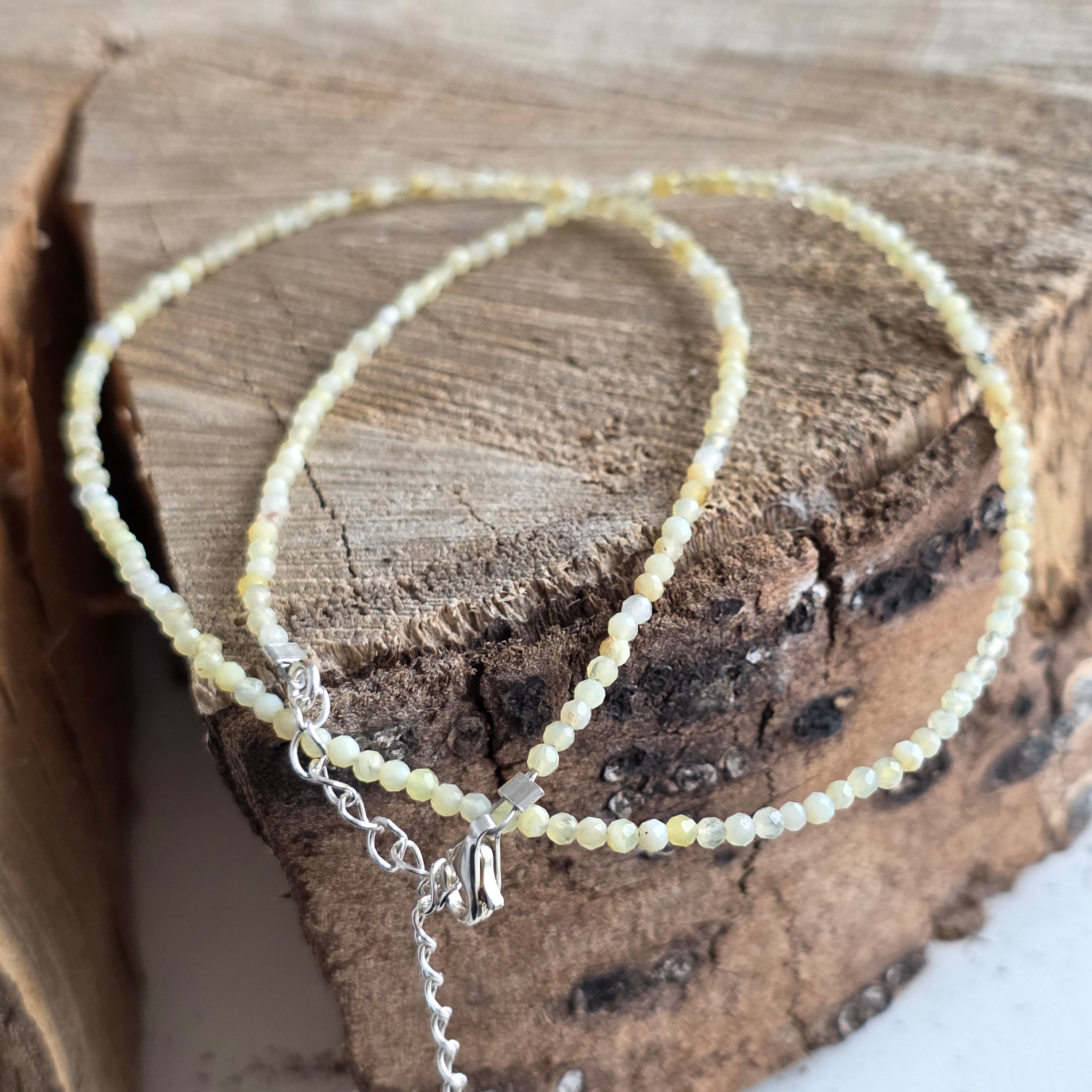 Der Faden besteht aus Kugeln von Facetten durch durch 2,5 mm gelber Opal, feine und durchscheinende Perlen, mit einem weichen Leuchten, der aus dem Stein zu kommen scheint. Es ist keine starke Farbe, sondern eine diffuse, wie Honig, die in heißem Tee verdünnt ist, wie Aura eines stillen Morgens. Die fast unmerklichen opaleszierenden Reflexe fügen eine subtile Vibration von Geheimnis und Eleganz hinzu.