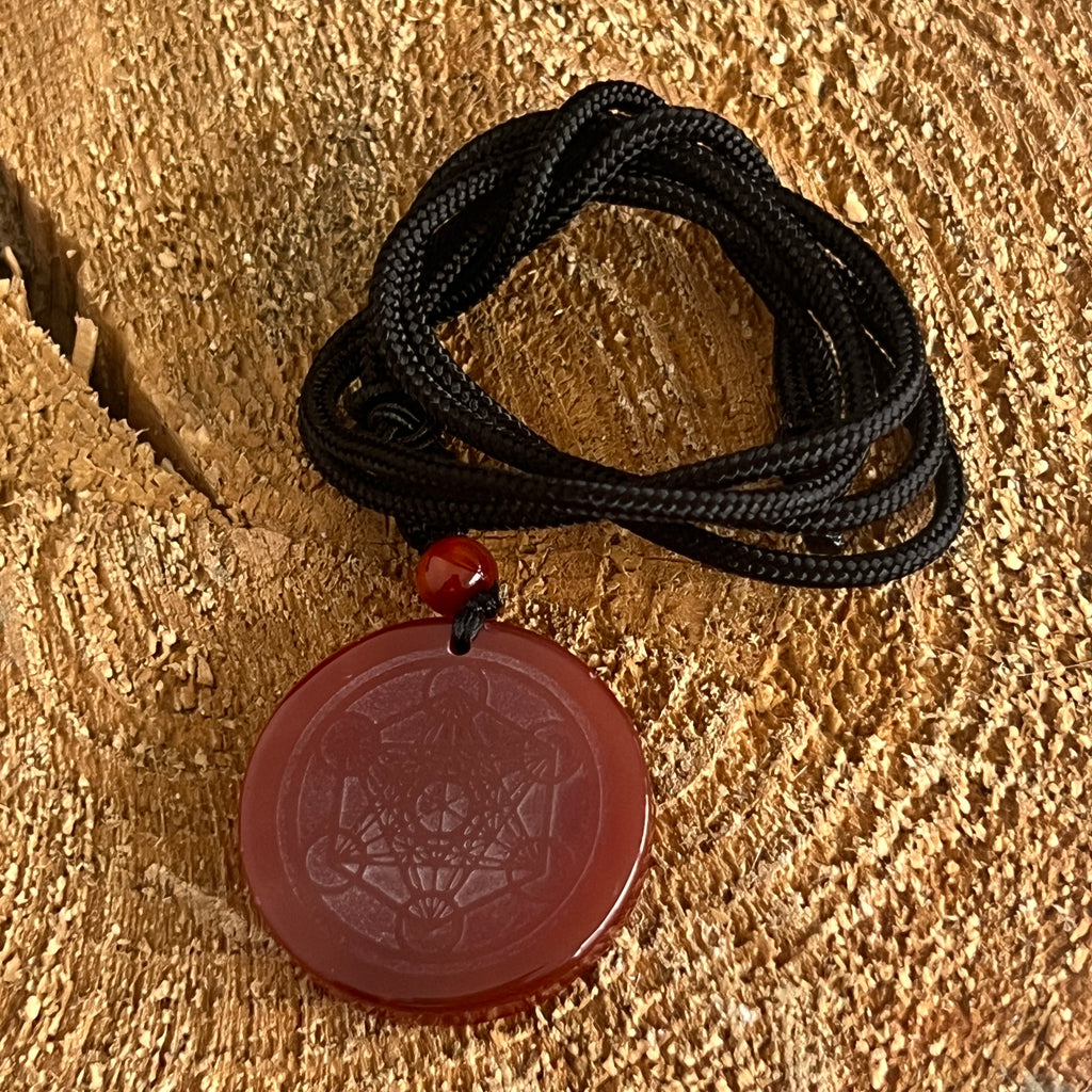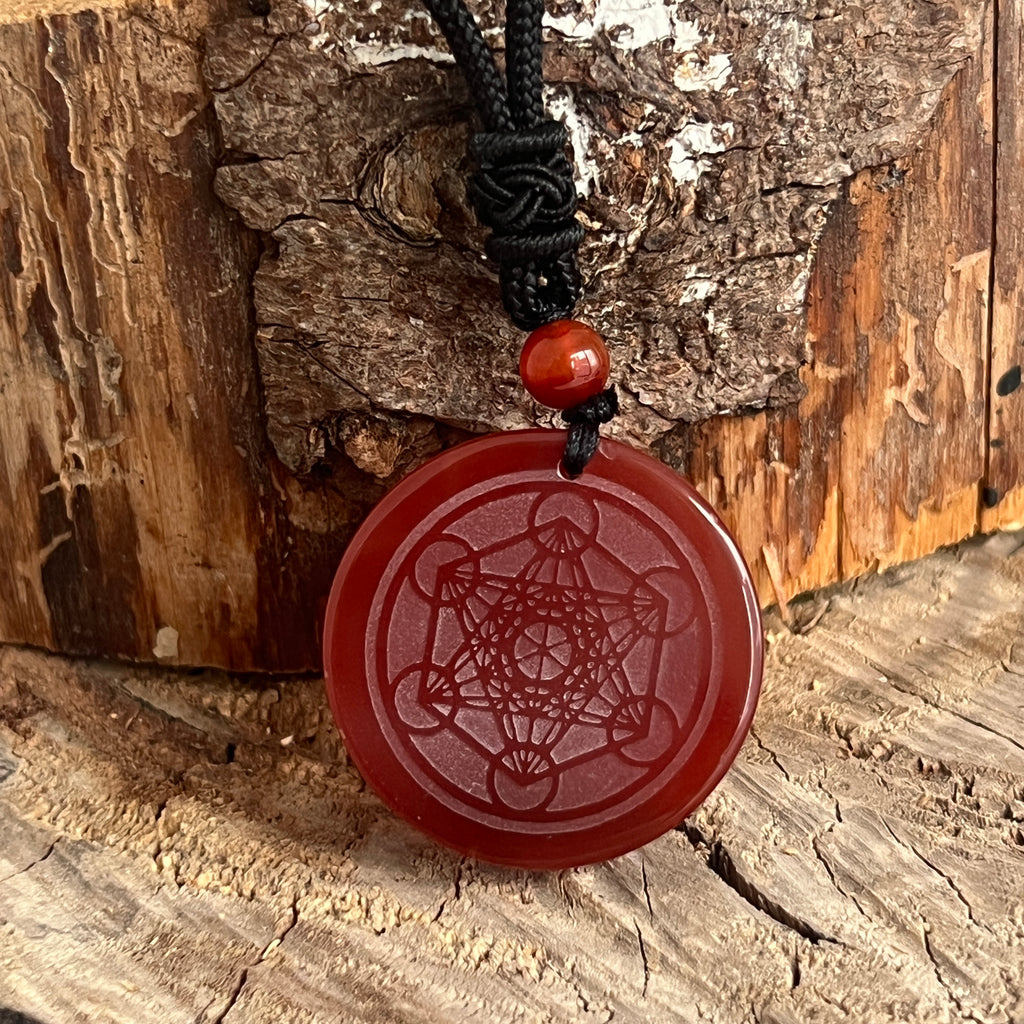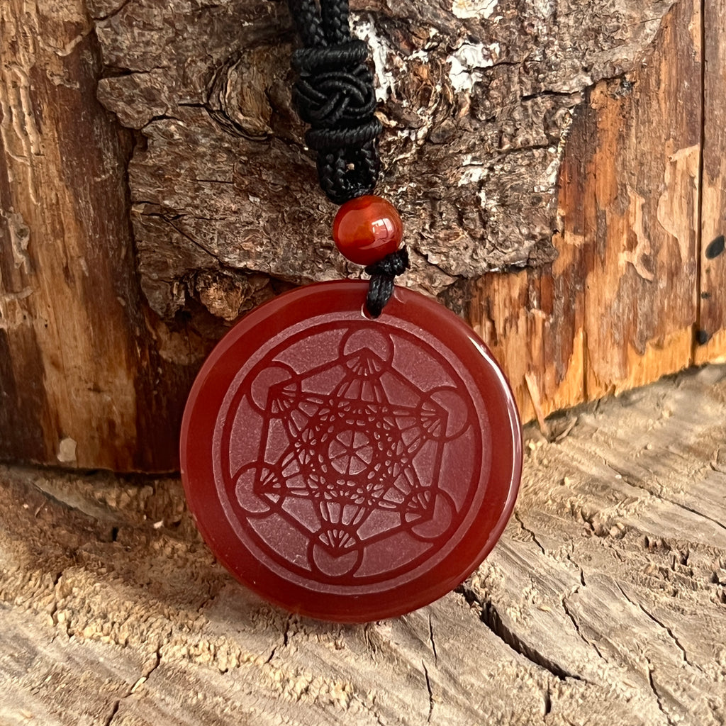 Carneolul este piatra vitalității, a curajului și a pasiunii. Cunoscut din Antichitate drept „piatra soarelui interior”, el aduce energie, motivație și claritate mentală. În combinație cu simbolul lui Metatron, acest pandantiv devine un talisman al echilibrului și al alinierii între planul material și cel spiritual.