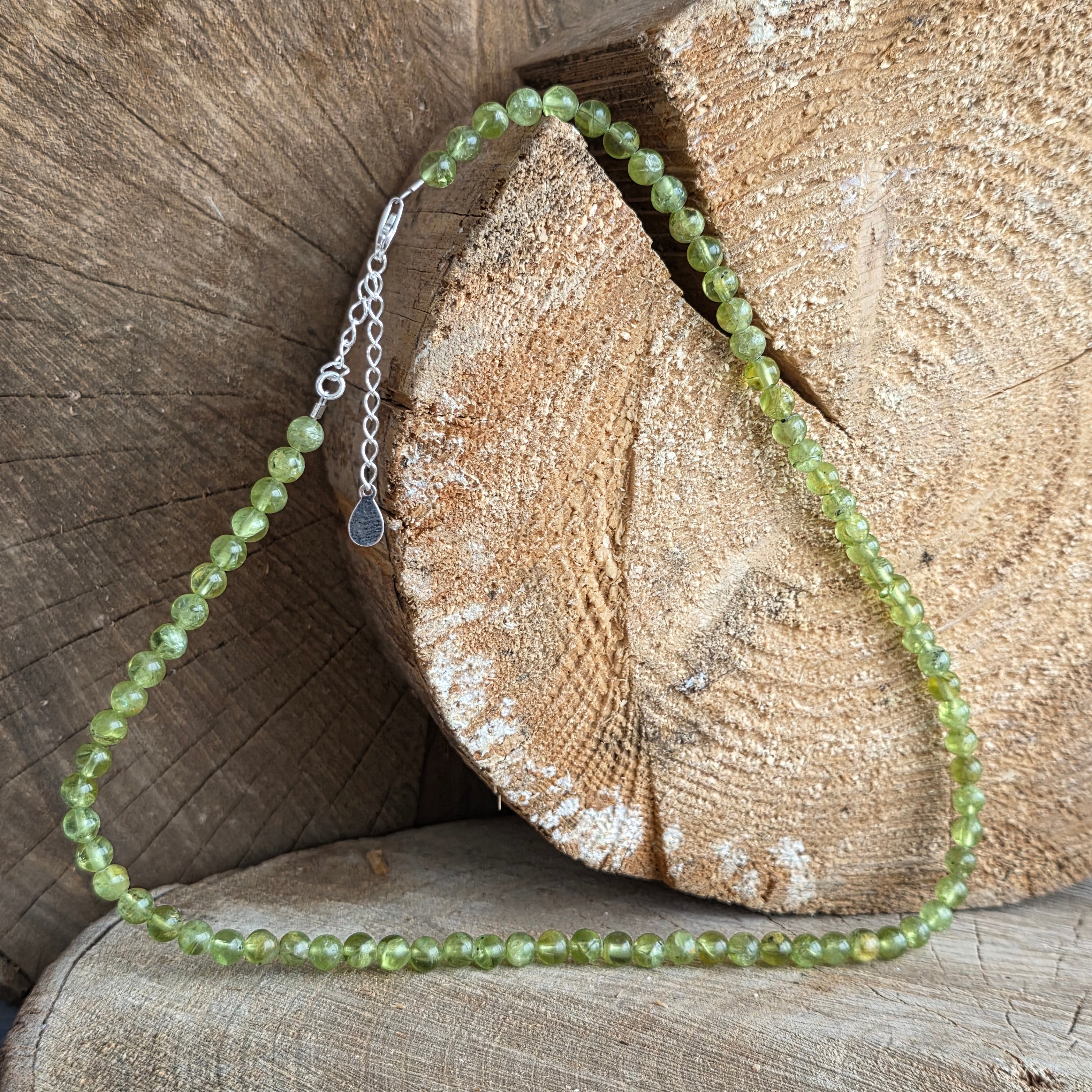 Un colier luminos și proaspăt, realizat din sfere de peridot de 5 mm, atent selecționate, cu o culoare verde intensă și clară, care pare să pulseze de viață. Fiecare sferă reflectă lumina cu o transparență caldă, evocând ideea de început nou, de respirație adâncă după o etapă încheiată. Designul este curat și echilibrat, lăsând piatra să fie centrul expresiei.