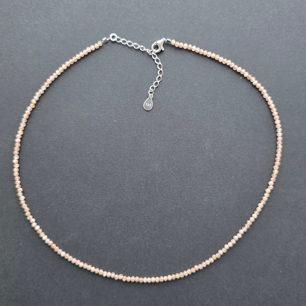 Un colier delicat ca o rază de lumină prinsă în mișcare. Piatra soarelui naturală fațetată de 2,5 mm emană o strălucire caldă, cu sclipiri fine de auriu și portocaliu, creând impresia unei pulberi de lumină purtate de vânt. Designul minimalist și rafinat îl face perfect pentru a fi purtat singur sau în combinații subtile cu alte coliere din argint.