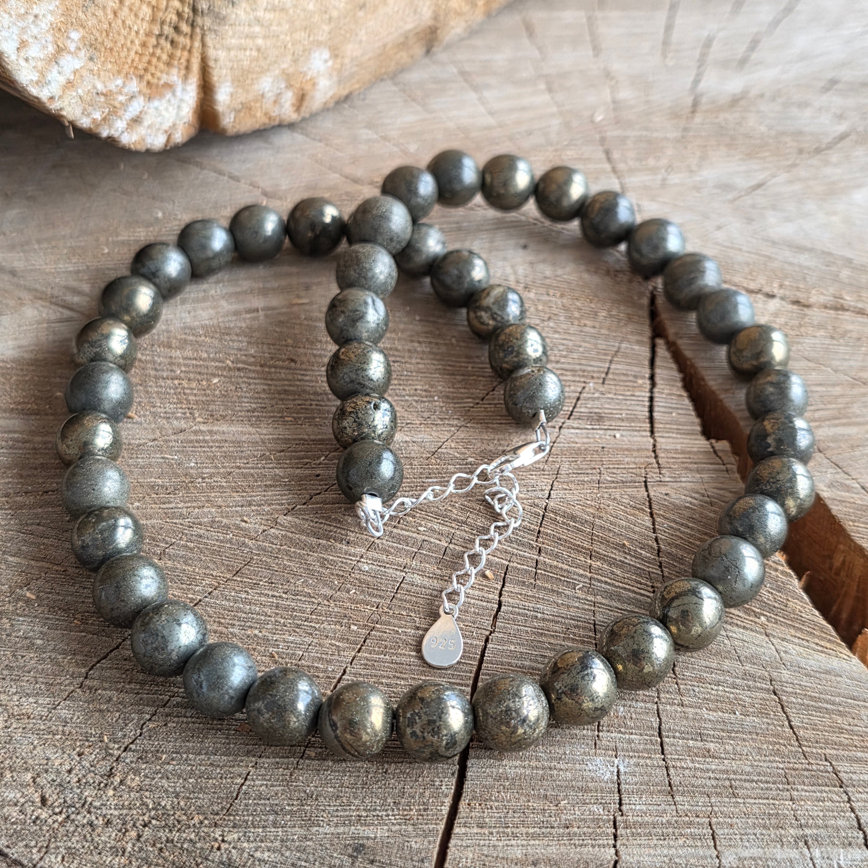 Un colier cu personalitate puternică și eleganță minerală, realizat din sfere de pirită de 8 mm, ale căror reflexii metalice captează lumina într-un joc subtil de auriu și grafit. Fiecare sferă are o strălucire proprie, ușor brută, amintind de structura cristalină a pietrei și de forța ei primordială. Este o bijuterie care nu are nevoie de ornamente suplimentare pentru a se face remarcată.