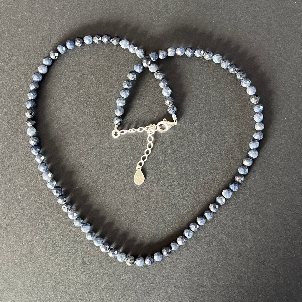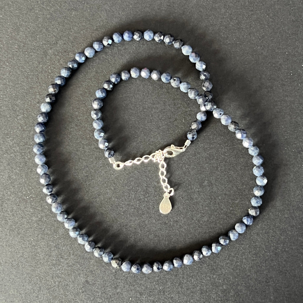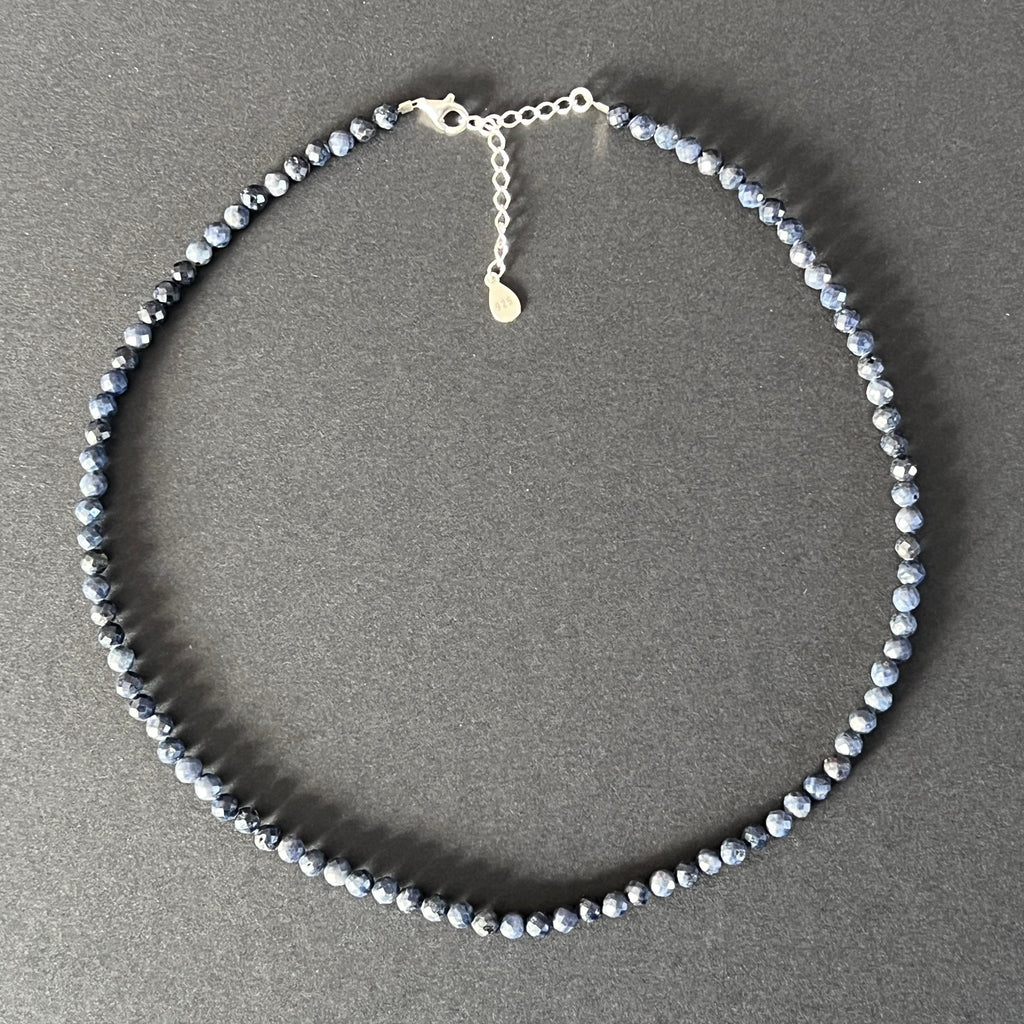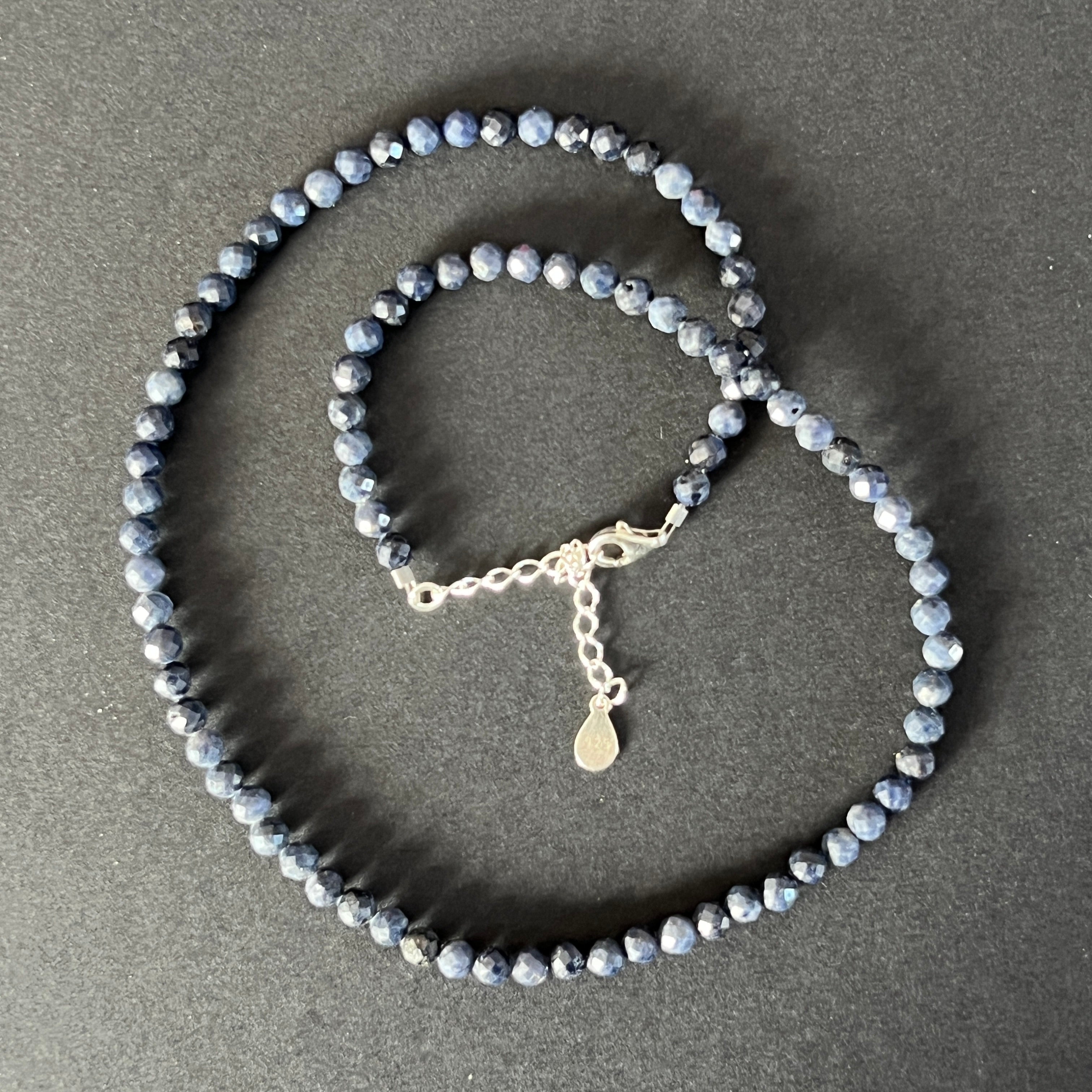 Un colier care aduce misterul nopții senine și profunzimea cerului albastru la gâtul tău. Mărgelele de safir natural fațetat de 4-5 mm poartă reflexele întunecate și intense ale pietrei prețioase asociate regalității și puterii lăuntrice.
