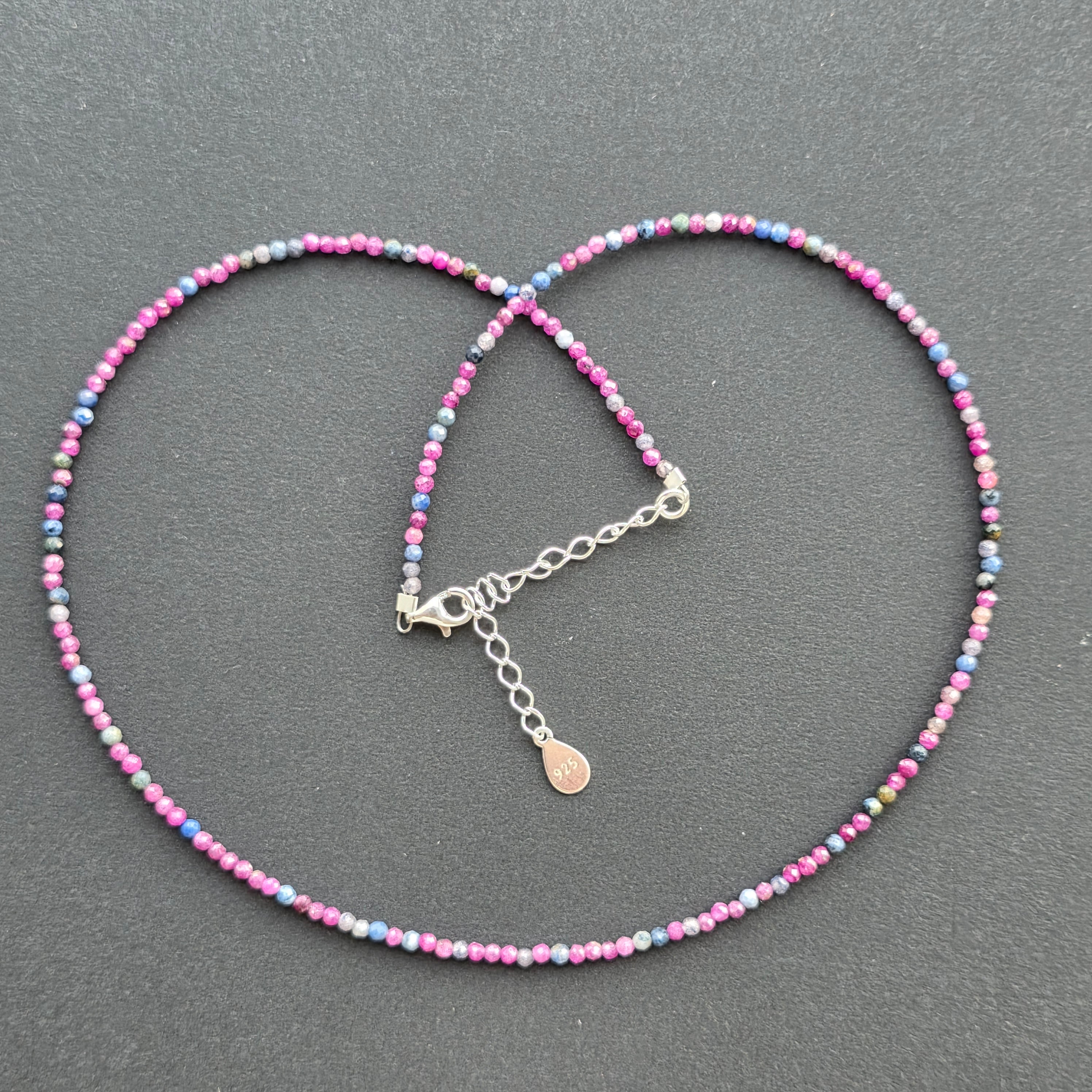 Un colier delicat, dar cu o forță subtilă, realizat din sfere fațetate de safir și rubin de 2.5 mm, împletite într-un joc armonios de contraste – albastrul înțelept al safirului și roșul pasional al rubinului. Cele două pietre prețioase alternează discret, într-o compoziție ce vorbește despre echilibru, rafinament și profunzime.