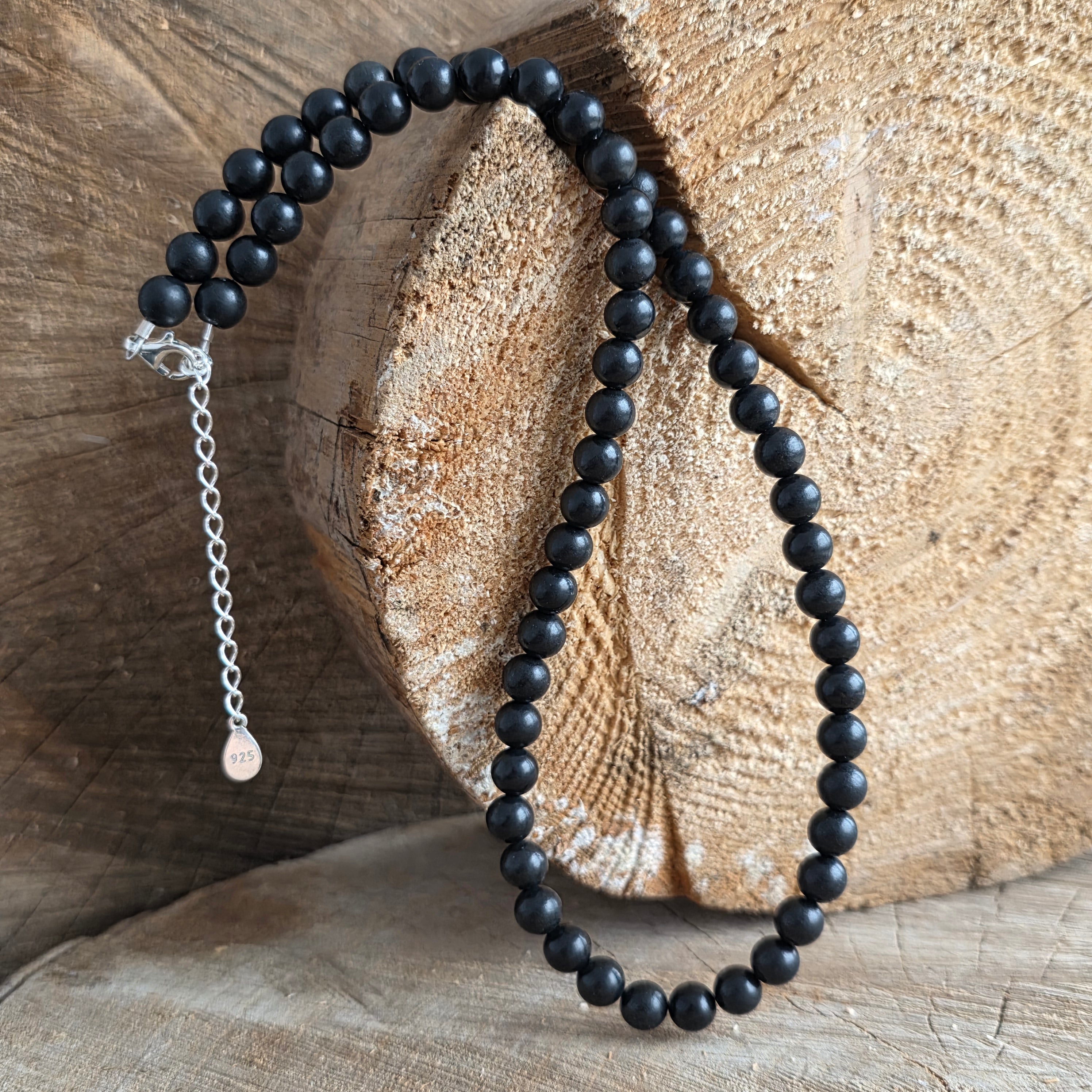 Eine Halskette, die den Hals wie ein schützender Schatten umarmt - raffiniert, nüchtern und tief. Die Halskette besteht aus 6 mm Kugeln natürlicher Shungit und strahlt subtil in Tönen von intensivem Schwarz, wie in der Nacht, die sich nicht versteckt, sondern beruhigt.