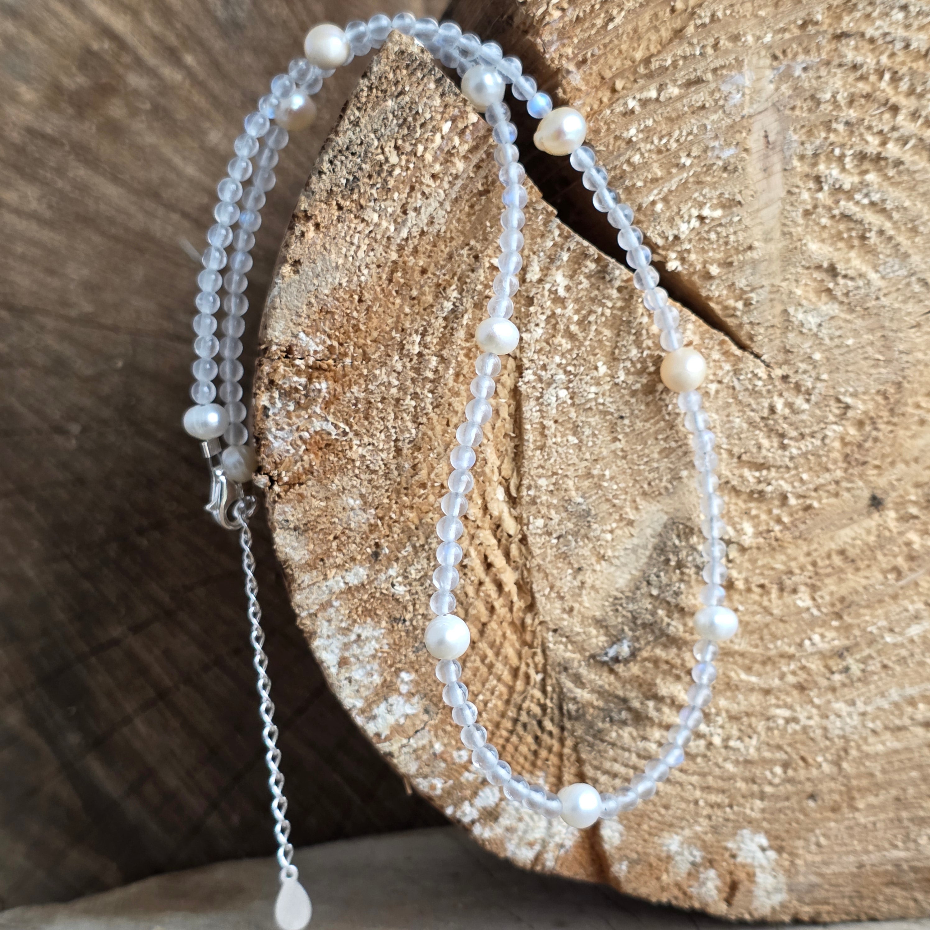 Die kleinen, 3 mm großen Mondsteinperlen schaffen einen feinen, seidigen Rhythmus mit blauen und silbernen Schimmern, die im Licht dezent erscheinen, wie ein leises Atemholen zwischen Himmel und Haut.