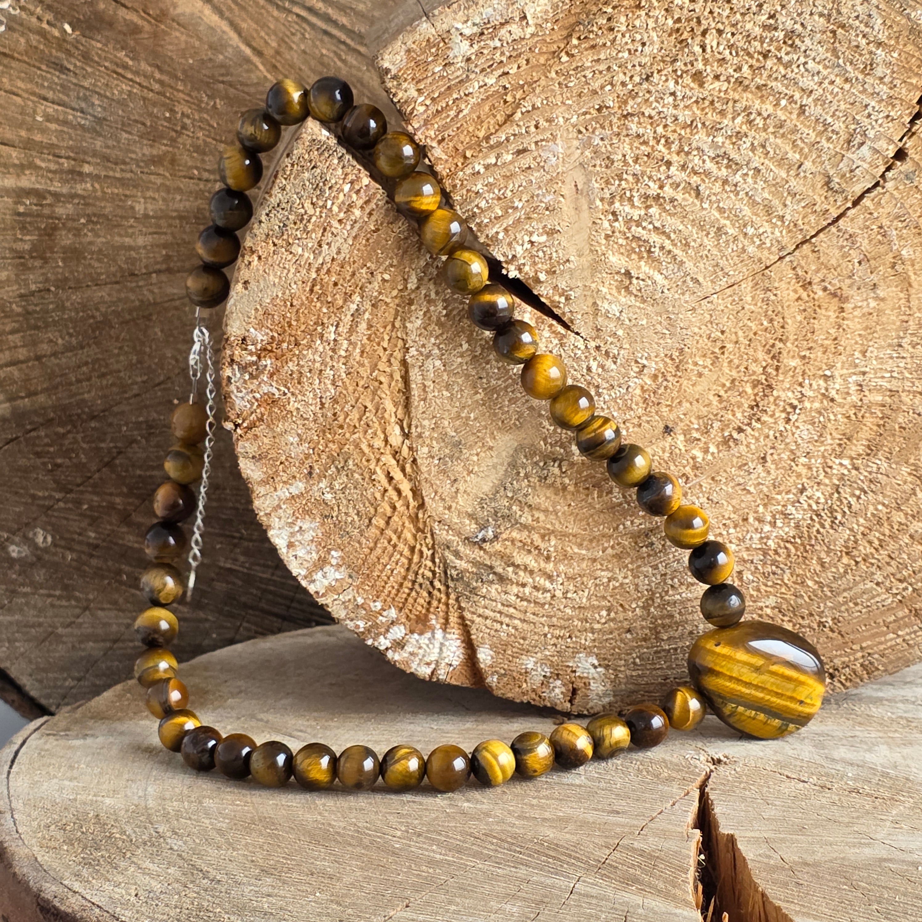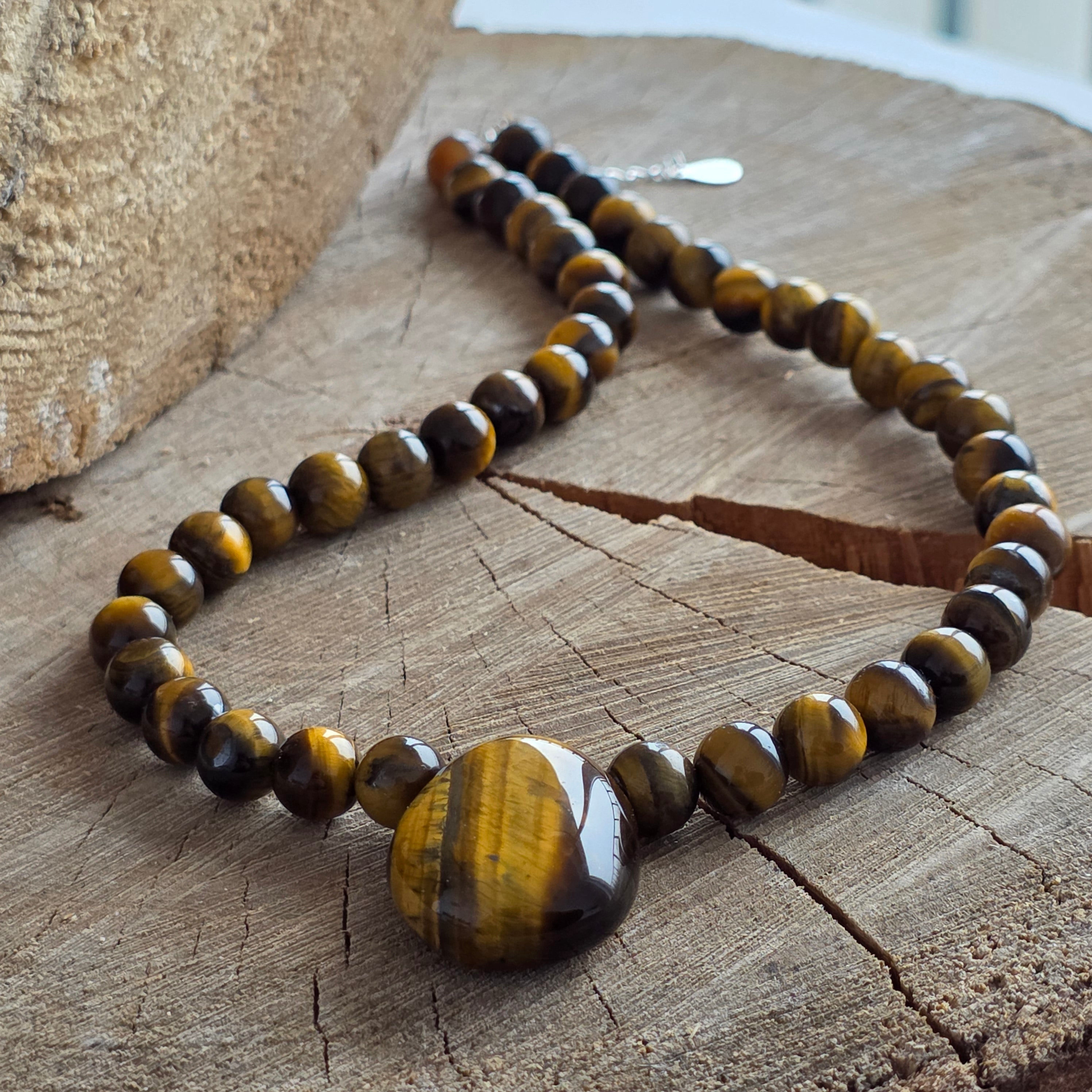 Eine Halskette mit warmen Leuchten und angestammten Schutz - erzeugt aus 8 mm Tigeraugenkugeln mit goldenen und bräunlichen Farben, die wie Sonnenstrahlen durch den Wald tanzen. Jeder Stein scheint stille Kraft, Stabilität und wachsame Instinkt zu atmen.