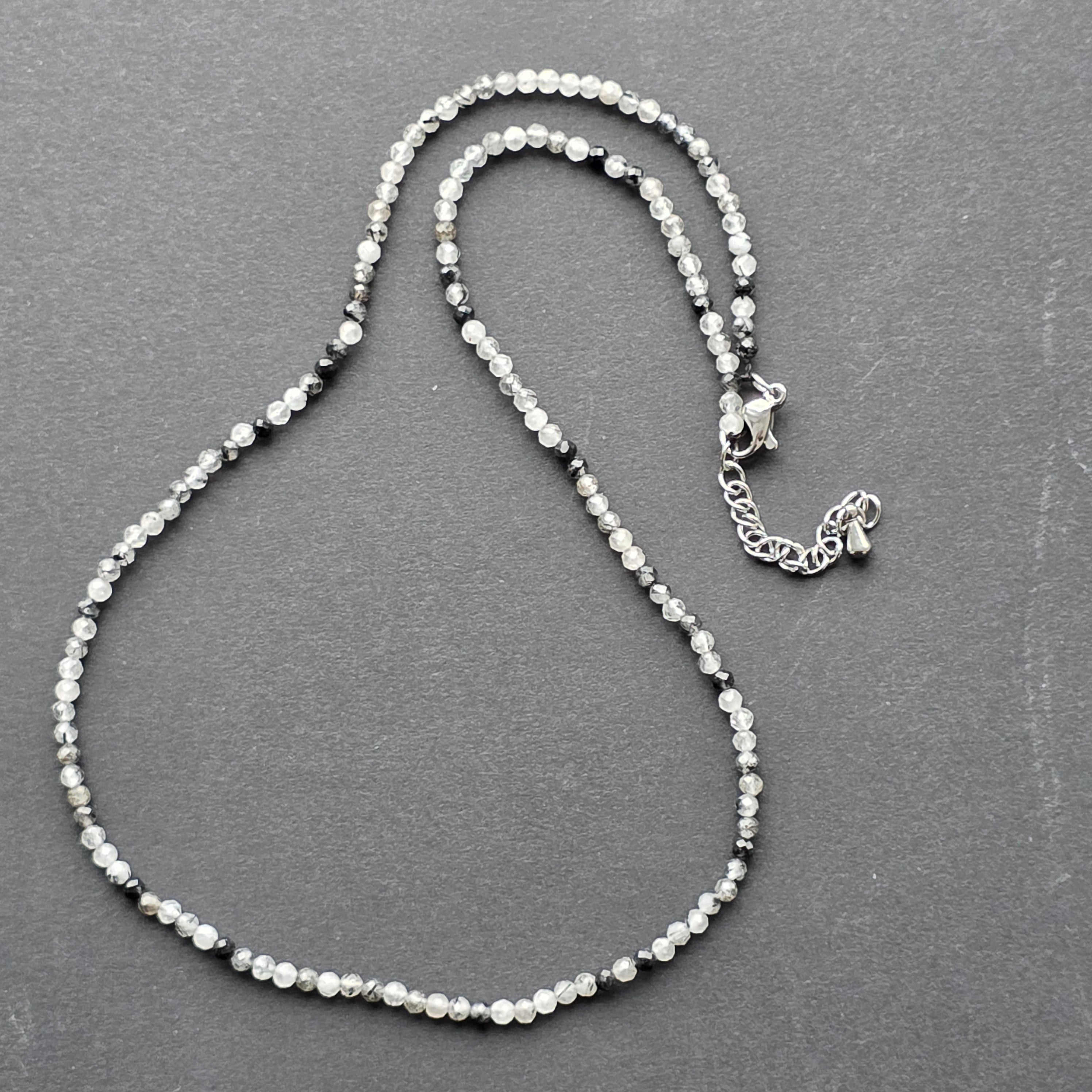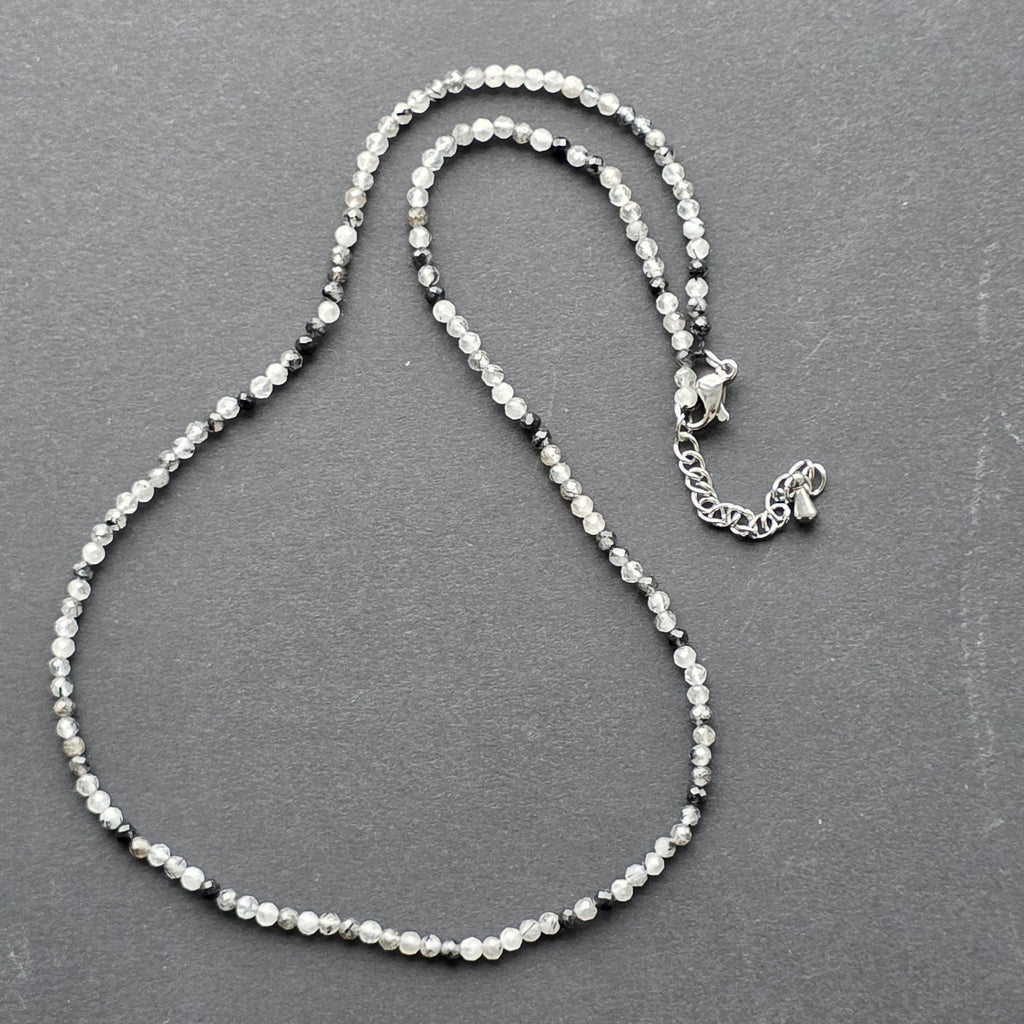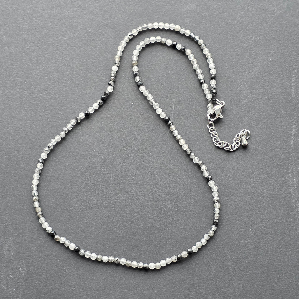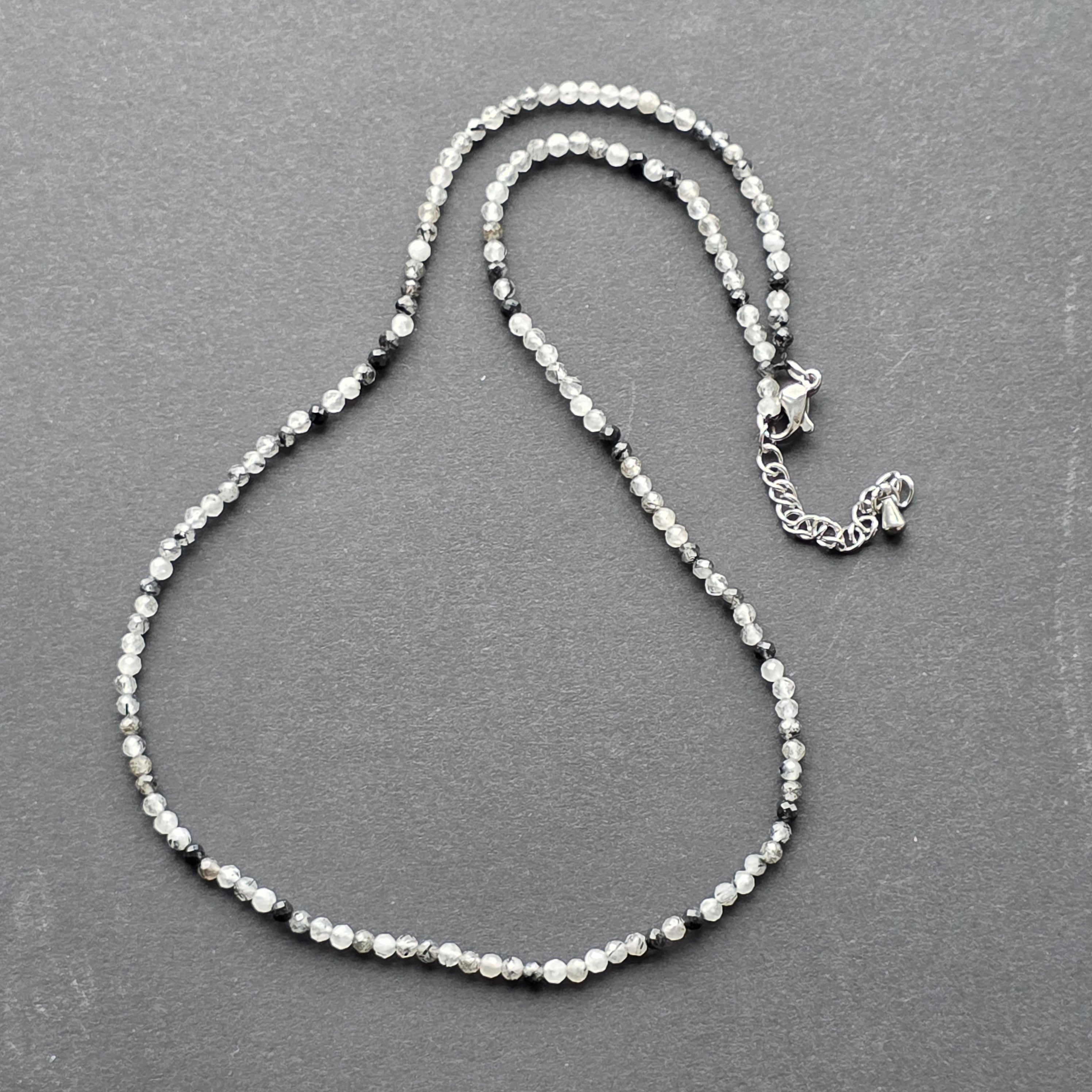 Un colier delicat și elegant, realizat din turmalină în cuart naturală – o combinație fascinantă între claritatea cristalină a cuartului și striațiile fine de turmalină neagră. Fiecare sferă fațetată reflectă lumina în accente discrete, creând o textură vizuală rafinată, cu contrast subtil între transparent și întunecat. Este o piesă modernă, ușor de asortat, perfectă atât pentru ținute minimaliste, cât și pentru un look sofisticat.