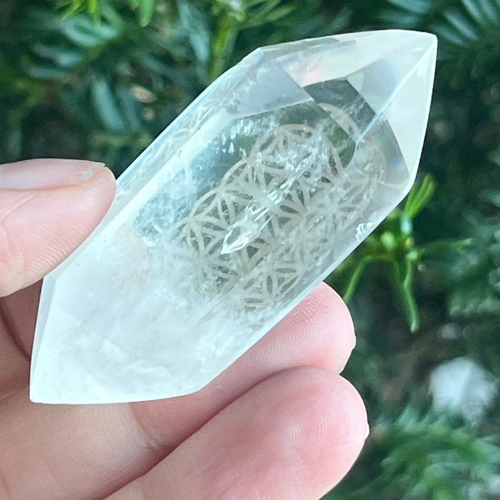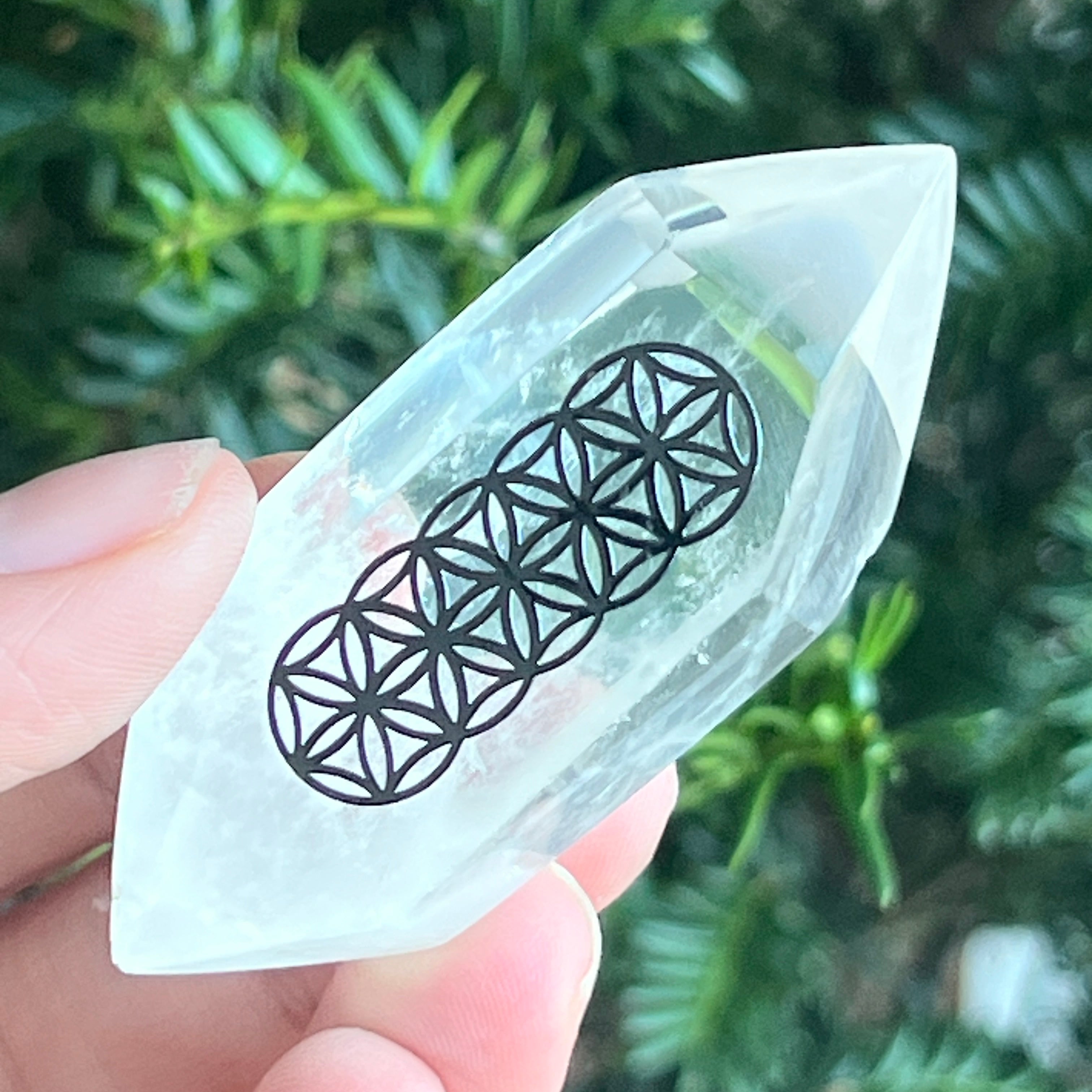 Piatra cu dublu vârf din cuart incolor gravată cu Floarea Vieții / Flower of Life este ideală pentru: