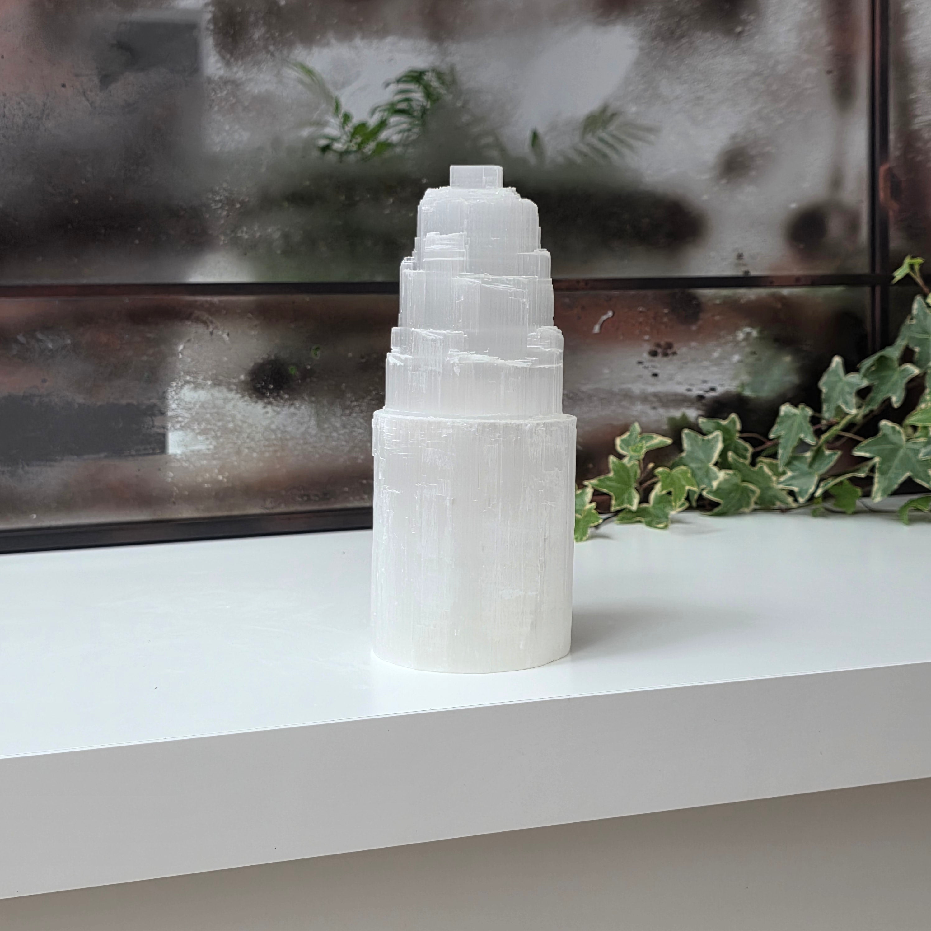 Dieser Turmkerzenhalter aus natürlichem Selenit verleiht jedem Raum einen Hauch von Magie und Licht. Selenit gilt als Stein der Reinheit und des inneren Friedens.