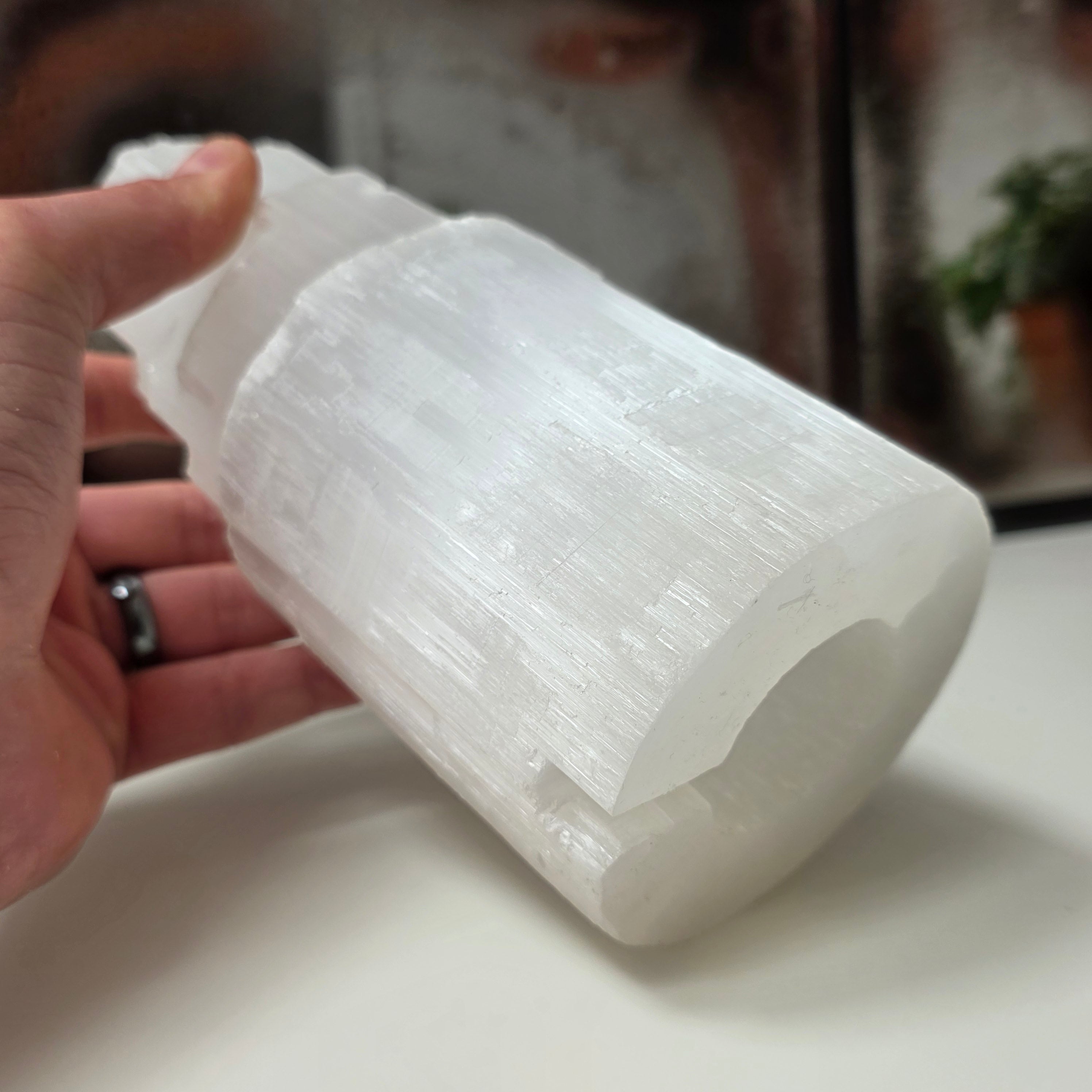 Wählen Sie den Selenit-Kerzenhalter, um reinigende Energie und eine Atmosphäre voller Harmonie in Ihren Raum zu bringen 🌙✨.