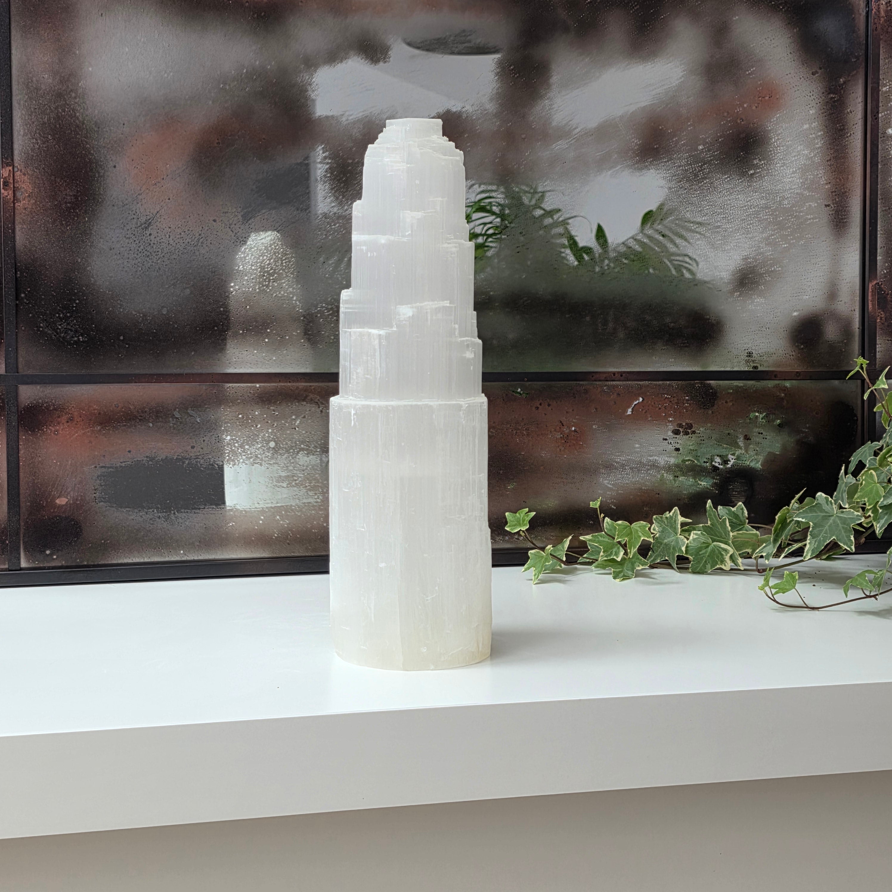 Dieser Turmkerzenhalter aus natürlichem Selenit verleiht jedem Raum einen Hauch von Magie und Licht. Selenit gilt als Stein der Reinheit und des inneren Friedens.
