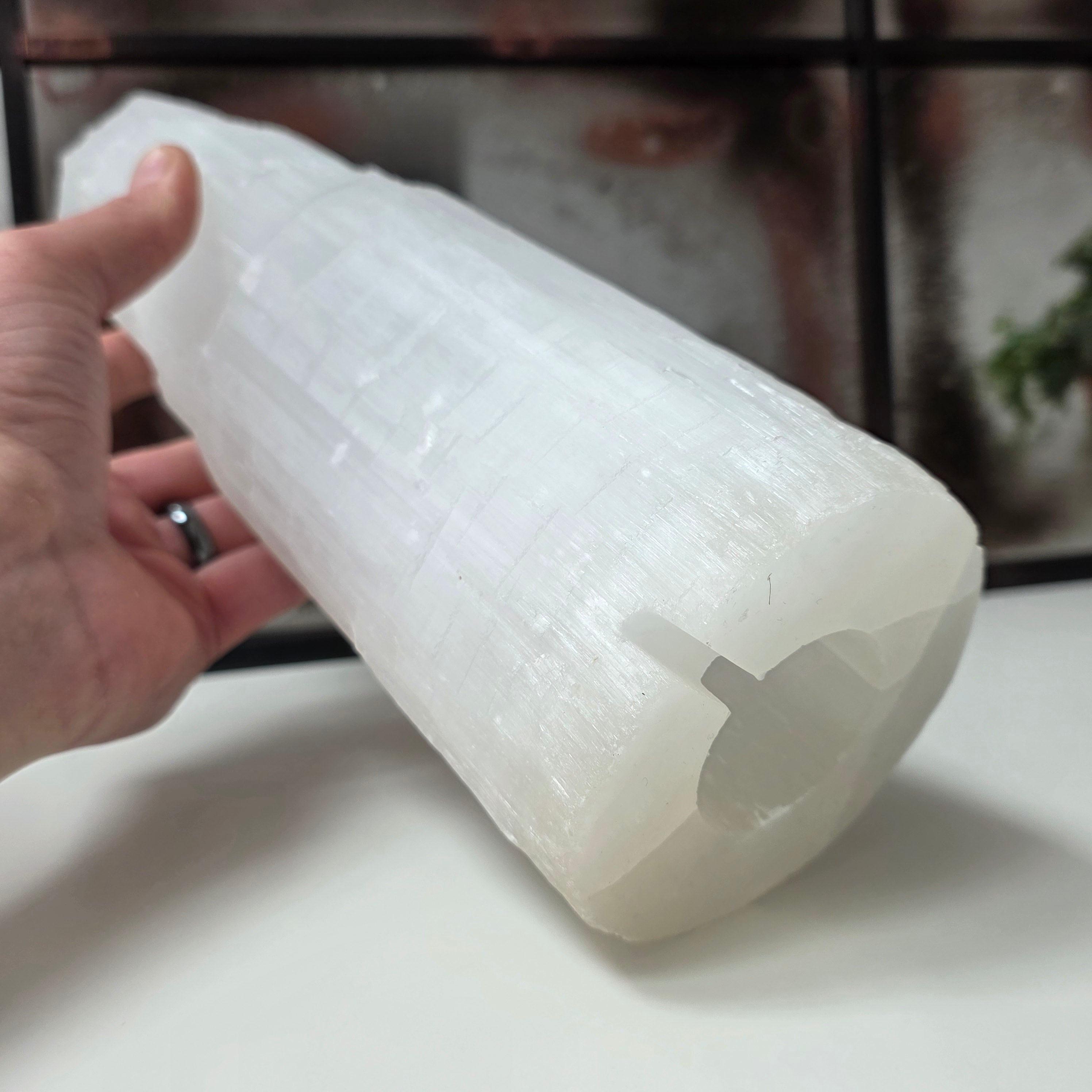Wählen Sie den Selenit-Kerzenhalter, um reinigende Energie und eine Atmosphäre voller Harmonie in Ihren Raum zu bringen 🌙✨.