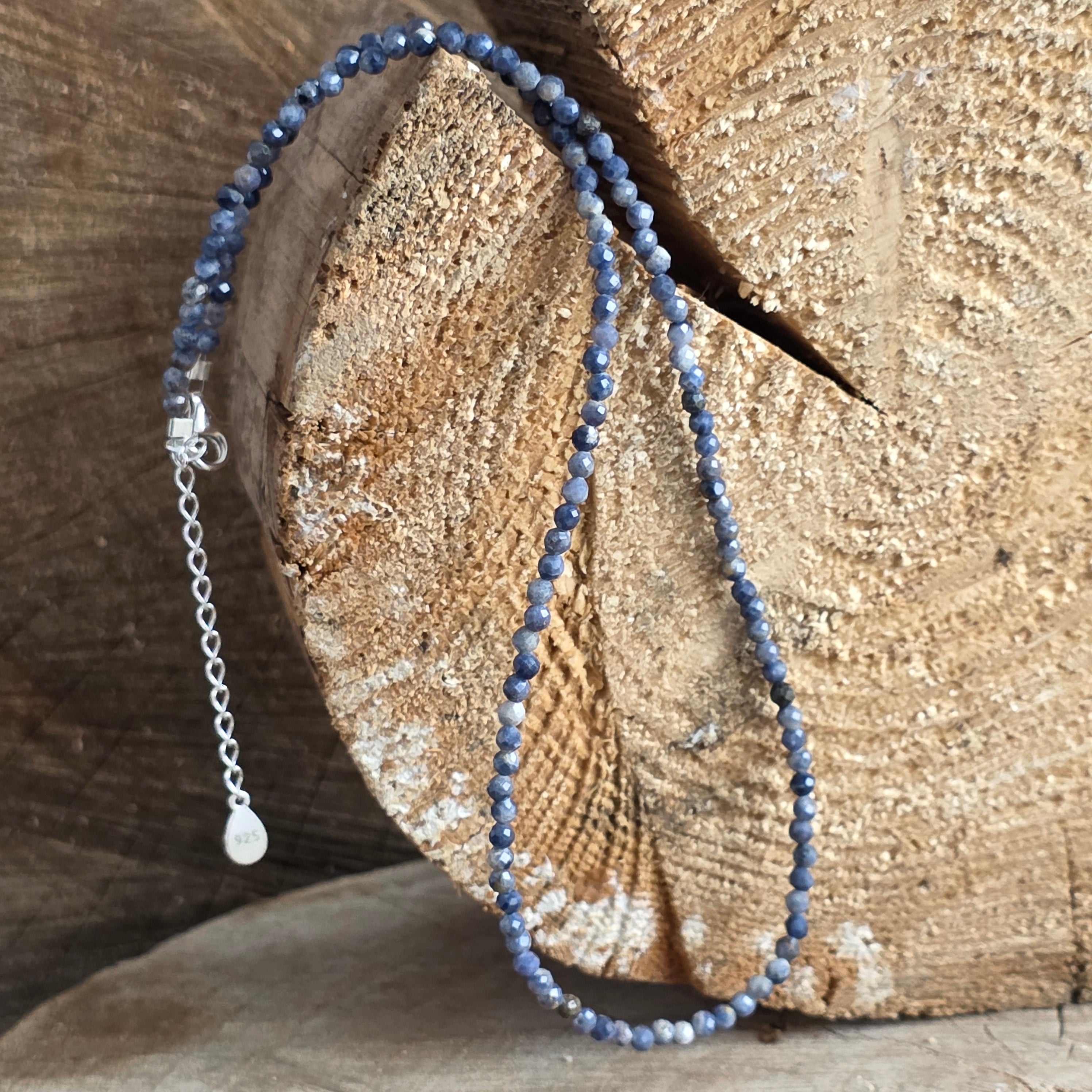 Eine Halskette von o stille Eleganz, erstellt von 3 mm -hergestellter natürlicher Saphir, dessen tiefe Blautöne das Geheimnis der ruhigen Nächte und des inneren Friedens behalten.