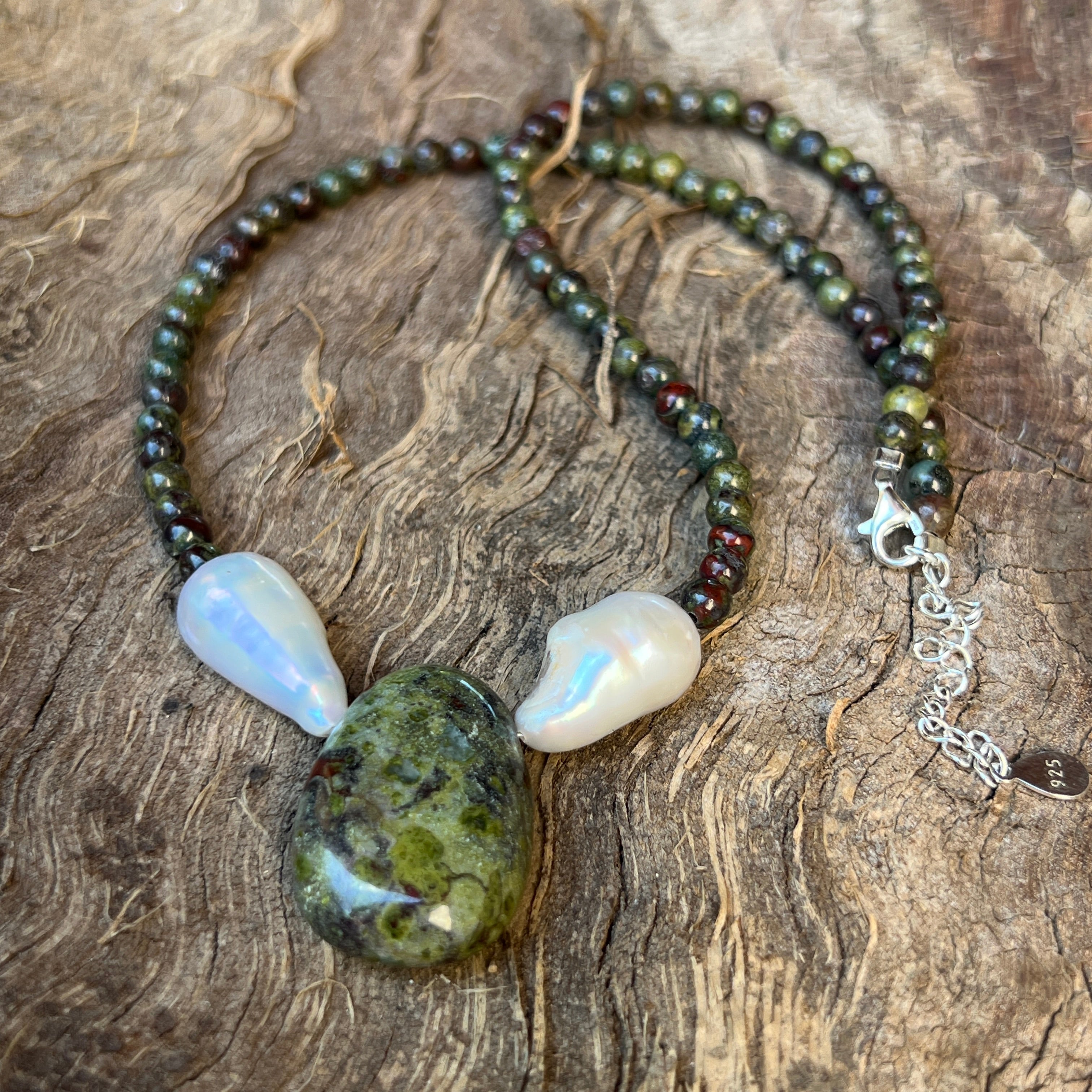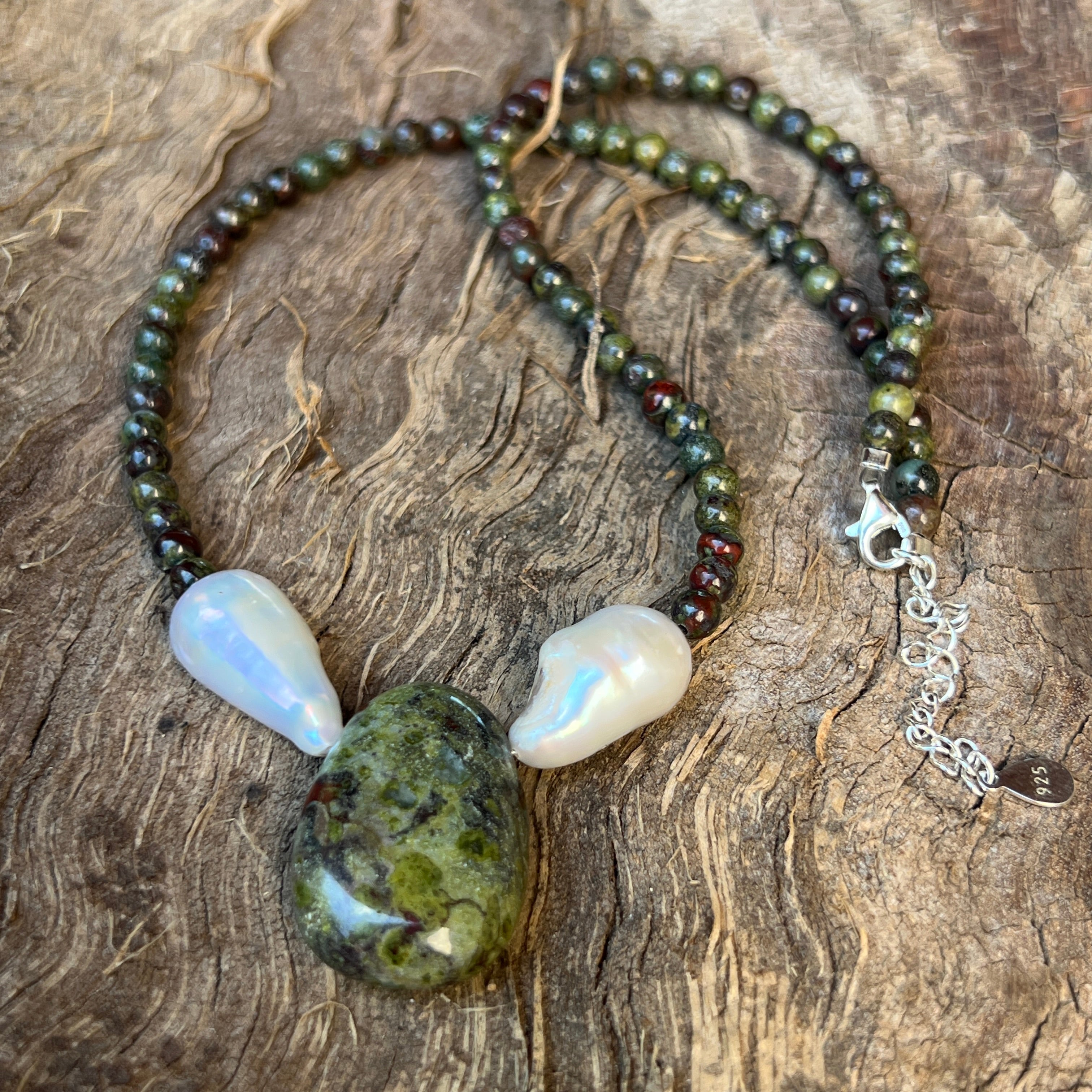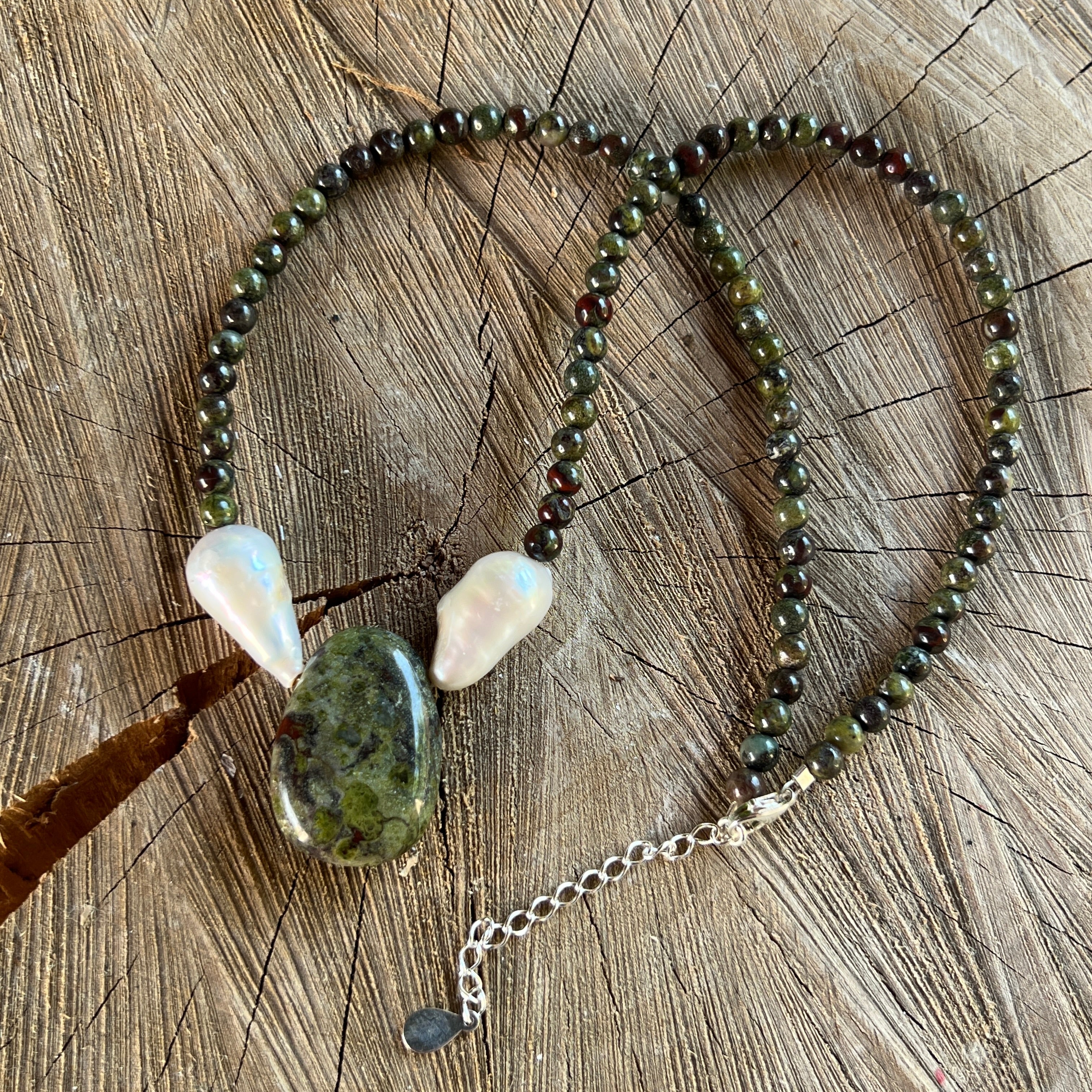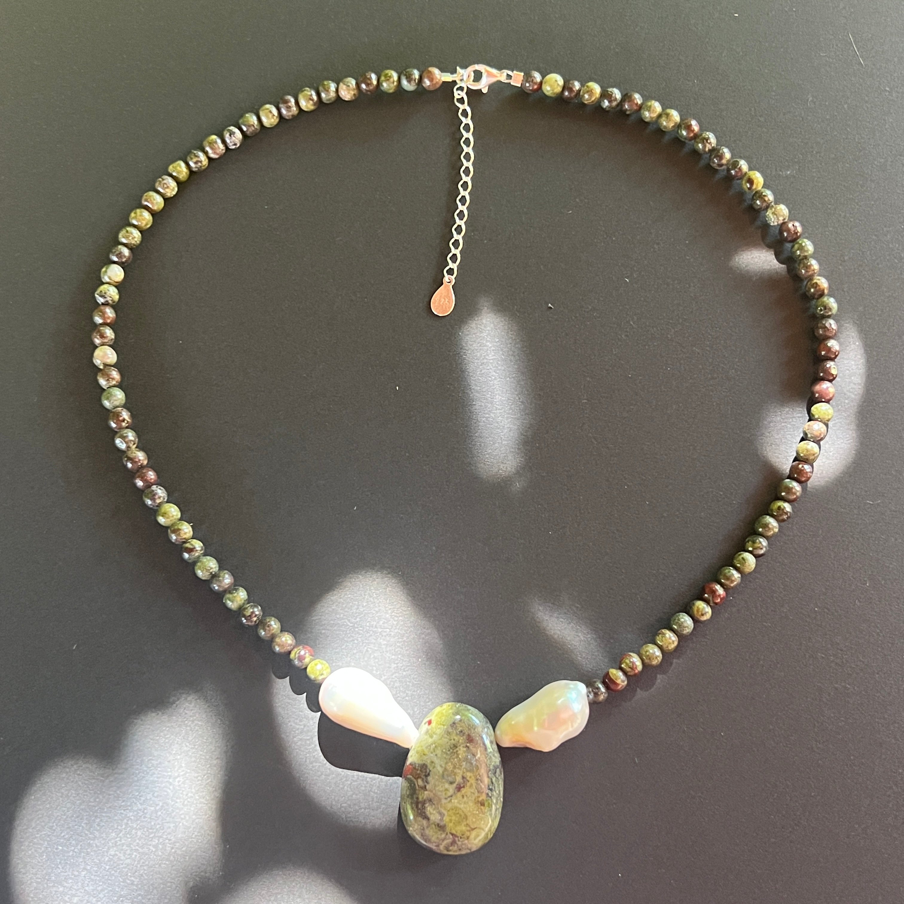 Eine Halskette mit tiefen, irdischen Vibrationskette, die die lebenswichtige Kraft des Lebens und die Eleganz des Gleichgewichts trägt. Die JASP -Perlen des 4 -mm -Blutsteins - dunkelgrün mit diskreten roten Einsätzen - erzeugen einen starken, schützenden Draht wie eine Energiewirbelsäule.
