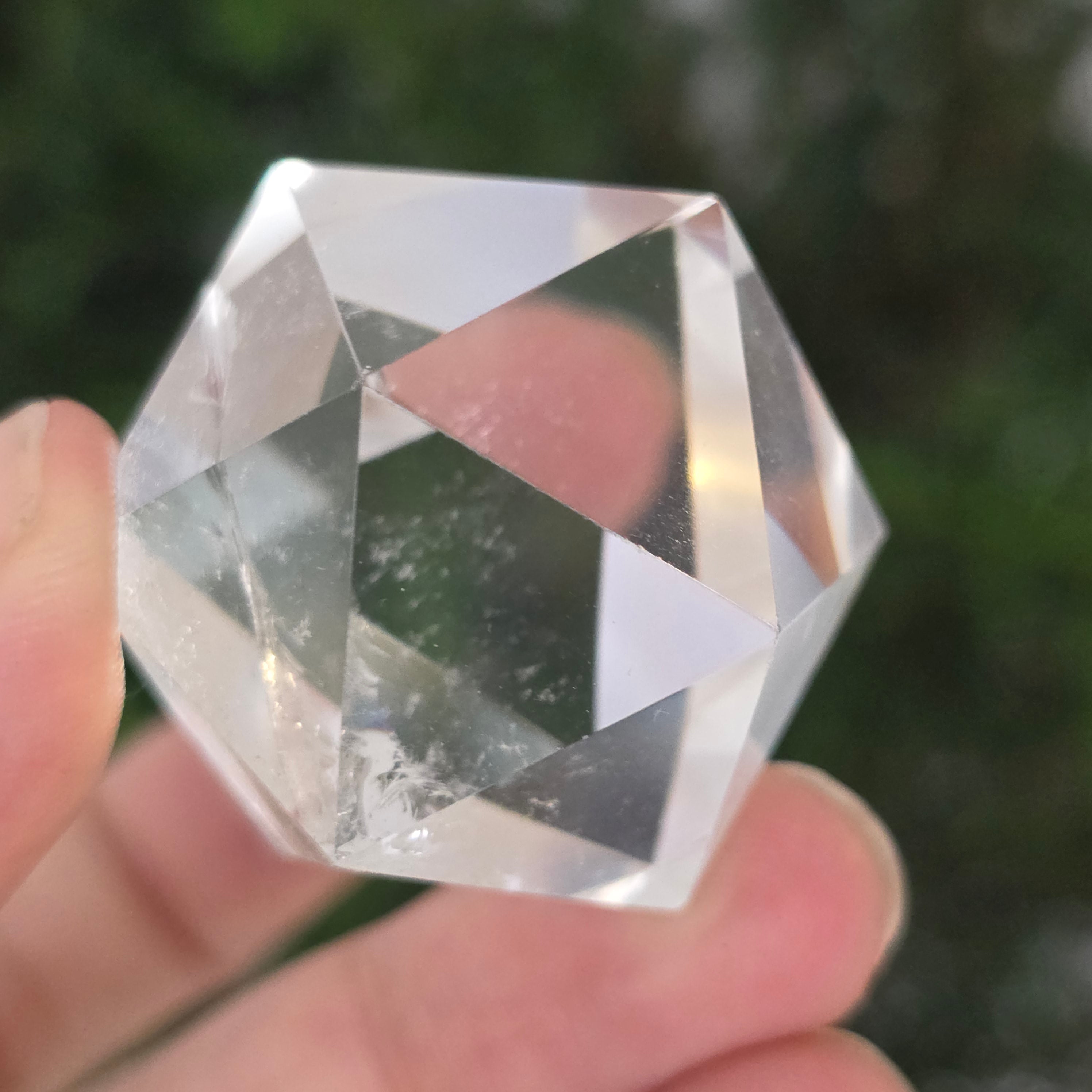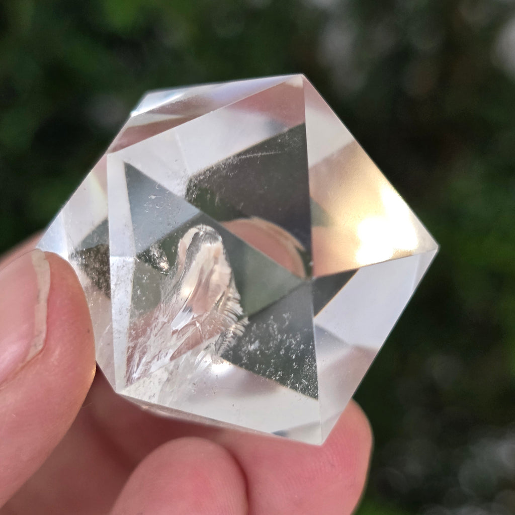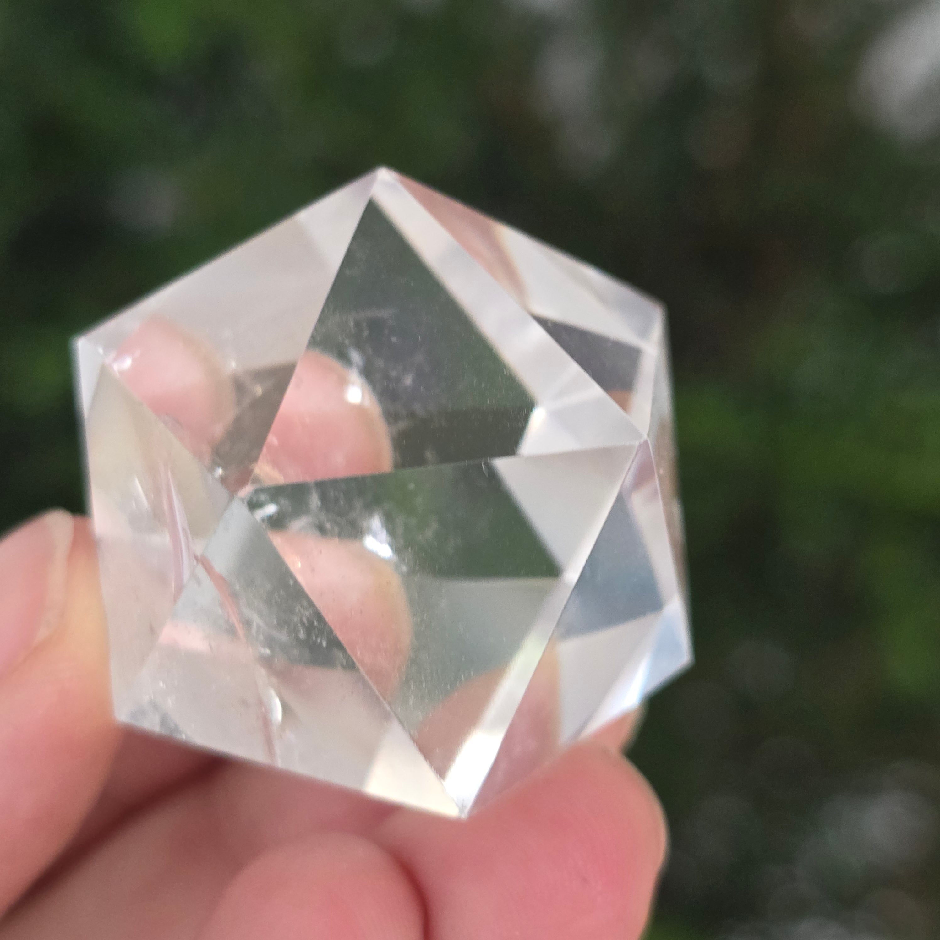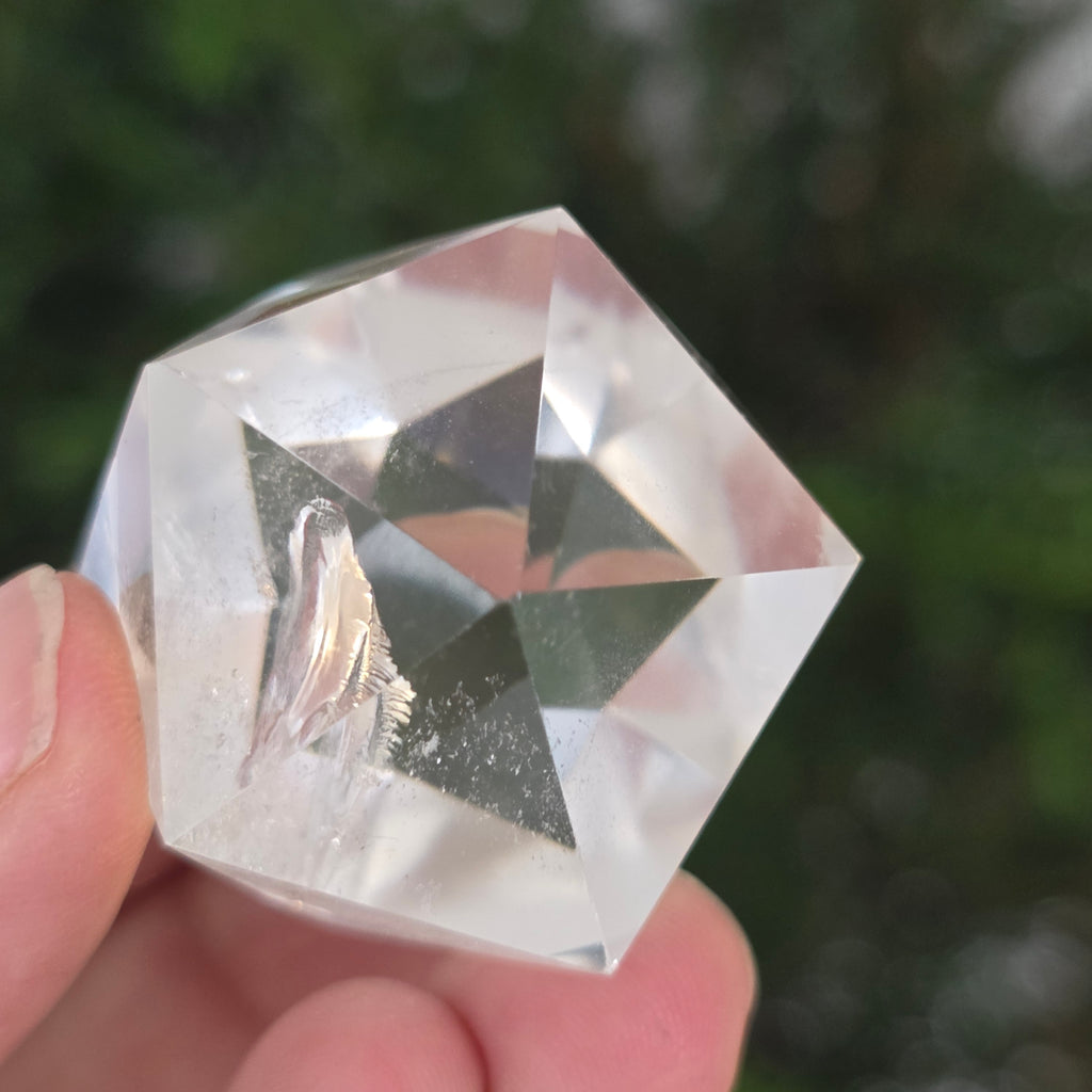 Farbloser Quarz-Ikosaeder (Bergkristall), präzisionspoliert in Form eines platonischen Körpers mit 20 gleichseitigen dreieckigen Flächen.
